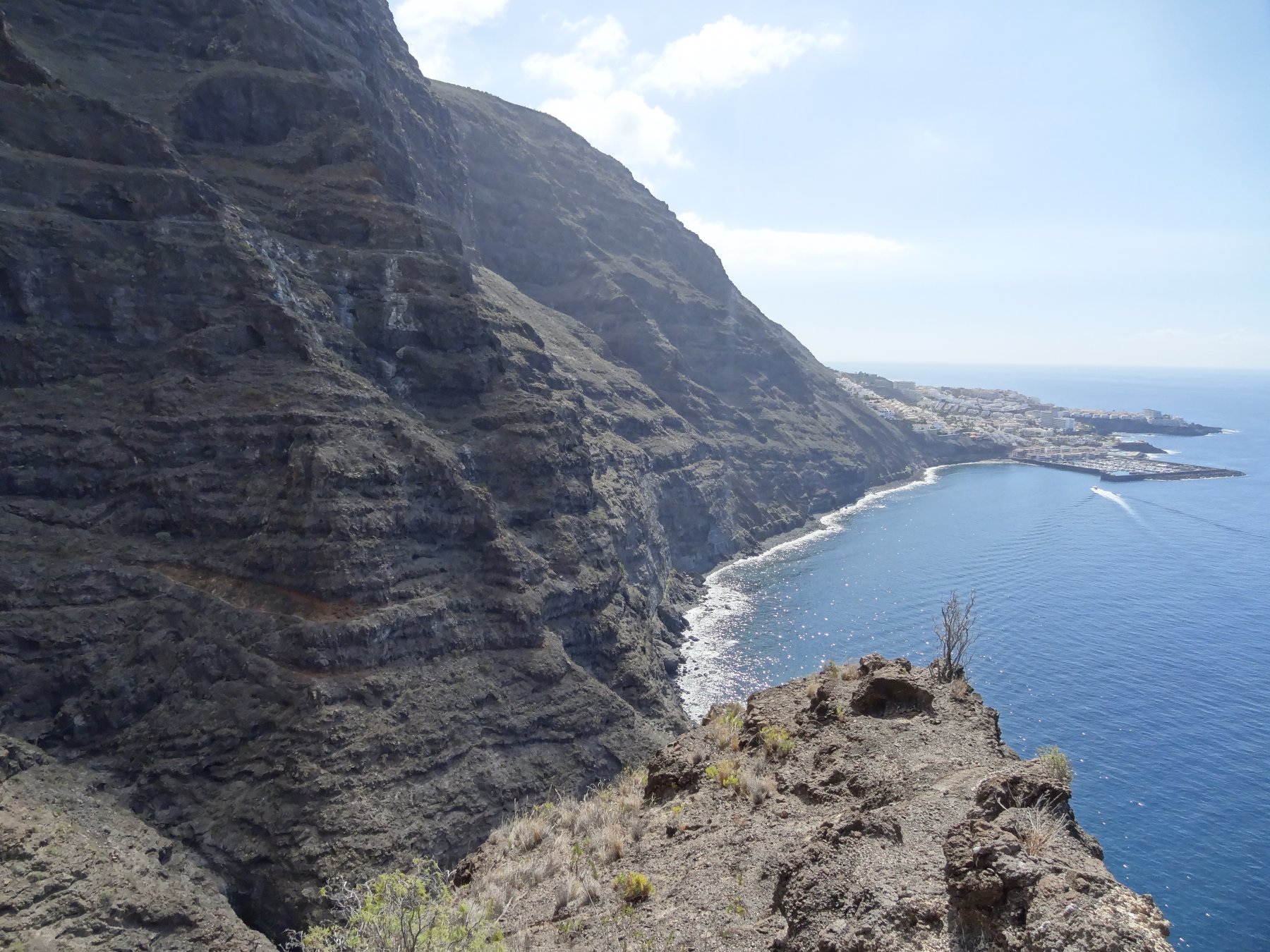 Io comunque torno sul percorso originario ed entro in galleria. Nella galleria scorre dell’acqua ma non so se sia il caso di berla.Dopo la galleria scendo senza problemi alla spiaggia di sassi (Playa Barranco Seco). Non cè anima viva, se non una barca a vela ferma nella baia. Tento un bagno (d’obbligo), ma è troppo pericoloso a causa delle onde. Quindi decido di tornare sui miei passi, velocemente, visto che è pomeriggio e non so cosa troverò più in alto.