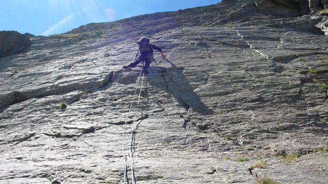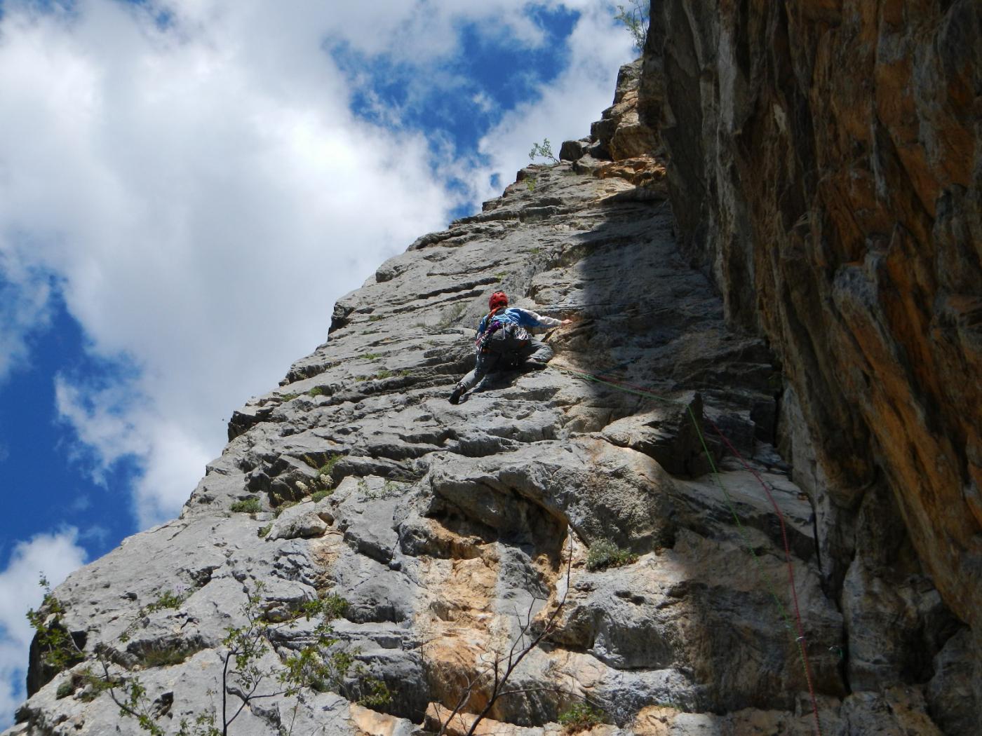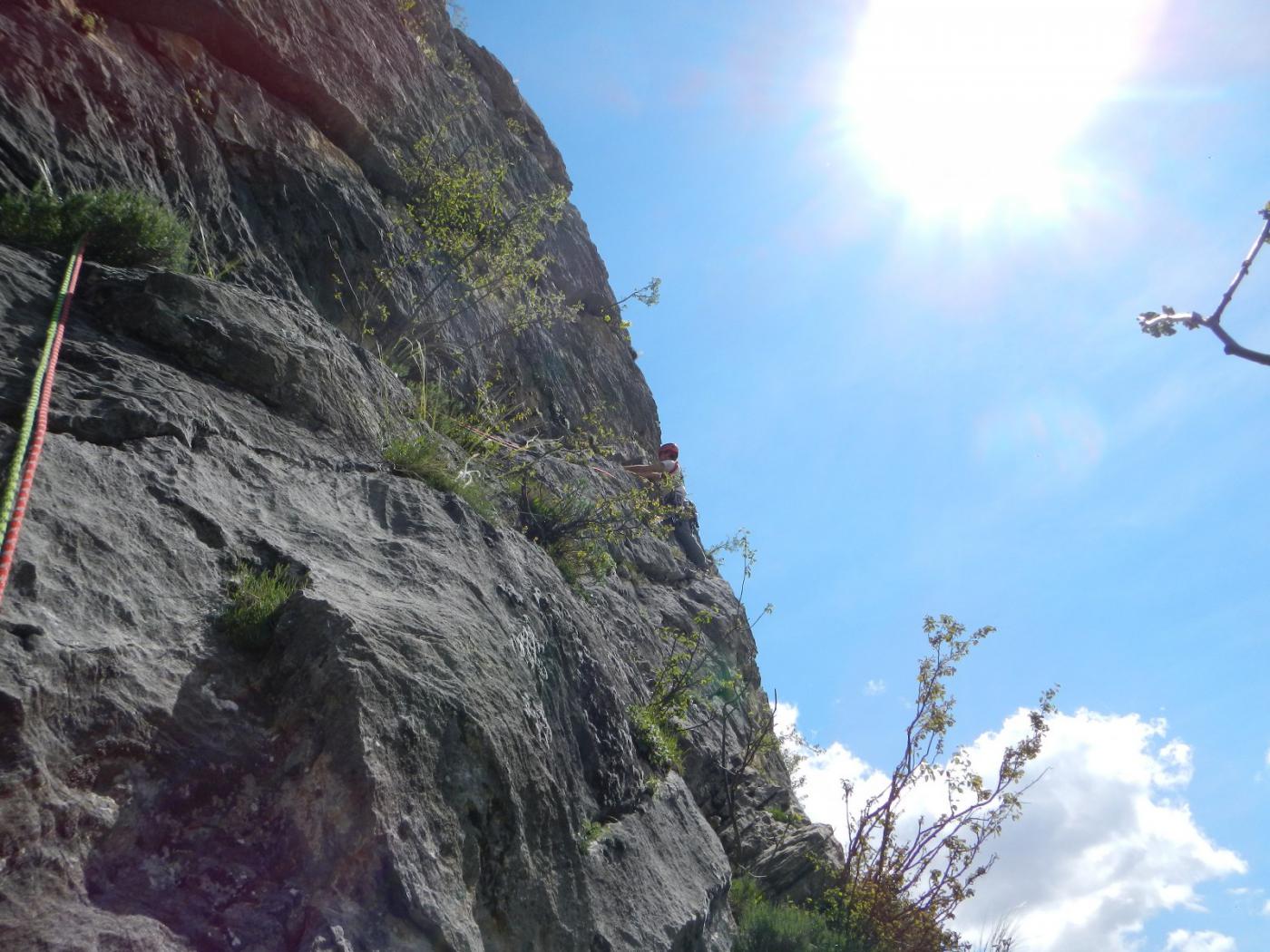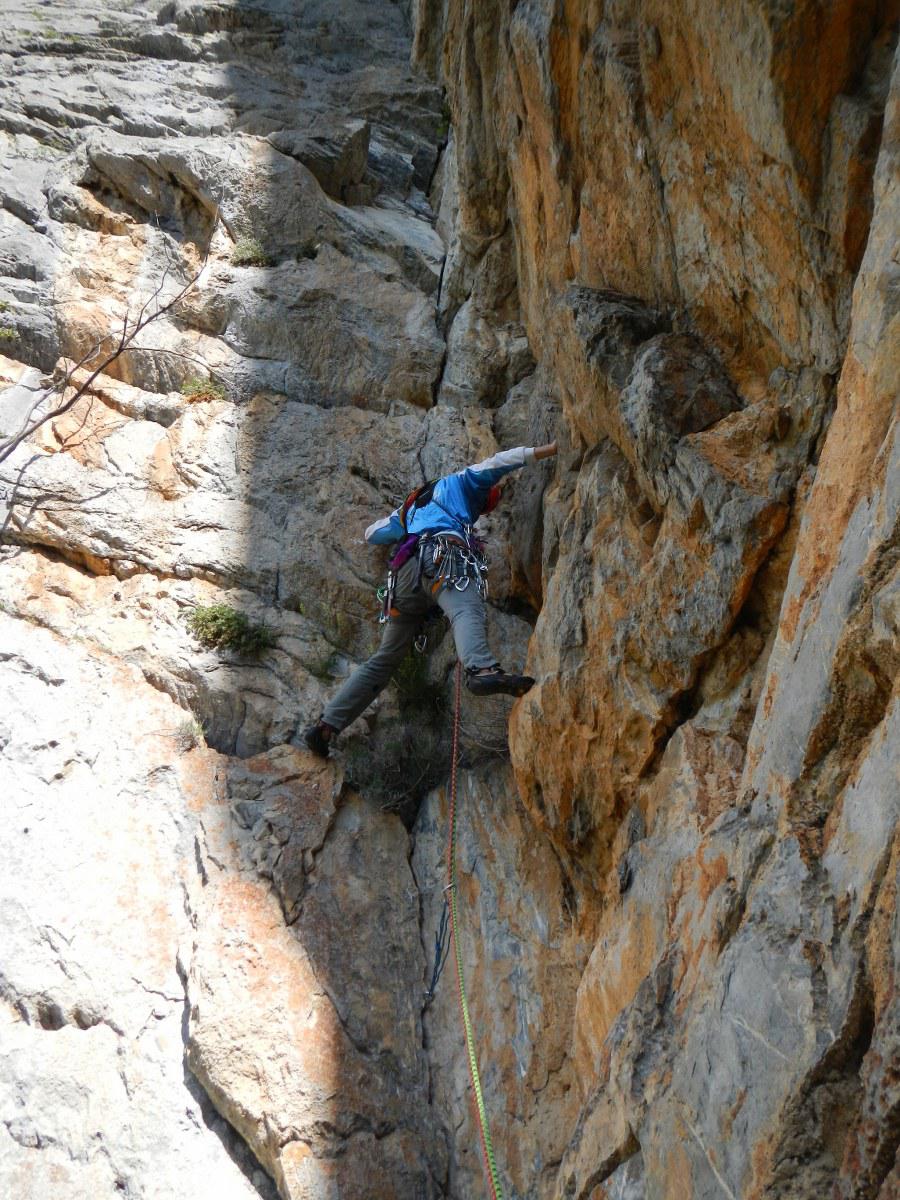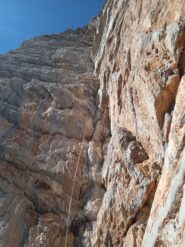 - L3: Seguire la larga fessura obliqua a sx e la successiva rampetta fino a raggiungere una serie di blocchi incastrati. Superarli e raggiungere una cengetta. Una breve placca verticale conduce ad una zona di erbe e roccette. (V 45mt).