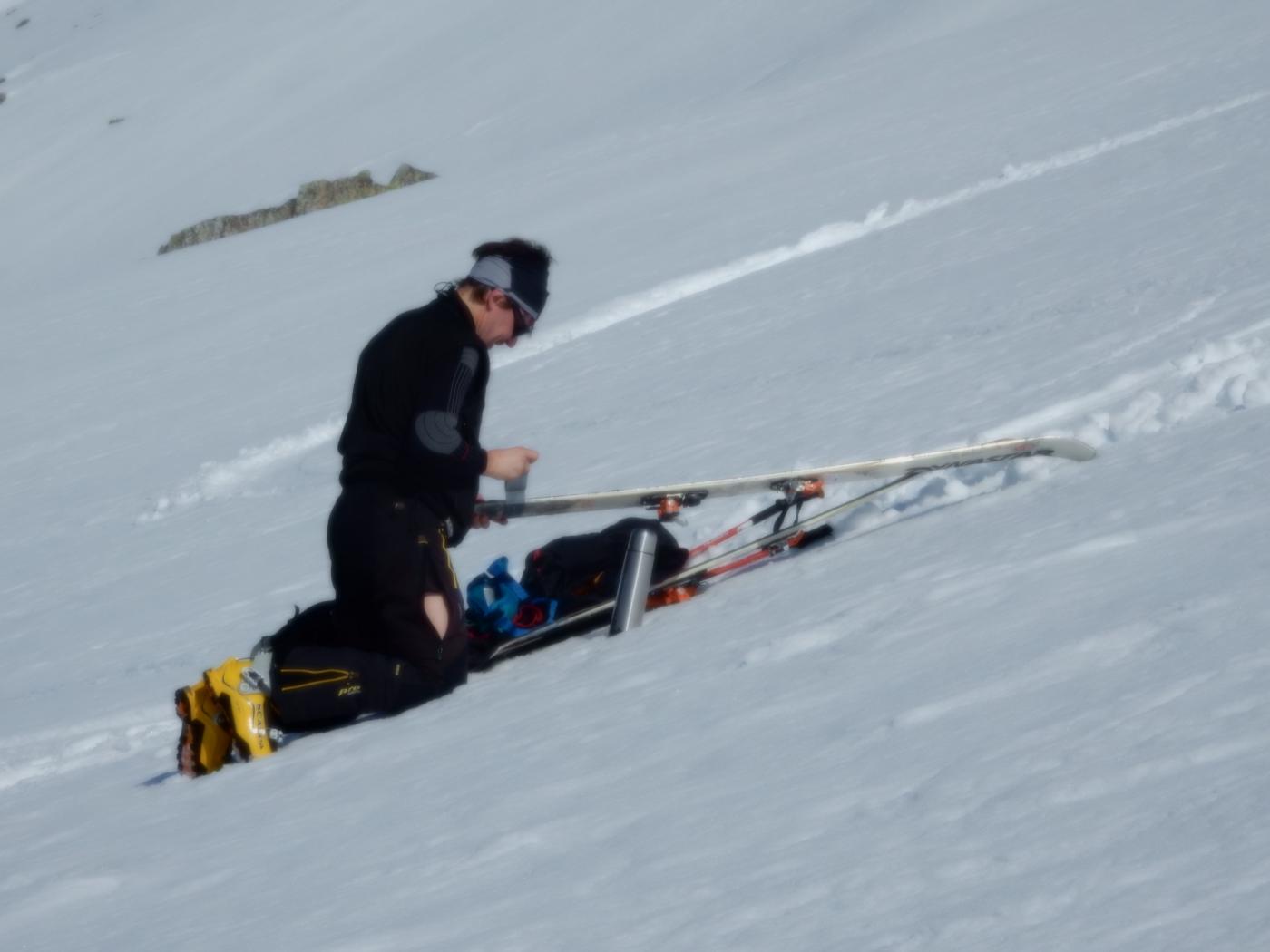 La neve non ha trasformato dai 2500/2600 in su, scendendo oltre mezzo giorno, aveva sufficientemente mollato e quindi la crosta si è trasformata in marcione sciabile un po’ lento (appena toccato il pendio più ripido abbiamo fatto partire due slavinette di superfice).