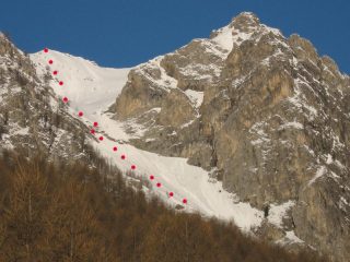 Un lavoro non terminato va concluso… con qs. spirito ritorno a quanto lasciato da fare dieci giorni prima. Le condizioni ahimè non sono più le stesse: la pioggia di venerdì e le poca neve pesante caduta hanno prodotto numerose piccole slavine spontanee che hanno rovinato il perfetto bigliardo che era presente fino a pochi giorni prima. Nonostante il ns. obbiettivo rientri tra quelli “rovinati” ci proviamo ugualmente: il conoide presenta farina pressata di fondo (il resto e già tutto sul fondo!) e dopo aver superato la frattura nel manto che ha prodotto il distacco (all’altezza dell’inizio del canale, proprio in cima al conoide), ci aspetta ottima neve compressa ed intonsa sino in cima.