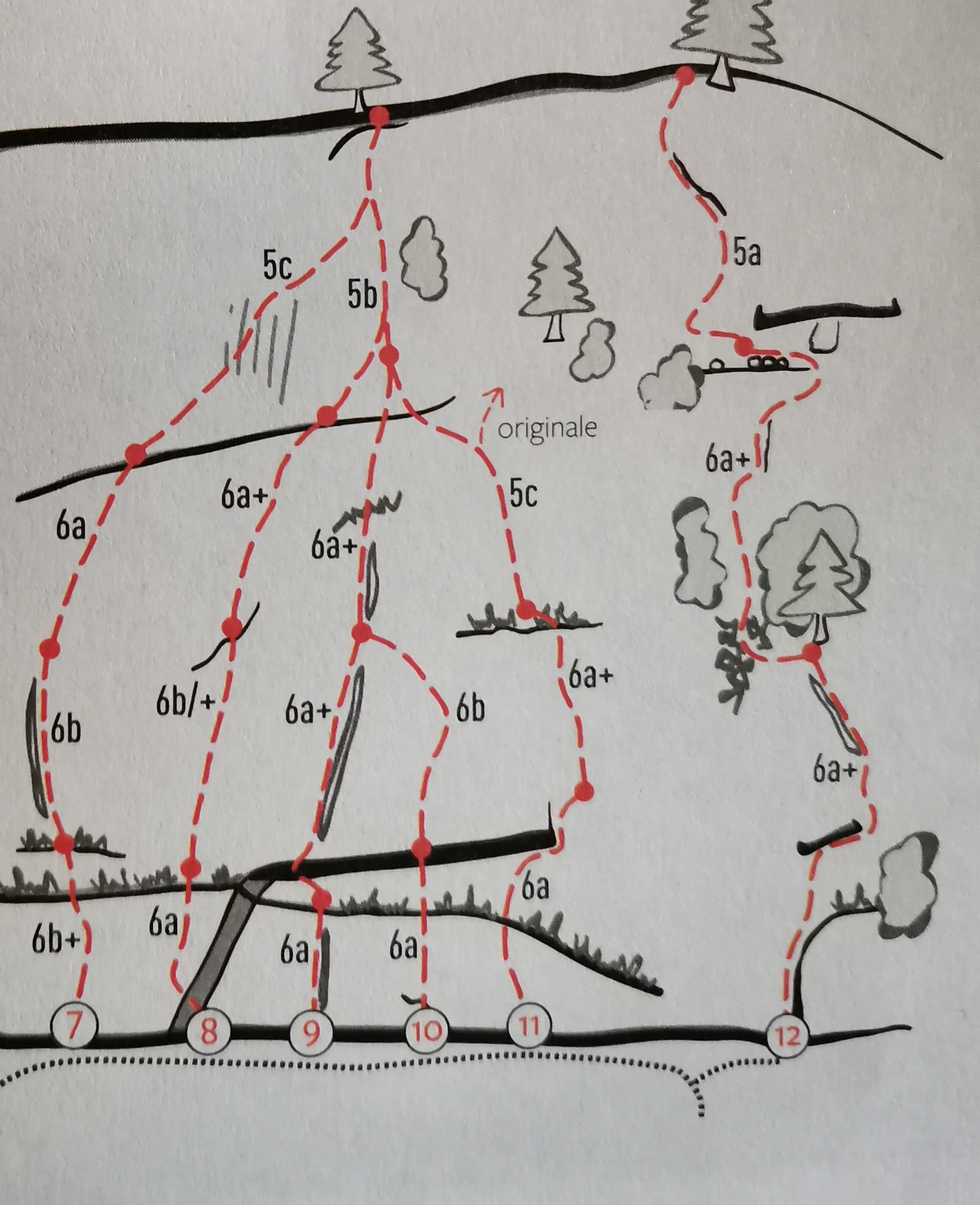 20m prima del cartello si trovano ometti a sinistra e bolli sbiaditi di vernice rossa su alberi con traccia che sale per bosco ripido, attraversano una zona con massi di frana, poi in breve fino alla base della struttura.