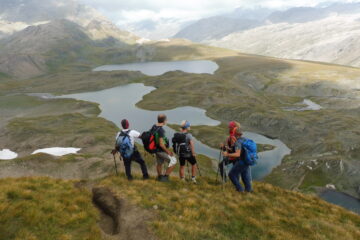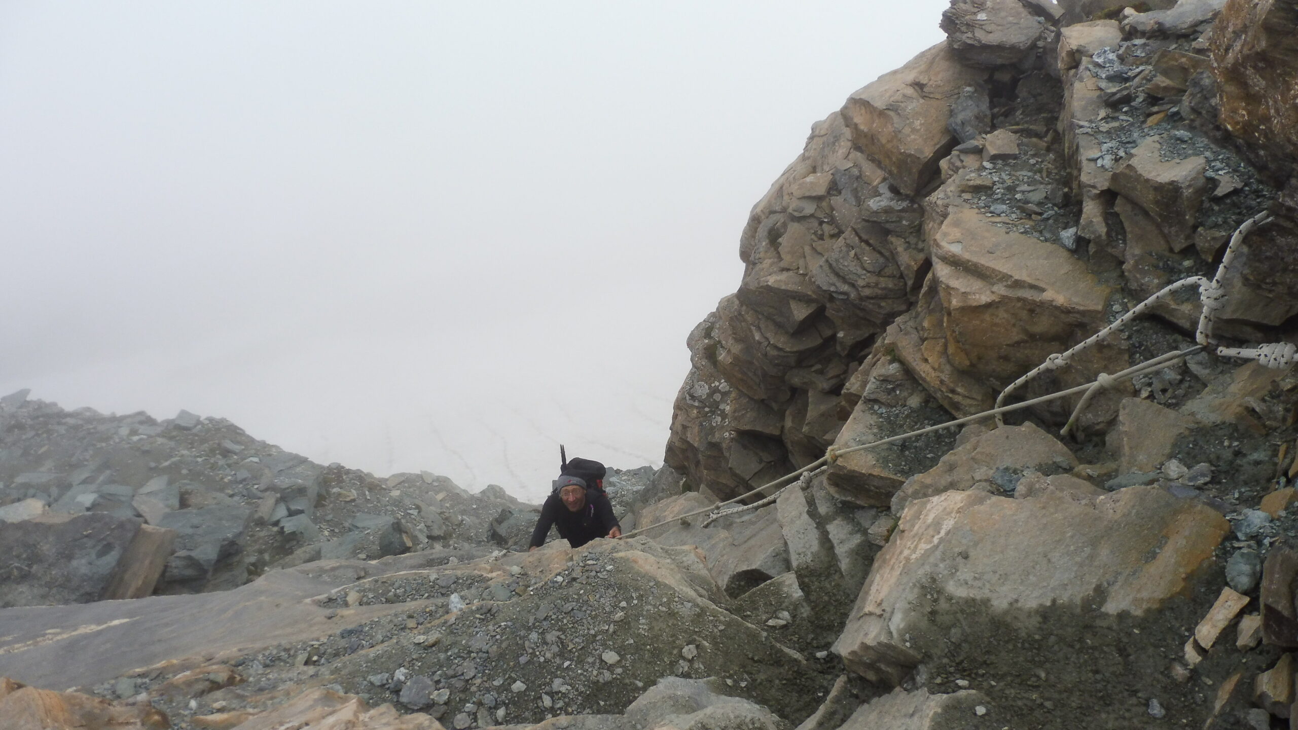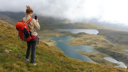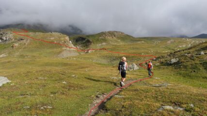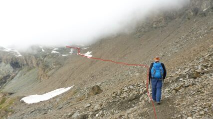 Trovato sotto il Colle Basei ancora poche lingue di neve comunque evitabili che non creano alcun problema e molto utili i numerosi ometti di pietra sulle pietraie moreniche in caso di nebbia come oggi, anche noi abbiamo contribuito al posizionamento di un paio. Purtroppo il Colle del Nivolet oggi a rivelato in pieno la sua nomea visto che le nebbie addensatesi di primo mattino sulle cime soprastanti hanno quasi azzerato il grande panorama che si pregusta dalla cima. Vorrà dire che ci tornerò un’altra volta. Gita che se fatta nelle migliori condizioni come oggi (come dovrebbe esser valutata ogni montagna) a mio parere non ha nulla di alpinistico, certo se fatta con neve e ghiaccio assumerebbe le caratteristiche alpinistiche ovviamente come altre vette escursionistiche del luogo.