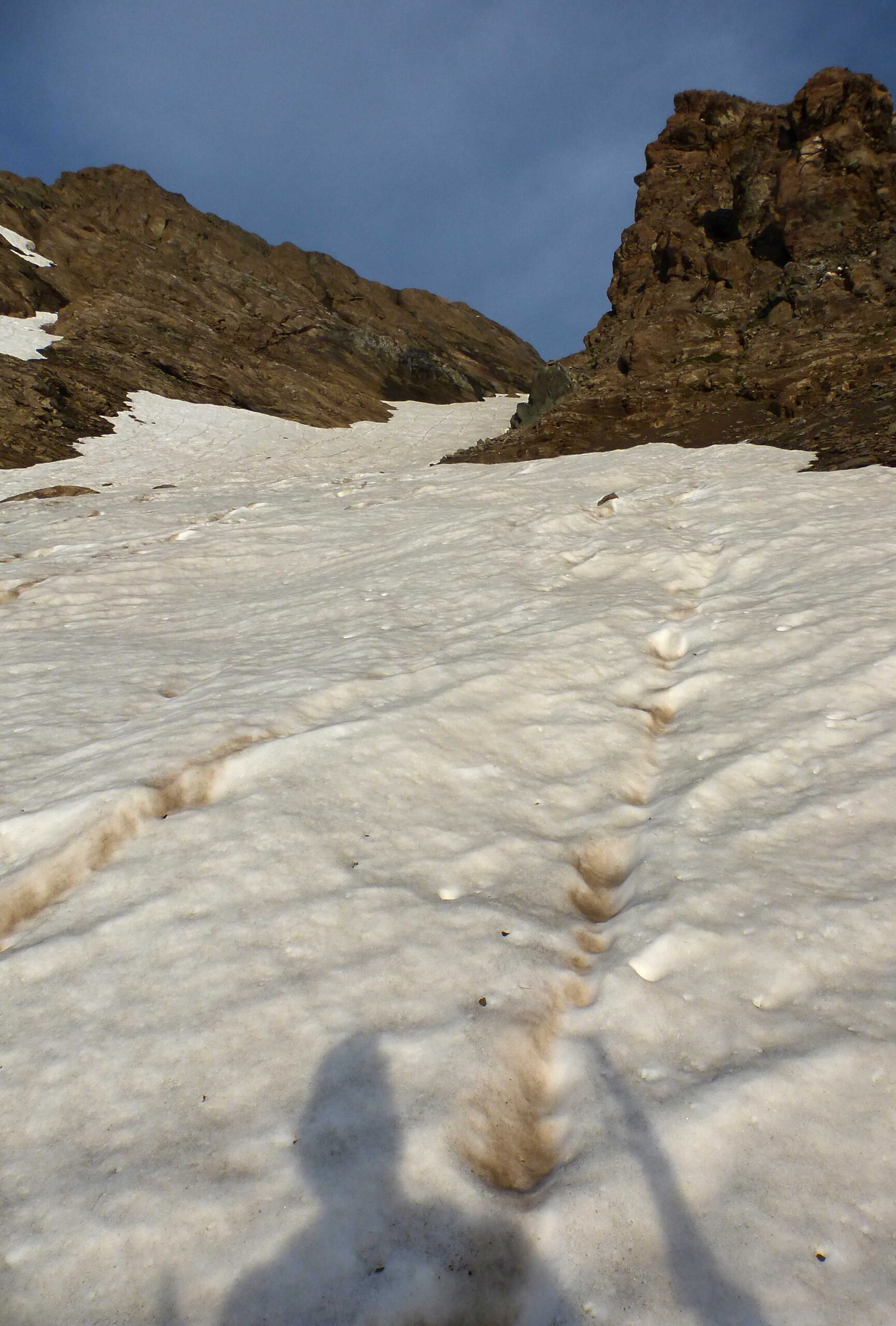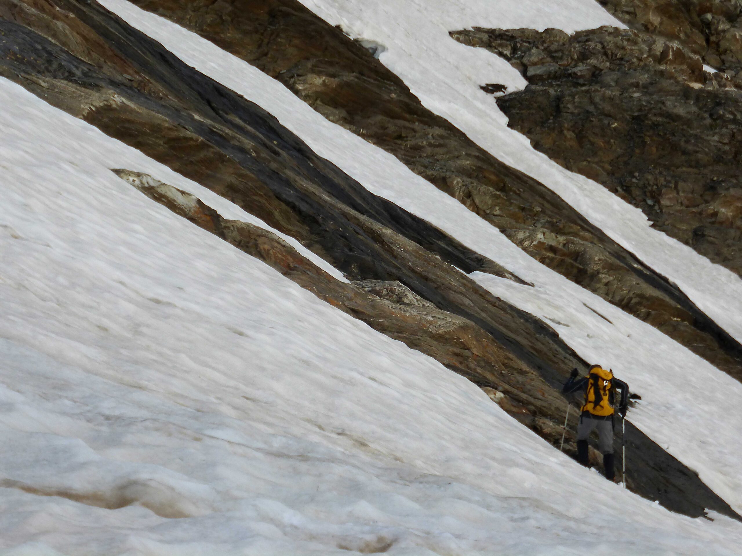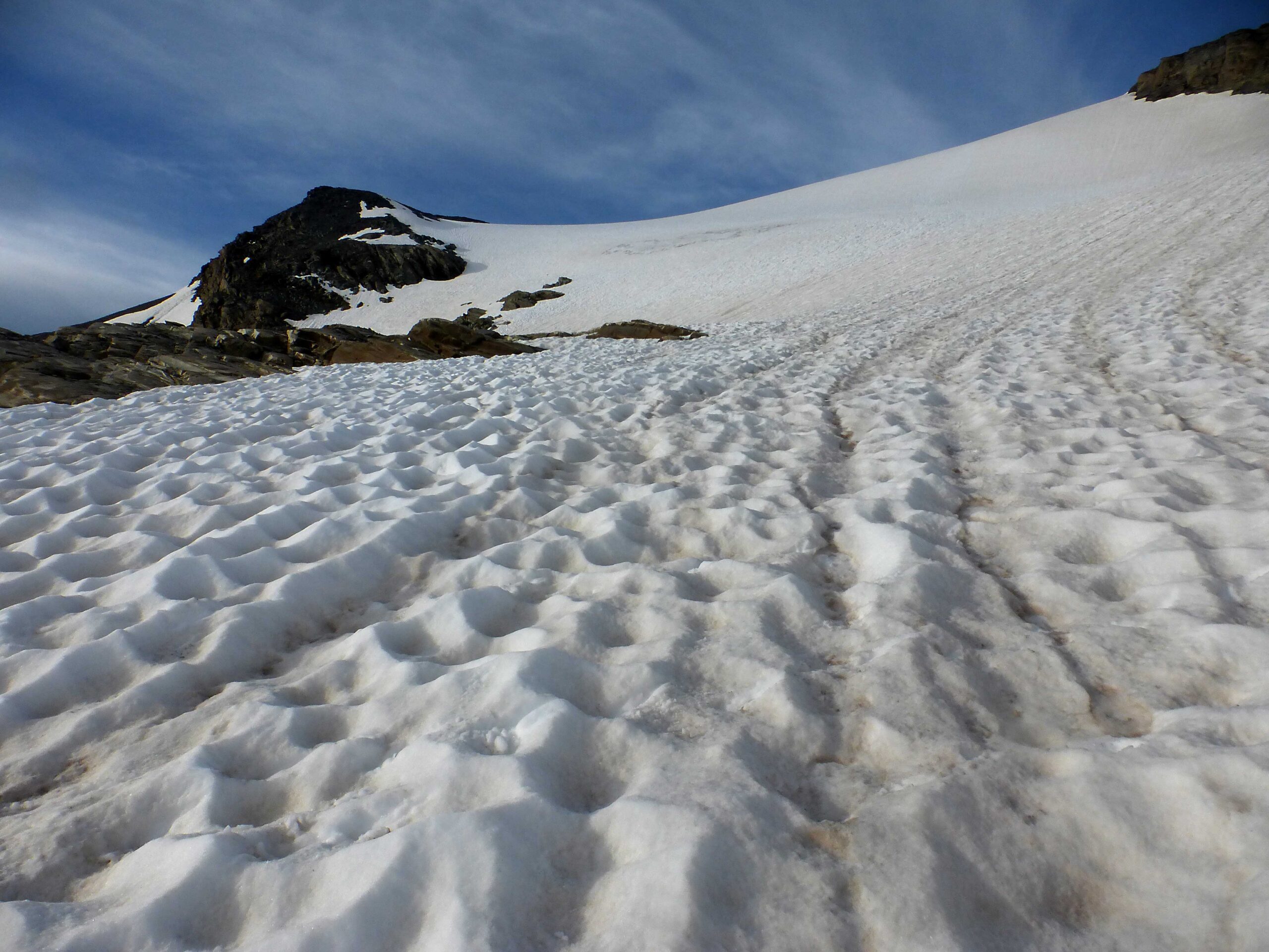 Fatto la via diretta per il ghiacciaio che, invece che percorrere il semicerchio della normale, sale in direzione SW a intercettare un canale nevoso a qt. 2700 mt (ramponi) e poi aggirare una fascia rocciosa e mettere piede sul ghiacciaio, piegare verso W avvicinandosi alla normale per superare una fascia di ghiaccio presente sotto il colle tra anticima e vetta, ghiacciaio molto segnato dalla pioggia.