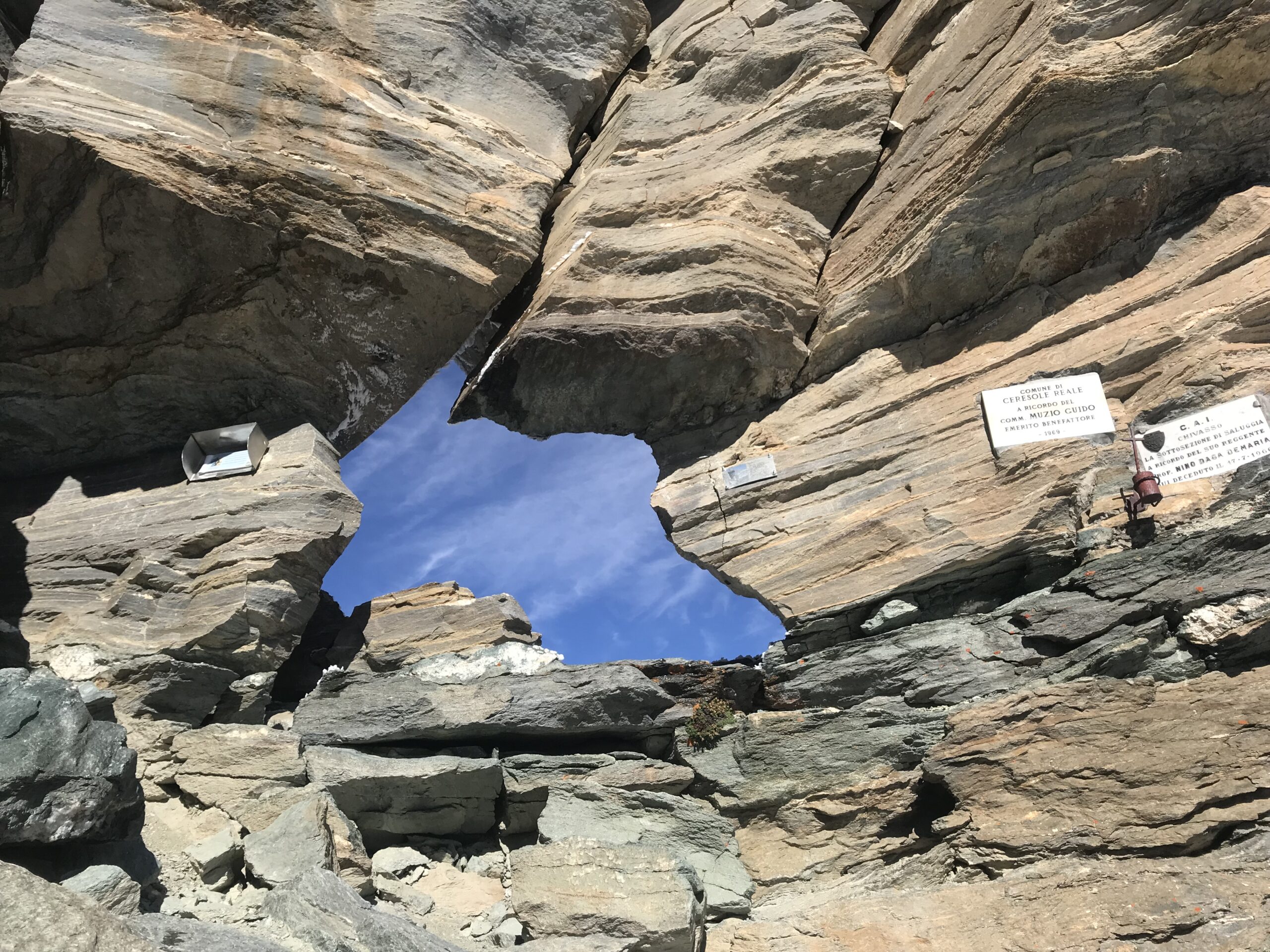 Cavi e scalini metallici in perfette condizioni e di grande aiuto; caratteristica la finestra nella roccia, subito sotto la cima, con ampia visuale sulla val di Rhemes.