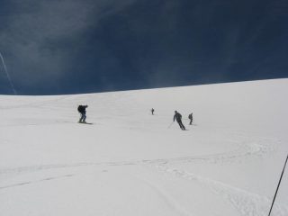 Fianalmente SOLE, Sci a spalle x 1/2 ora. Sul canale e sul traverso successivo, per il tipo di neve e la pendenza un pò di attenzione ma niente dipiù. La discesa sui pendii alti da SBALLO,il traverso ed il successivo ripido canale DIVERTENTI su piccole slavinette superficiali (max20 cm) di tipo incoerente per la qualità della neve,opportunamente valutata