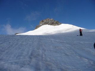 Con un po’ di voglia si puo’ ancora partire con gli sci ai piedi, ma tocca andare un po’ a dx e un po a manca. Noi abbiamo preferito cericarli in spalla x una ventina di minuti.Gia’ alle 6 del mattino la neve e molle ma ormai e’ assestata perfettamente quindi non da problemi. E’ necessario fare attenzione ai canalini in bassocominciano a spuntare parecchi buchi. Scesi su un ottimo firm a quota 2900 non abbiamo resistito a ripellare e salire all’anticima.per gustarci nuovamente quei 400mtNoi siamo scesi sul canalino piu’ a dx a quello di salita, ma e’ veramente al limite.Per evitare la risalita alla macchina siamo poi scesi sci in spalle dal sentiero estivo.