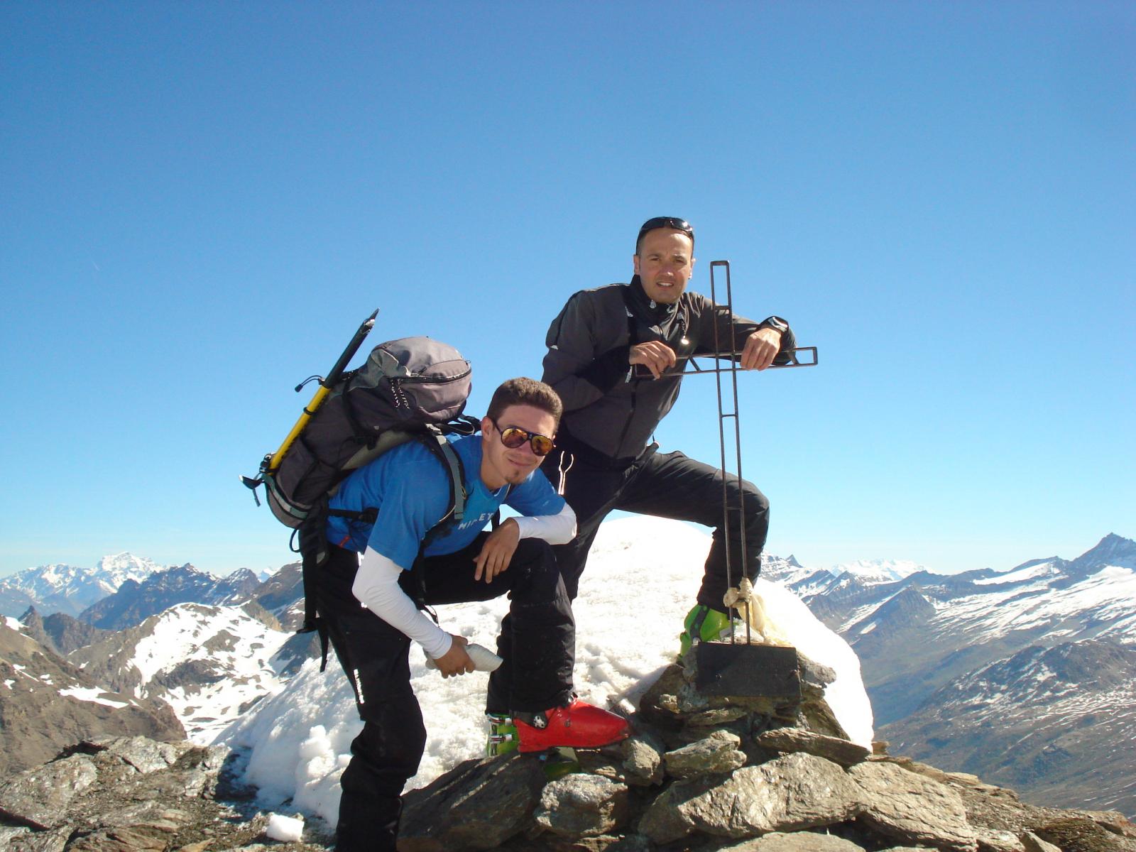 La Basei non tradisce anche quest’anno e, nonostante la levataccia prima dell’alba e i 45 minuti di sci in spalla per avvicinarsi alle prime lingue di neve, si conferma gita di grande fascino e soddisfazione. Le prime difficoltà sorgono nell’attraversare i due ruscelli che si incontrano nel pianoro e occorre un po’ di agilità per non finire in acqua. Poi si sale su lingue di neve fino a quota 2.750 dove il manto diviene costante. Buon rigelo notturno ma neve un po’ scivolosa che induce all’utilizzo dei rampant, quasi indispensabili nel traverso a ridosso del ghiacciaio. Una volta giunti sotto la vetta si sale agevolmente in punta aiutandosi con il canapone fisso completamente sgombro di neve al pari degli appigli rocciosi. Anche la croce è libera dalla neve. Panorama già visto parecchie volte ma sempre impagabile, con il gruppo del Gran Paradiso in evidenza. Discesa molto buona sul ghiacciaio, iniziata verso le 10,20. Da quota 3.300 a 3.000 pare di sciare su un biliardo, con condizioni perfette. Più giù invece il manto primaverile è in alcuni tratti un po’ scivoloso ma comunque divertente. Una volta sfruttate le ultime lingue di neve si devono rimettere gli sci in spalla per fare ritorno all’auto, lasciata lungo la strada proprio sotto il Rifugio Città di Chivasso. Meglio guadare i due impetuosi ruscelli un po’ più a valle e nel tratto pianeggiante in quanto nel corso della mattinata si ingrossano parecchio (occhio all’effetto “Into the wilde”). Prima di rientrare non poteva mancare un saluto al gestore Sandro Bado che con i suoi collaboratori stava preparando il rifugio in vista dell’apertura che avverrà lunedì 23 giugno. Con l’amico Luca.