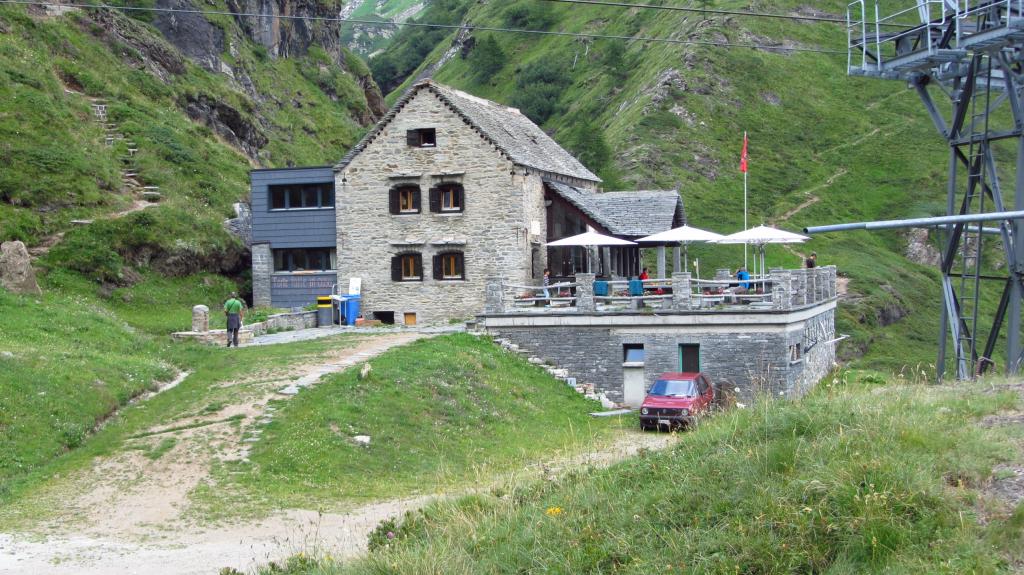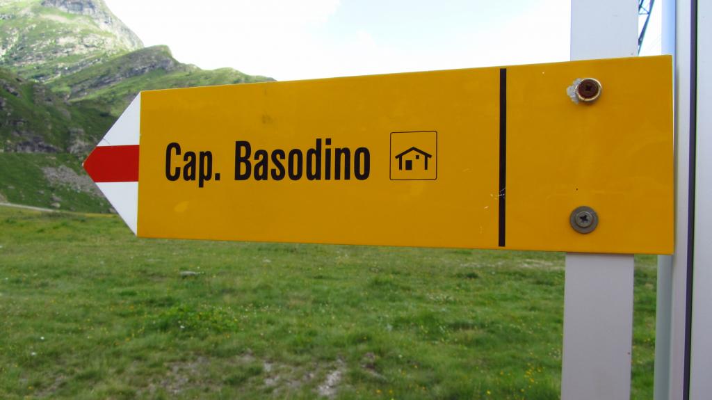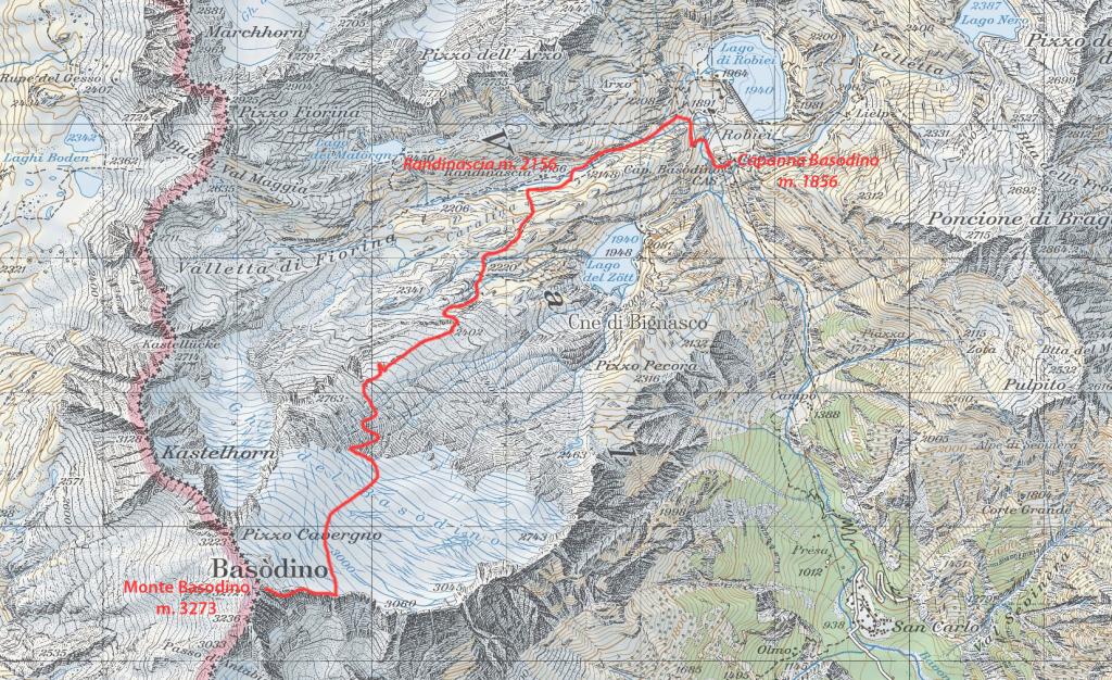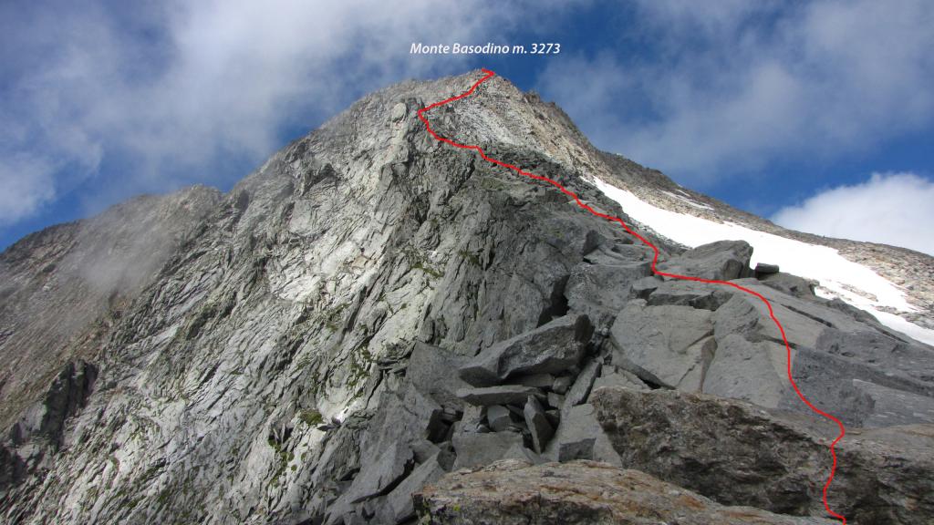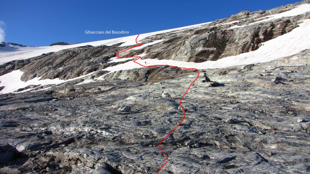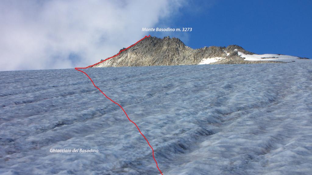 dalla stazione di arrivo della funivia a Robiei m. 1890 si scende in 10 minuti su strada asfaltata fino a raggiungere la Capanna Basodino m. 1859. Dalla capanna si risale la strada fino ad un pianoro erboso, dove si piega a sinistra seguendo un sentiero con segnavia bianco-rosso che con una serie di tornanti raggiunge la strada che porta da Robiei al Lago de Zott. Si piega a destra seguendo per un breve tratto la strada asfaltata che riporta verso Robiei per pochi minuti, fino ad un bivio con cartelli indicatori (Bocchetta di Val Maggia, Randinascia e Basodino) dove si abbandona la strada e si sale a sinistra con una serie di serpentine, fino a raggiungere un secondo bivio, dove si prosegue a sinistra, entrando in un valloncello dove il sentiero sale alla destra di un ruscello, salendo in diagonale tra alcuni grandi pietroni si raggiunge una piccola sella, dove si scende in una bella conca erbosa. La conca prende il nome di Randinascia m. 2156. Si continua ancora lungo il vallone (Valletta di Fiorina) fino a raggiungere una seconda conca erbosa dove è presente un altro bivio. Si tralascia il sentiero che a destra porta verso la Bocchetta di Val Maggia e si continua a sinistra (paline segnaletiche, seguire il cartello blu con l’indicazione Basodino) entrando in una conca detritica che porta sotto un salto roccioso. Il sentiero risale a sinistra del salto roccioso, con una serie di serpentine su una ripida pietraia, raggiunto il dosso roccioso, la traccia, sempre ben visibile (segni bianco-rossi e ometti), sale per pendii erbosi e pietrame verso destra con il Basodino e il suo ghiacciaio sempre ben visibili in alto (la vetta è la punta rocciosa più a sinistra della lunga costiera rocciosa che inizia dalla Bocchetta del Castel a destra e termina al Passo d’Antabbia verso sinistra) raggiungendo la base delle placconate rocciose che sostengono il ghiacciaio. Seguendo gli ometti sempre presenti e ben visibili, si sale con una serie di diagonali prima a destra e poi a sinistra, aggirando alcuni saltini rocciosi e placche lisce, fino a raggiungere le lingue iniziali del Ghiacciaio del Basodino. Messo piede sul ghiacciaio, lo si risale prima direttamente verso destra in direzione del soprastante Pizzo Cavergno, e poi traversando in diagonale verso sinistra puntando alla sella di quota 3014 m. alla base della cresta Est del Basodino. Lungo il ghiacciaio spesso si trova la traccia e attualmente (agosto 2013) è privo di crepacci, comunque richiede buona visibilità ma è percorribile senza problemi. Dalla selletta di quota 3014 m. si segue la cresta Est del Basodino formata da gradoni e massi accatastati tenendosi quasi sempre sul filo o qualche metro sotto sulla destra, con percorso piacevole si superano con facile arrampicata (I, con tratti di II) i gradoni e alcuni spuntoni (aggirando eventualmente a destra qualche asperità della cresta fino a raggiungere il primo blocco roccioso della vetta della Cima Nord del Basodino (libro di vetta e piccola statua della Madonna), si scende per pochi metri ad un intaglio e si risale con facile arrampicata il torrioncino dove è posta la piccola croce metallica della Cima Nord (punto più elevato).