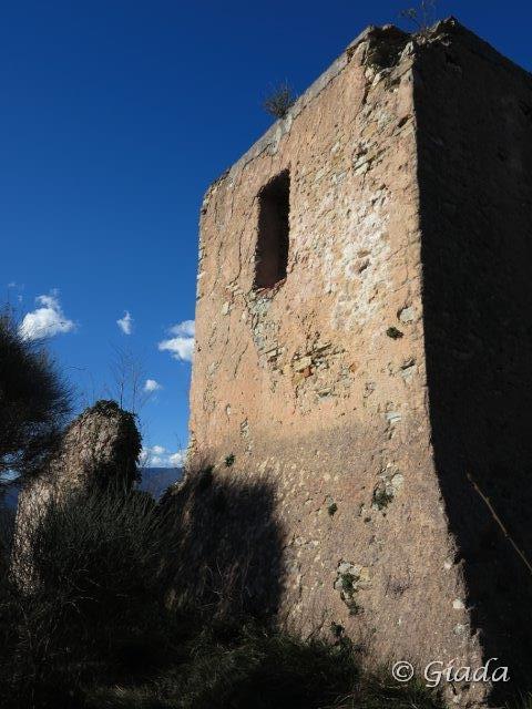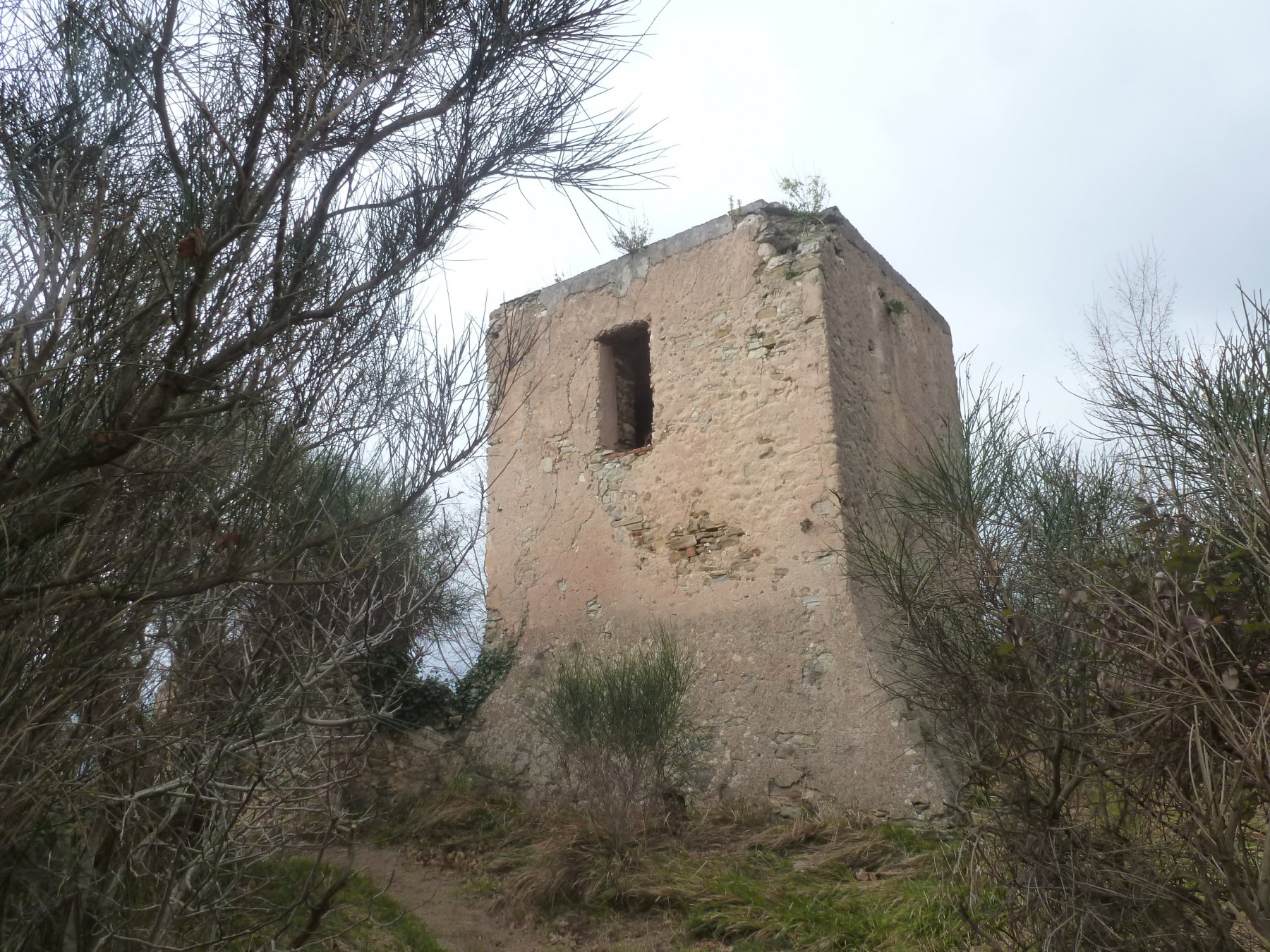 Proseguendo per la Torre di Bastia dalla chiesa si passa nel piazzaletto antistante questa seguendo sempre le linee verdi, si svolta a destra in salita dietro alla chiesa e poi a sinistra sempre in salita. Si passa il vecchio Mulino Fenicio che si può raggiungere a sinistra con una traccia, si arriva poi ad una croce in pietra in splendida posizione panoramica sulla costa ligure. Si prosegue sempre verso Gorra per deviare poco dopo a destra sul Sentiero Geologico segnavia due linee gialle e segnavia rombo rosso vuoto e cerchio rosso per passare dal Dolmen megalitico. Proseguendo si arriva dai ripetitori e poi sempre andando verso Gorra si prosegue su strada sterrata che poi diventa asfaltata per pochi metri, fino a sotto la Torre di Bastia. Per arrivare alla Torre quando si è nei pressi di uno slargo recintato a sinistra della strada, si trova a lato della recinzione un passaggio, ci sono i cartelli col segnavia rombo rosso che con un sentierino gradinato ci portano alla Torre m.321.