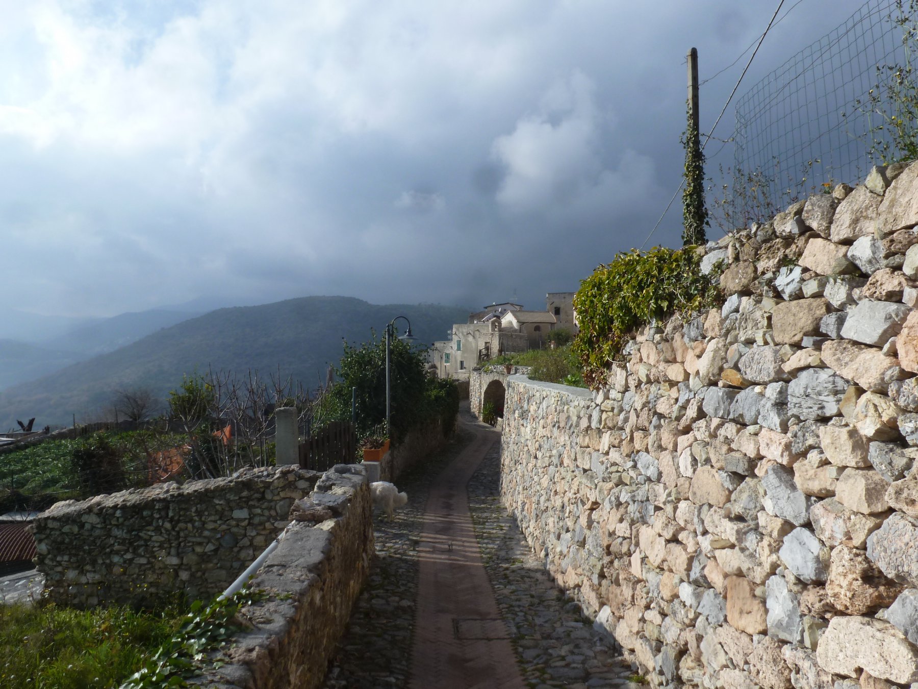 Si torna indietro lungo la strada fino ad incrociare a destra il bivio e il segnavia due linee verdi del Sentiero Natura che si segue fino alla borgata Crosa di Verezzi, consigliata la visita. Lungo il sentiero prima di giungere alla borgata, si trova a destra la deviazione per il Castellaro di Verezzi emblema dell’anima rurale e arcaica dei Liguri. Pannello esplicativo.