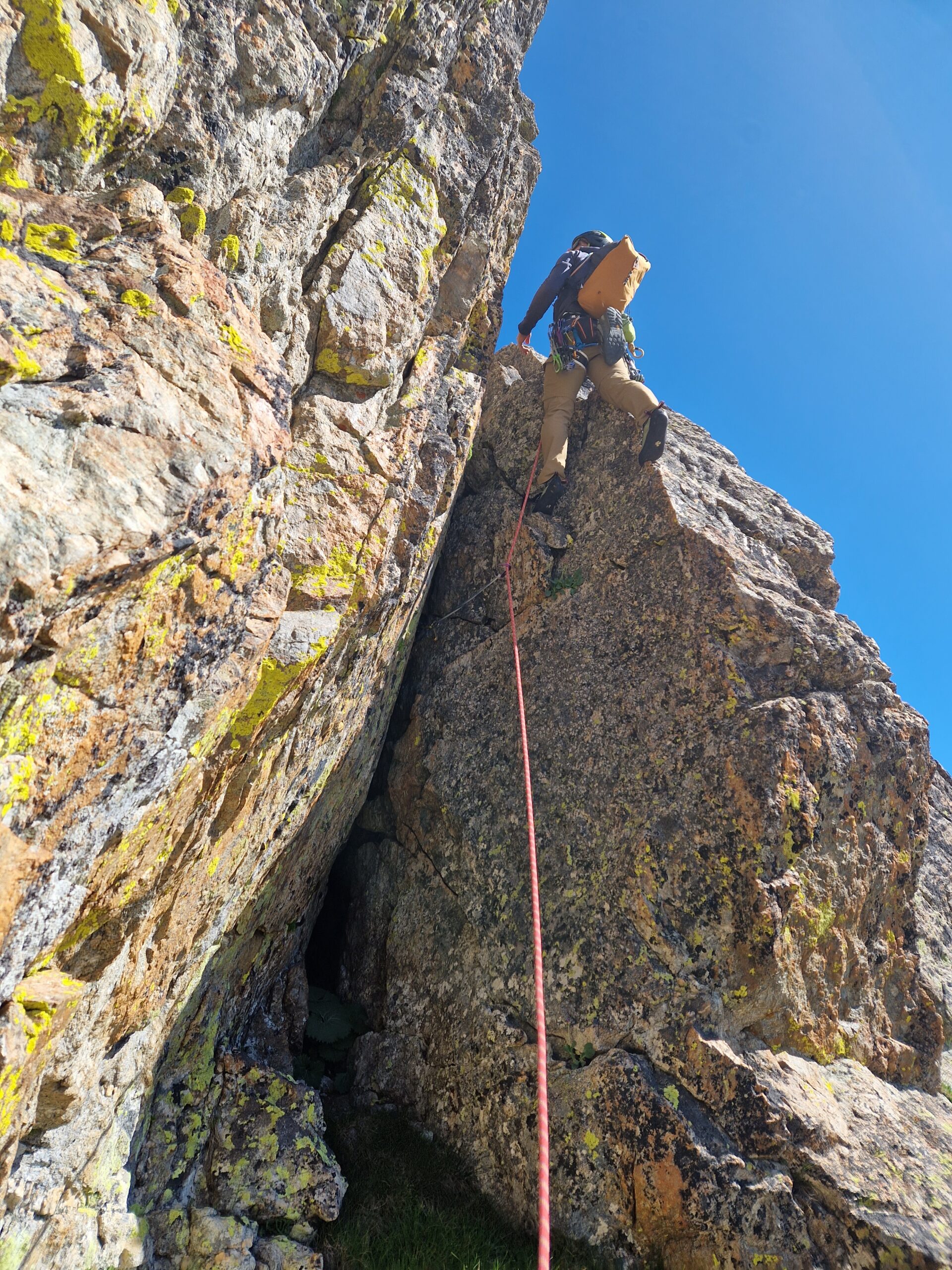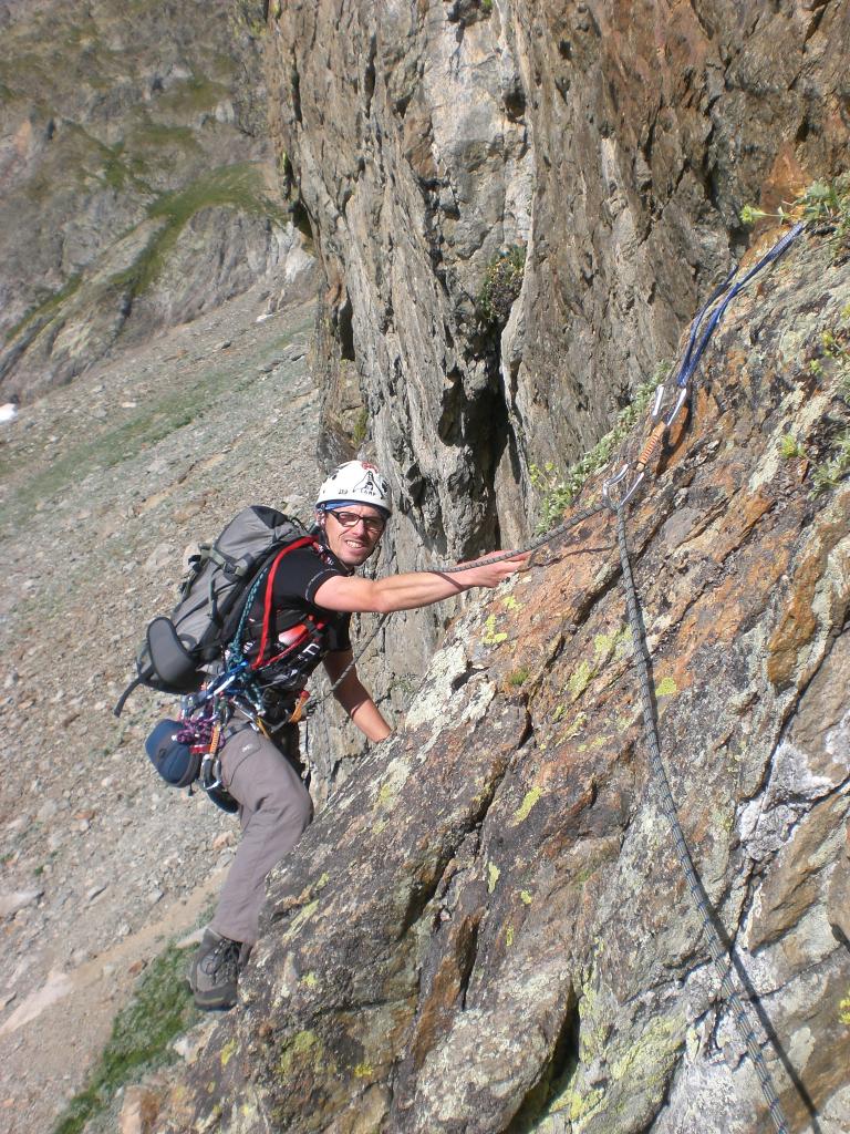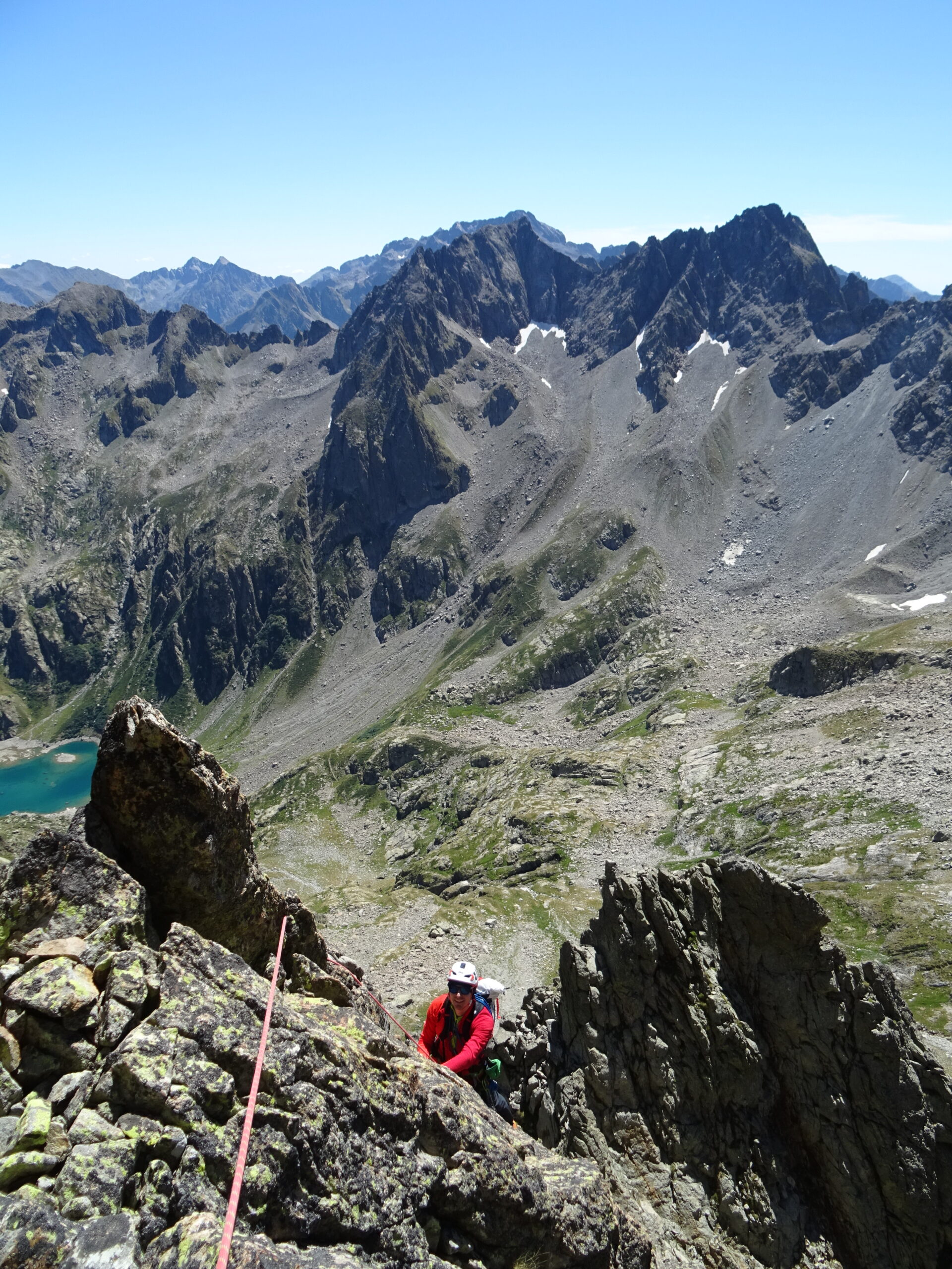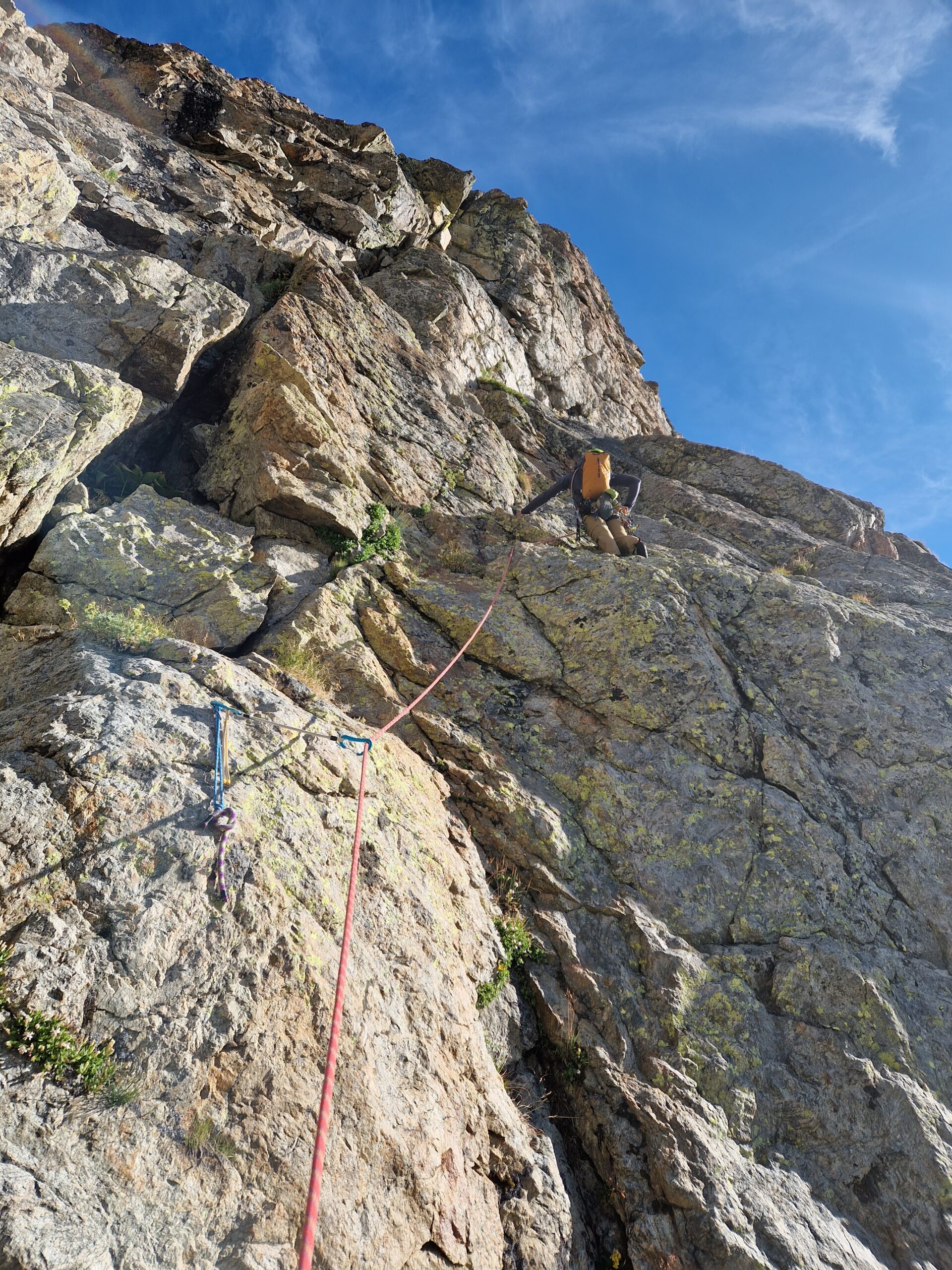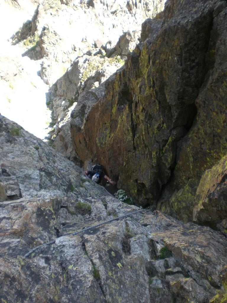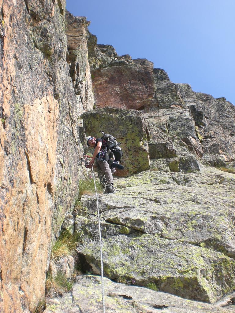 Breve discesa in doppia di una dozzina di metri. Quindi si sposta sotto il filo di cresta fino alla base dello sperone successivo.