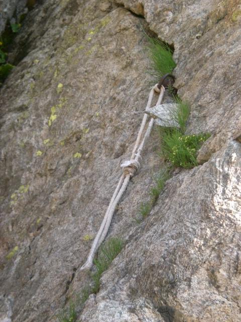 Un fix con cordino e un ometto segnano l'attacco (1h45 dal rifugio, 3h dal Lago della Rovina)