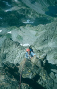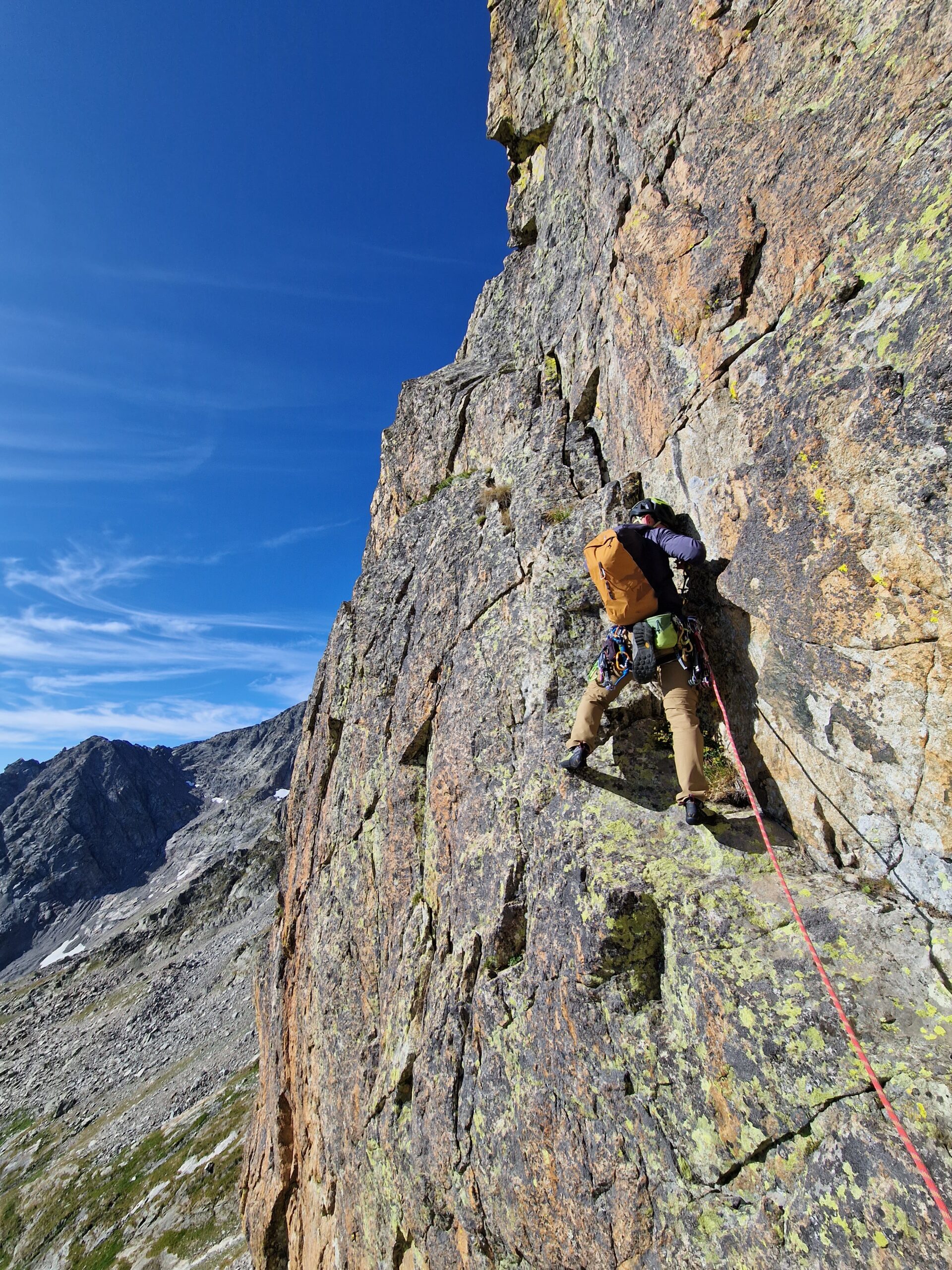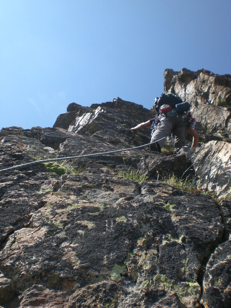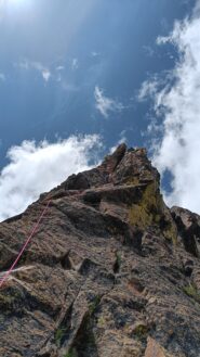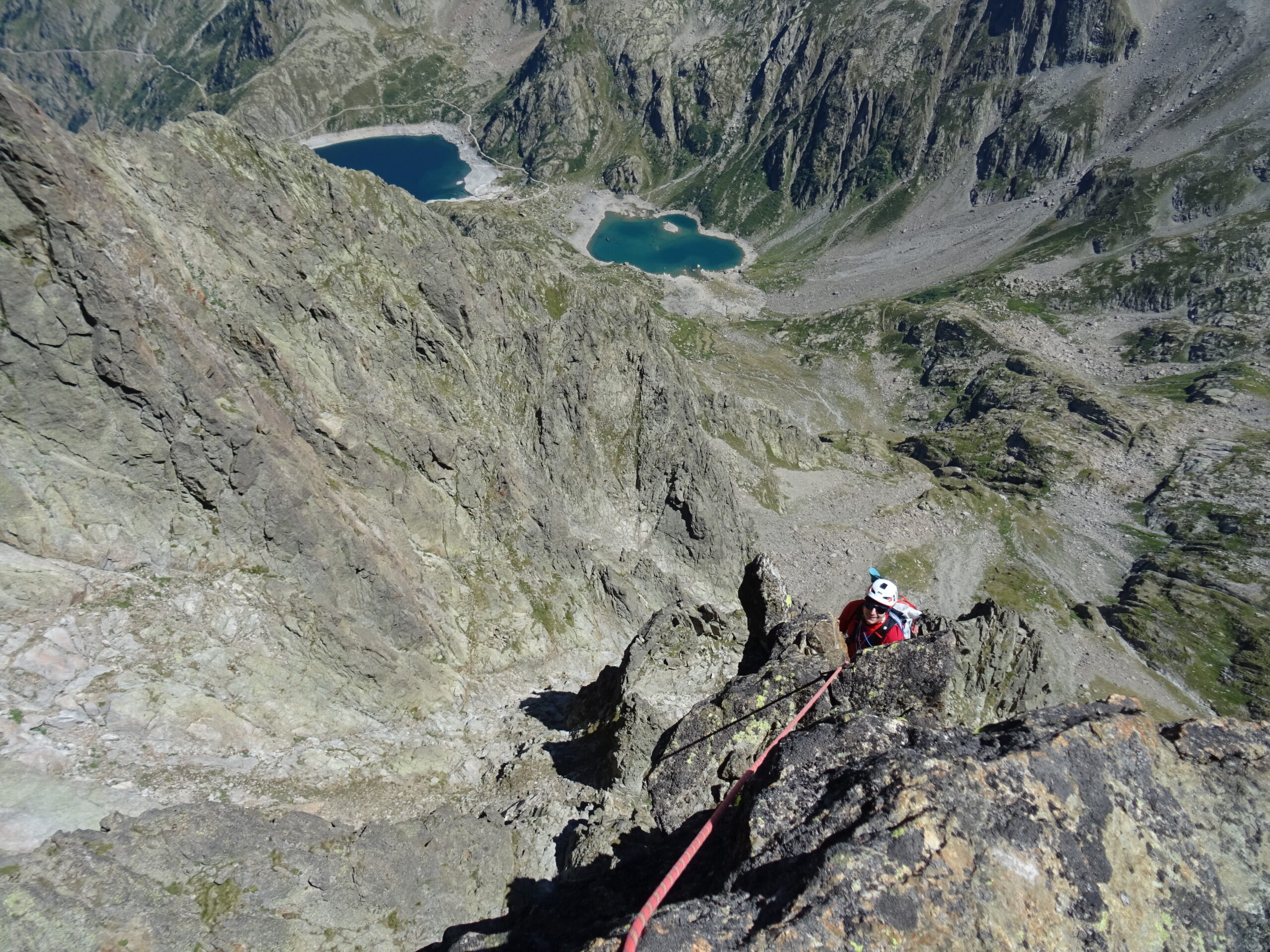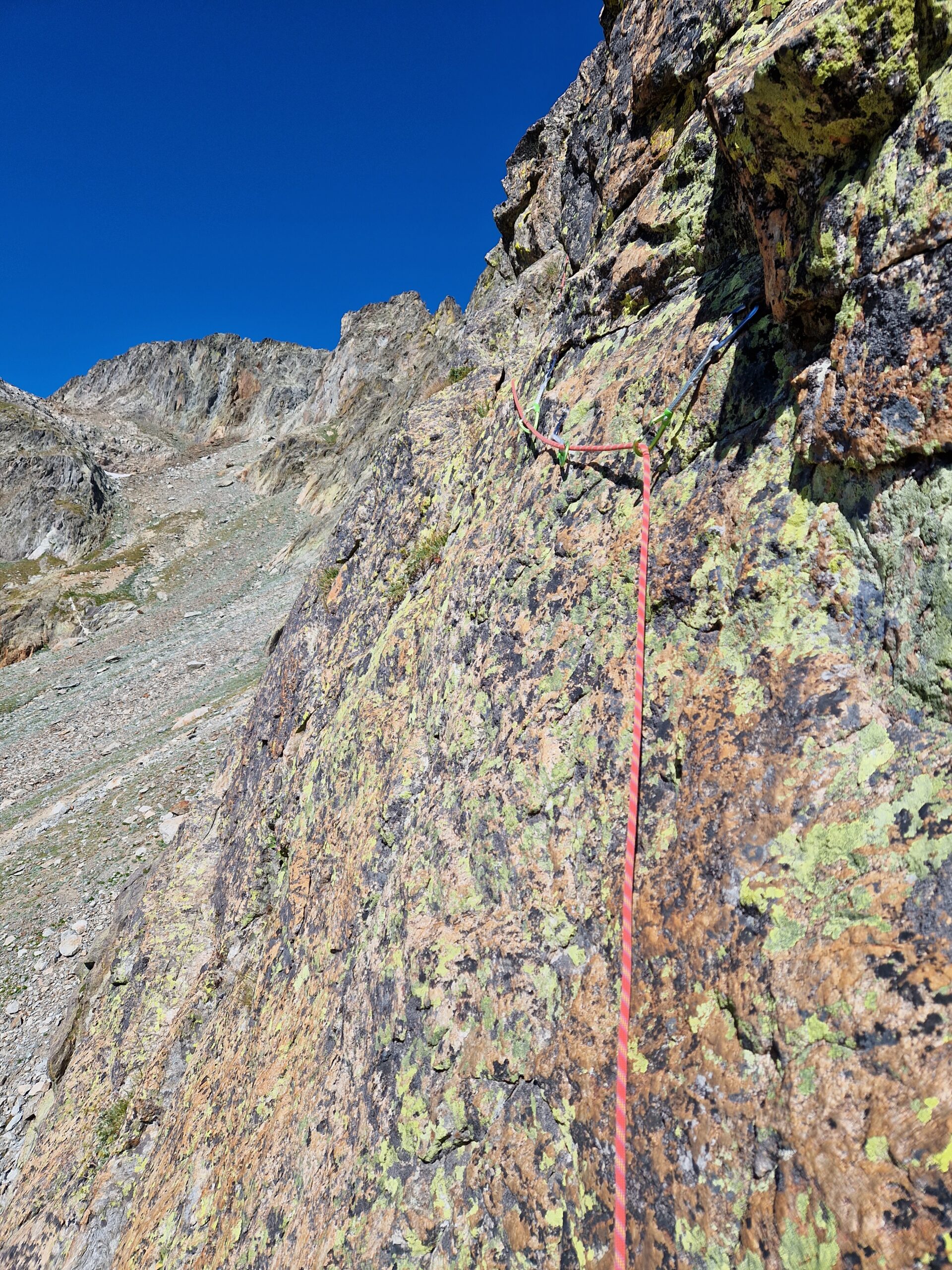 - L15: si segue il filo dello sperone fino ad un gendarme staccato (che può essere evitato a sx), proseguire sulla bella parete di fronte (passo di IV, fix), spostandosi poi a dx fino a riprendere il filo verso sx (sosta da attrezzare).