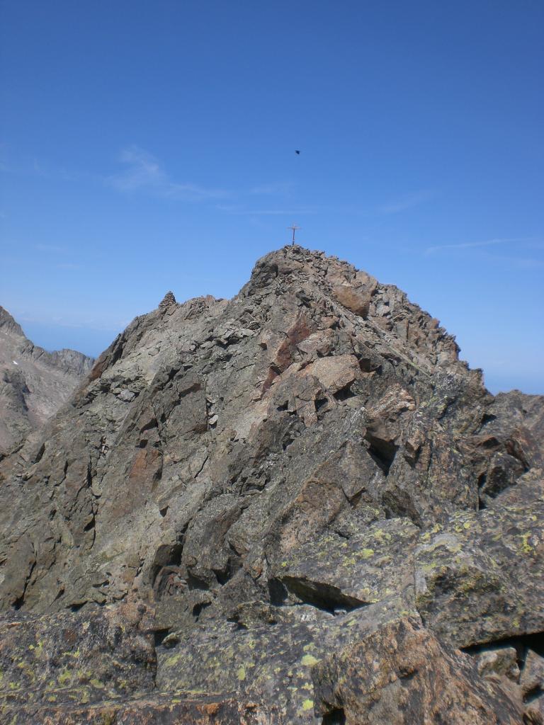 Si prosegue in conserva su difficoltà via via più abbattute (II) fino a raggiungere la cresta sommitale, da cui si prosegue ancora un centinaio di metri verso N fino in vetta. Circa a metà si incontra un torrione che va scontornato qualche metro sotto il filo sulla dx (II) e quindi si affronta ancora una bella placca fessurata (II+) fino a sbucare nei pressi della croce.