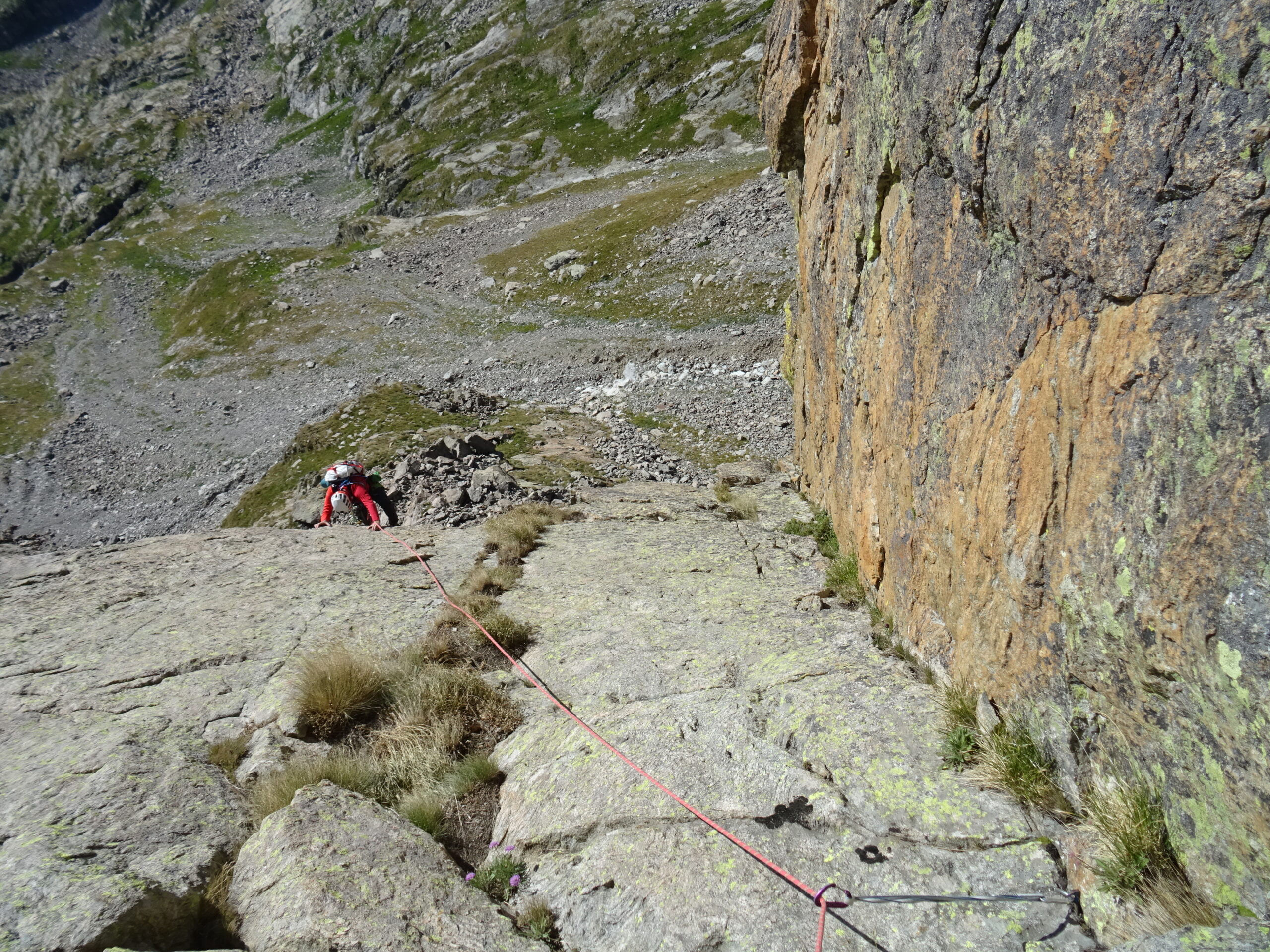 - L11: salire il diedro-canale erboso (IV poco proteggibile), fin dove questo piega a sx. Deviare quindi debolmente a dx prima tramite una bella fessura netta (IV+) e quindi sempre in diagonale a dx fino in corrispondenza di una placca (IV+/V) che permette di evitare dei blocchi strapiombanti sulla sx. Si raggiunge così il filo di un mal definito speroncino e in breve si raggiunge un terrazzo di sosta (da attrezzare su enormi spuntoni, ometto), 50m