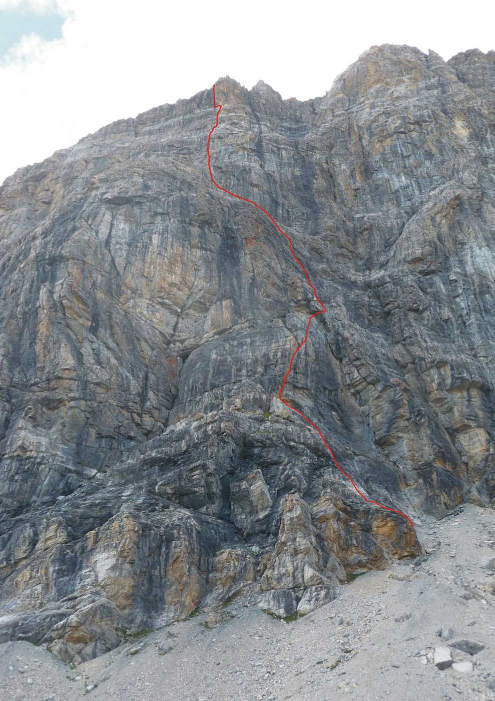 Primo tiro su placche abbattute (40 m, 4b). Dalla prima sosta si supera a sinistra una placca e si prende un diedro fessurato giallo con tratti strapiombanti (50 m, 6a+, molti fix). Segue il tiro teoricamente chiave, obliquamente a destra su placca per superare la barriera di tetti con traversata a destra a cavalcioni di uno spuntone, sosta subito sopra (30 m, 6b, in realtà più facile del precedente 6a+). Dalla terza sosta direttamente su roccia nera ottima e porosa, un muretto seguito da un bel diedro (50 m, 5c, necessari friend). Ancora un tiro su roccia nera, con un arco da destra a sinistra su placche non troppo ripide (30 m, 5c). Raggiunta una zona inclinata, la si risale puntando a sinistra sfruttando una vaga concavità grigia (55 m, 3b). Sosta sotto un muro giallo. Lo si risale con bellissima arrampicata non difficile, su roccia adesso eccellente, per uscirne a sinistra in sosta (40 m, 5c). Da qui direttamente per muretti e piccoli diedri fessurati da proteggere, roccia bellissima a bande bianco-gialle-grigie, sosta su ballatoio a destra (50 m, 5c). Ancora direttamente per muretti di roccia un po’ scagliosa, ultimo risalto fessurato per raggiungere una lista che porta a sinistra in sosta sotto il diedro teerminale (30 m, 6a). Per il diedro, bellissimo e un po’ atletico (mecessari friend), alla cresta sommitale dove si deve attrezzare la sosta (40 m, 6a).