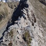 Discesa: dall’uscita della via scendere la cresta a sinistra (ovest), prestando attenzione a reperire i radi ometti che segnano il percorso migliore. Tratto delicato per la presenza di fine ghiaietto sulla roccia. Raggiunto un ghiaione, lo si discende e al termine seguendo sempre gli ometti si rientra a sinistra sulla cresta all’intaglio sopra una profonda gola. Dall’ultimo ometto si effettua una calata di 50 metri toccando terra al fondo della gola (ancoraggio con 2 fix, fettuccia verde e maillon). Si scende quindi la gola rientrando in breve al ripiano “Thenn de Rhemes”. Circa 1 ora dall’uscita alla base della parete.