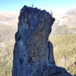 Risalire il camino finchè in alto non si chiude; uscire a sinistra e proseguire per placchetta fino ad una seconda strozzatura. Traversare a destra e rimontare la paretina esterna al camino, ripida ma ben appigliata, finchè la pendenza non diminuisce ed è possibile rientrare. Gli ultimi metri, via via più facili, conducono su una cresta a poche decine di metri dalla vetta (sosta su spuntone, 50 m, V+ e V).