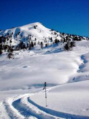Solo e solitario (vista solo una pattuglia di alpini in esercitazione, no m.slitte)ho scelto questa gita facile e sicura: neve che di più non si può fino all’auto nonostante il sole tiepido. La foto, con il Courbion, non dice tutto