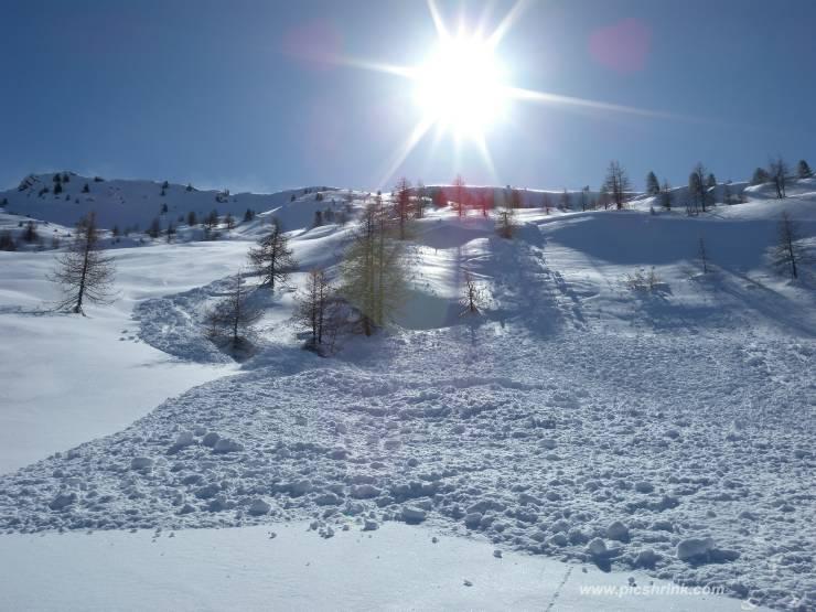 Riporto la descrizione di mark tratta da Alp Virtuale, non ho nulla da aggiungere se non ringraziare qualcuno nel cielo…”Doveva essere una semplice passeggiata…invece stava per trasformarsi in disastro..Troppo invitanti i pendii della Fournier, ma anche incredibilmente troppo insidiosi sulle pendenze più irrisorie.Poco prima dello scollettamento si è mosso sopra la testa un fronte di oltre 100 metri… il tempo di fuggire come un razzo verso un abete e vedo Icio con la coda dell’occhio sparire in un mare in burrasca.Il tutto dura 4/5 secondi, se ne va giù una ventina di metri, il pendio è dolcissimo il fronte si allarga, e la testa è sempre fuori…Attendo un minuto che tutto si acquieti, scendo veloce ed in minuto lo aiuto ad uscir fuori…Mire, Piera e due ciaspolatori, quando arrivano gli prende un colpo…Divalliamo in silenzio e risaliamo al Begino…Dall’altra sul Giassez, gira l’elicottero e ci sono numerose valanghe, anche alla Dormilleuse è critica…La neve oggi è da 5, ma il morale è sceso a 0″