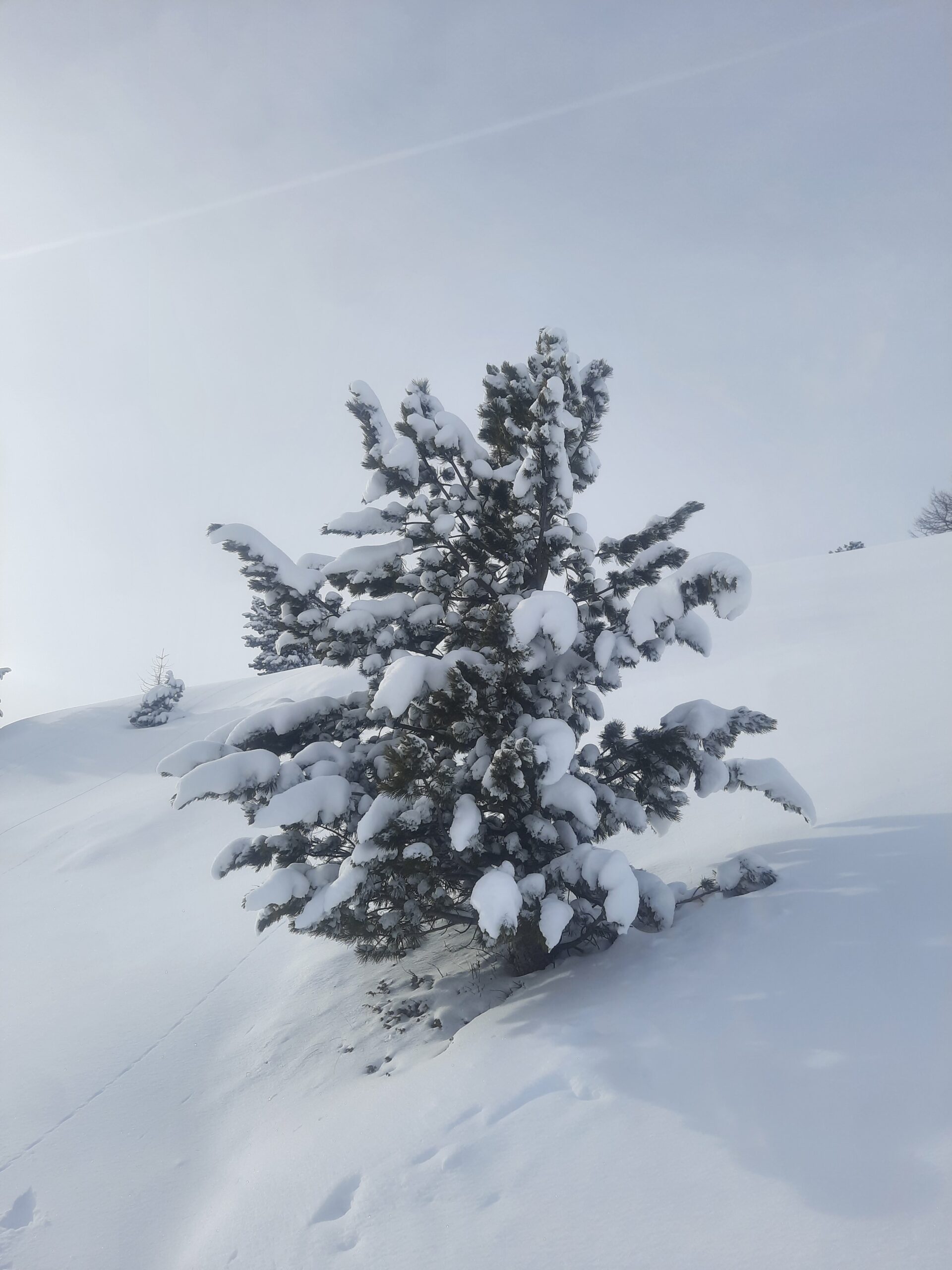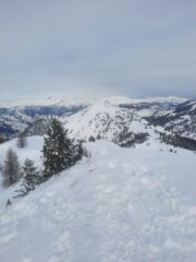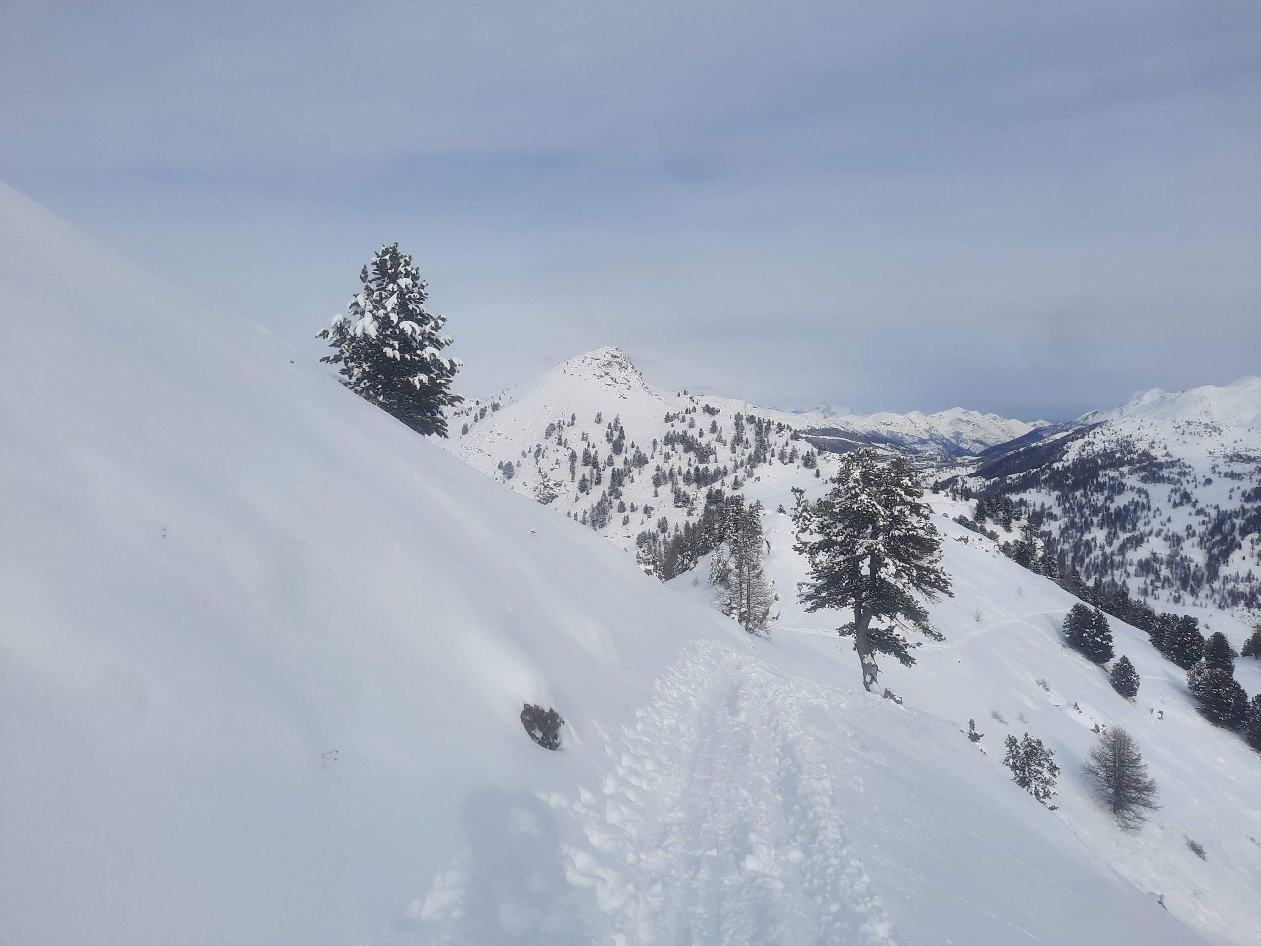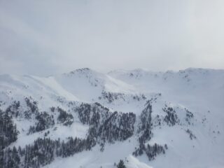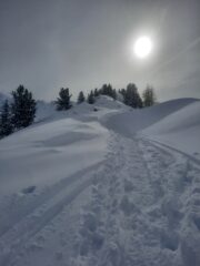 Salito prima alla Fournier; pendii già ampiamente segnati dai vari passaggi; molta gente sul percorso; qualche tratto intonso si trova ancora, neve appesantita.
