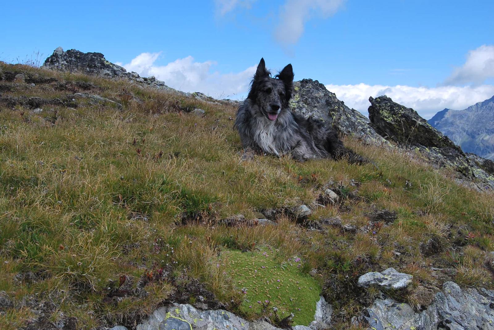 Il sentiero praticamente non va da nessuna parte, è marcato presso il laghetto (tracce di animali) ma poi muore quasi subito. Ma guardando attentamente si vede un’impercettibile riga che corre tra mirtilli e rododendri: io l’ho seguita e concatenandola con altre tracce sono arrivato al colle che separa la Comba Sozin dal Vallone di Ponteilles e da questo alla punta sovrastante. E’ un panorama eccezionale, peccato per la giornata che, come quasi sempre quest’anno, ha offerto solo nuvole e vento. La quota non è elevata (sulla cartina dovrebbe corrispondere alla cima 2561 m, con colle a 2548 m), raggiungerla è un po’ impegnativo per il percorso impervio; io ho seguito i canaloni, il suggerimento è di rimanere sempre sul pendio prativo sul fianco (scoperta come sempre fatta in discesa) che ha pendenza più moderata e si cammina meglio.