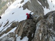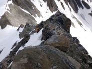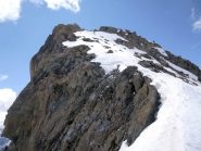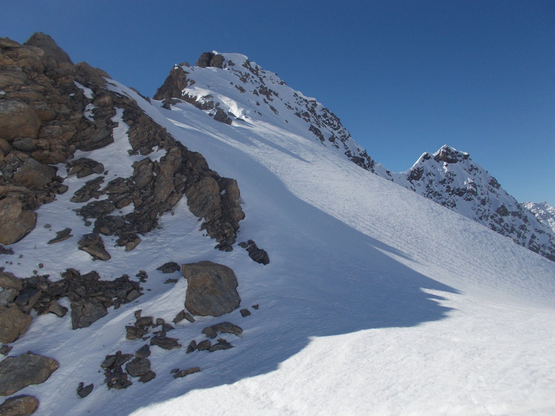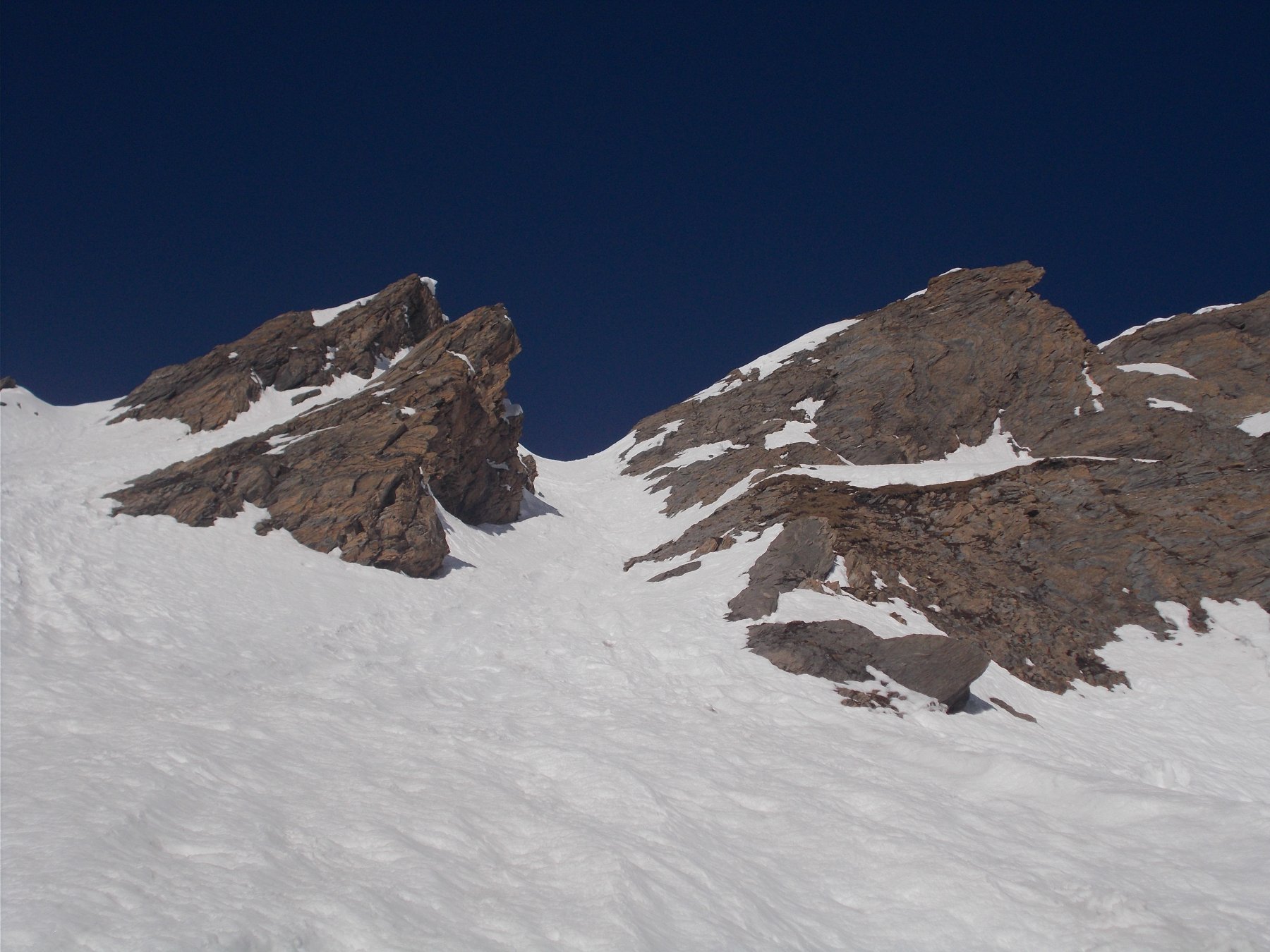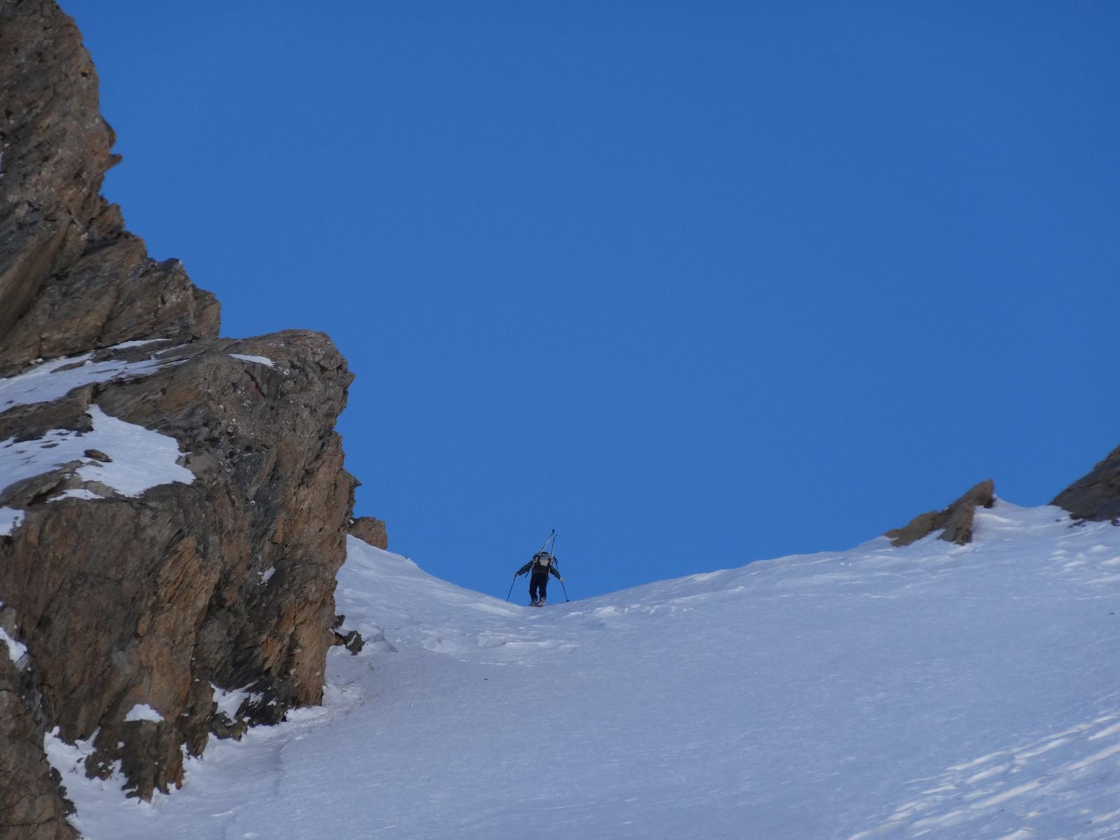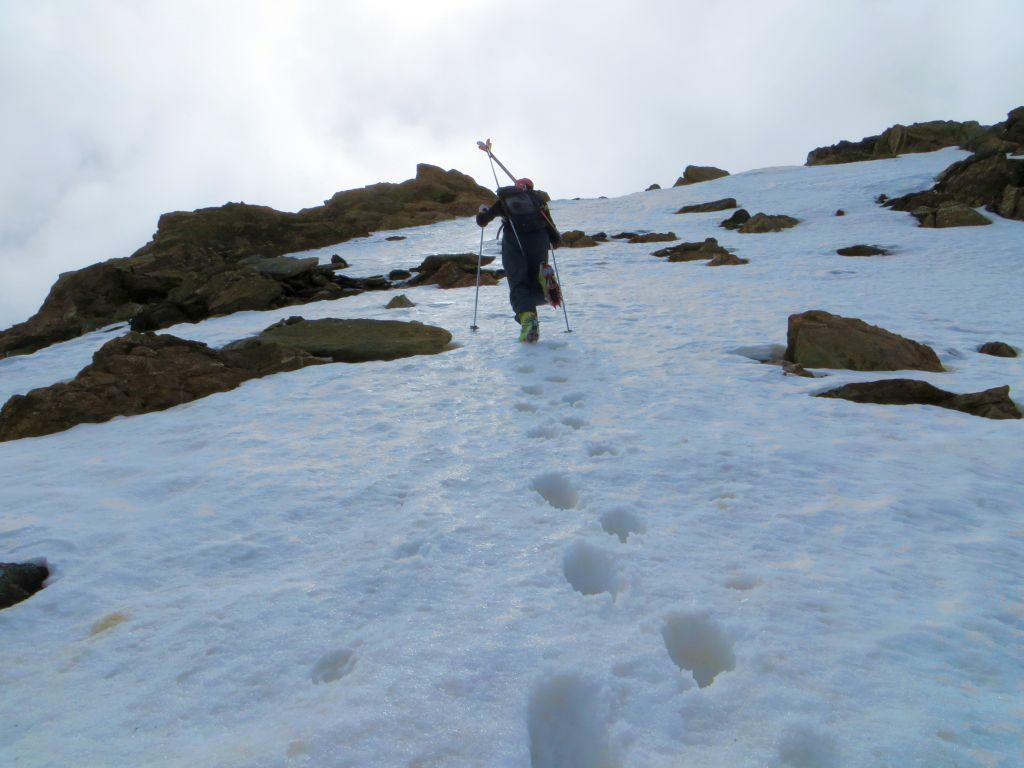Si raggiunge così la cresta Nord a circa 50 metri di dislivello dalla vetta ,dove occorre lasciare gli sci e continuare per rocce e roccette frammiste a neve con un paio di passaggetti di I°-II° (attenzione alla friabilità della roccia).