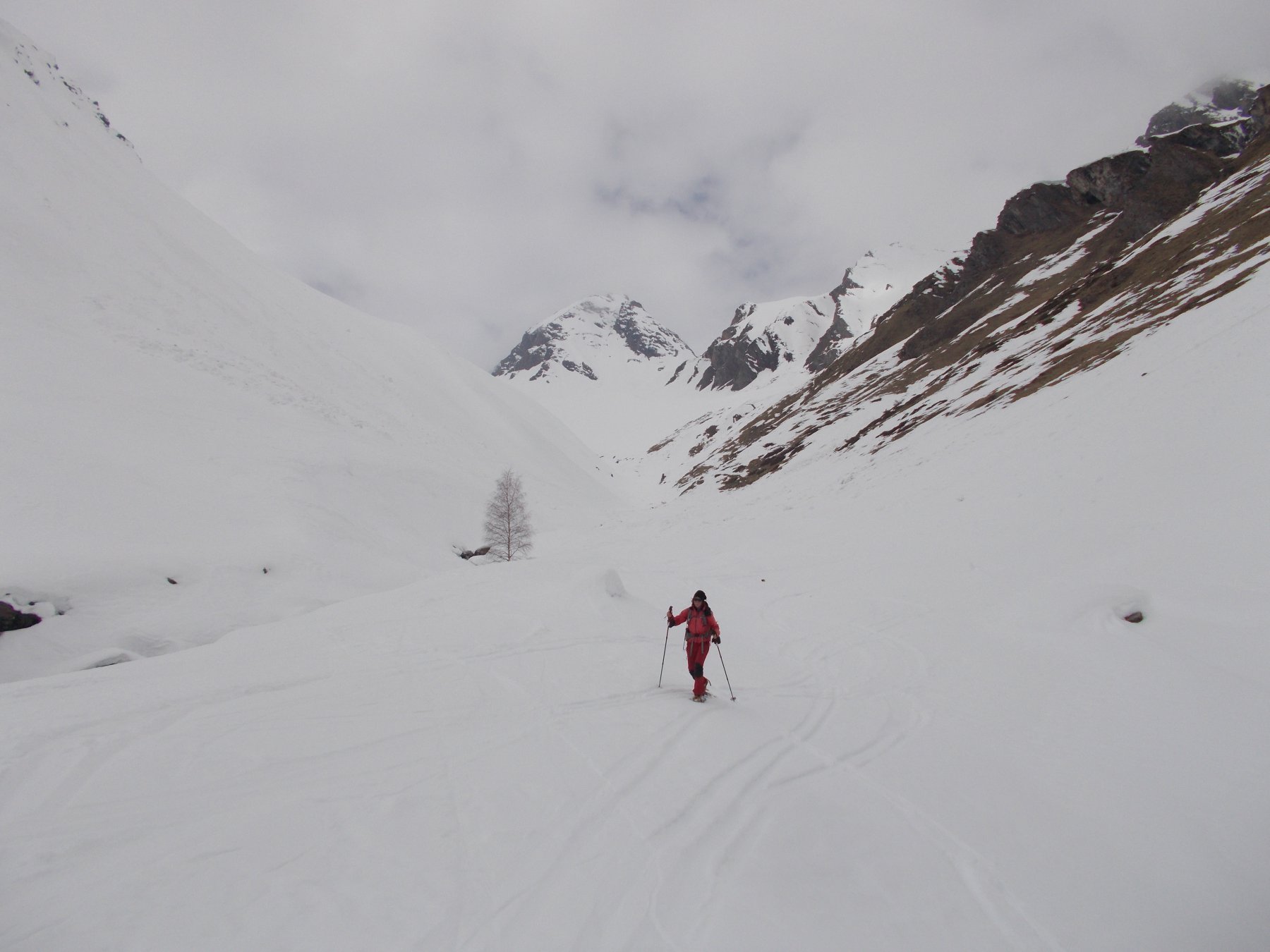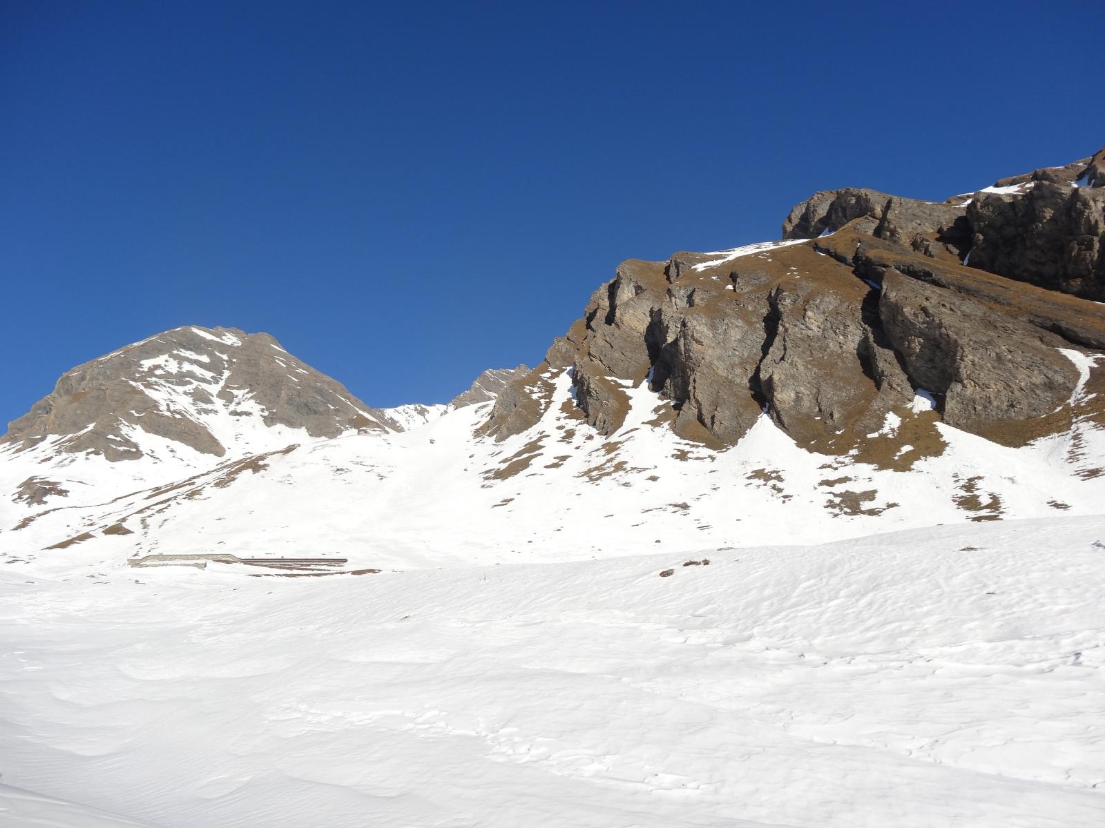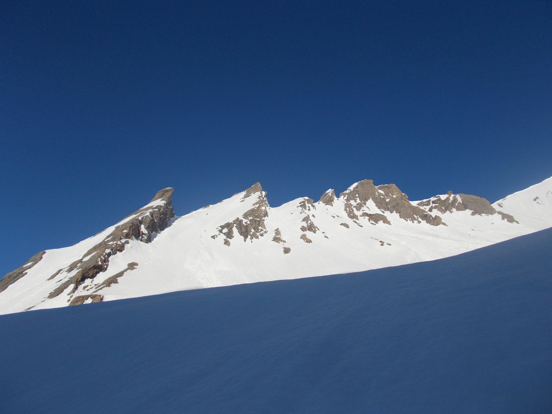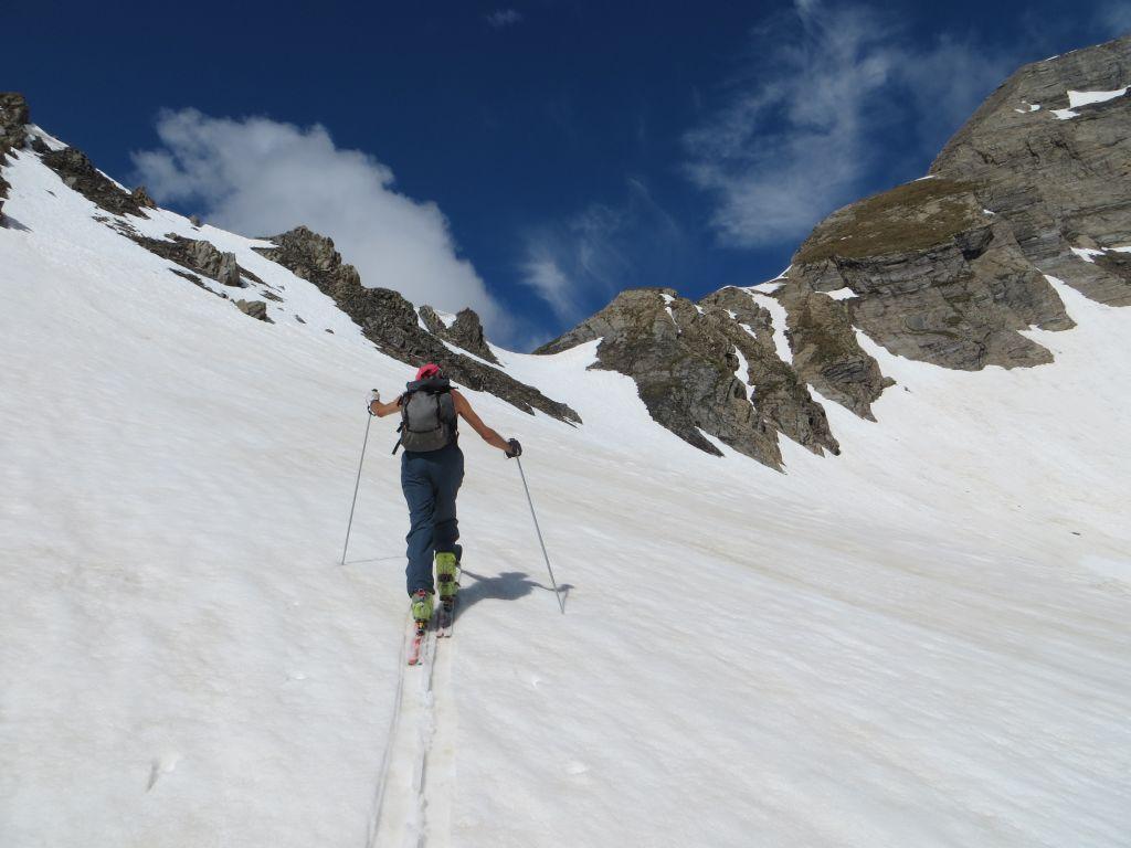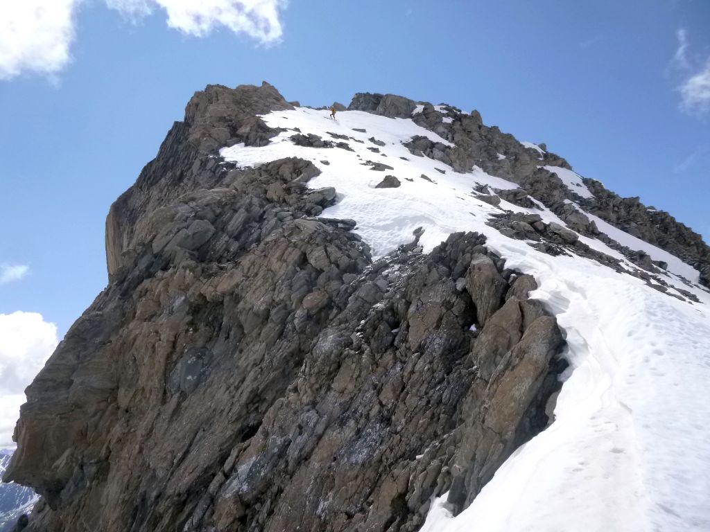 Si raggiunge così la cresta Nord a circa 50 metri di dislivello dalla vetta ,dove occorre lasciare gli sci e continuare per rocce e roccette frammiste a neve con un paio di passaggetti di I°-II° (attenzione alla friabilità della roccia).