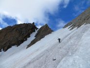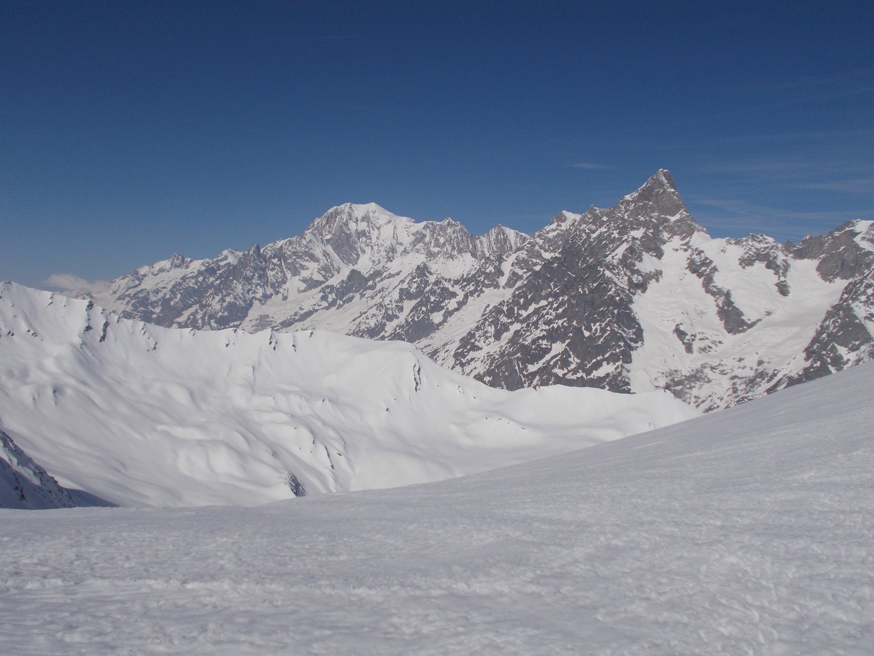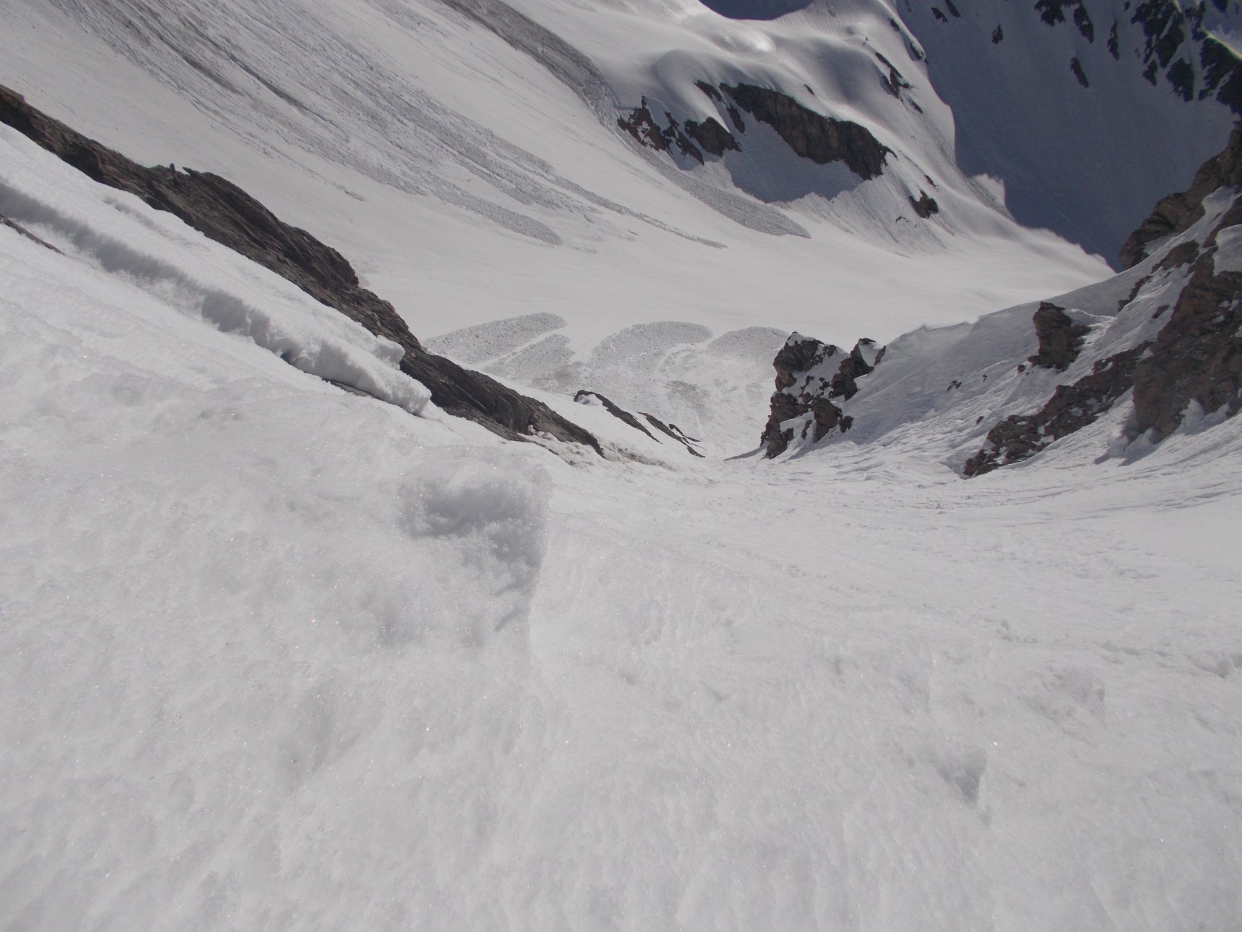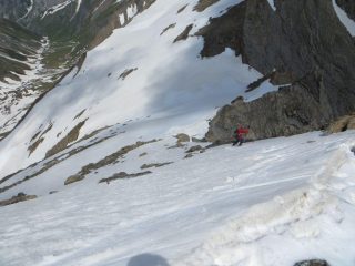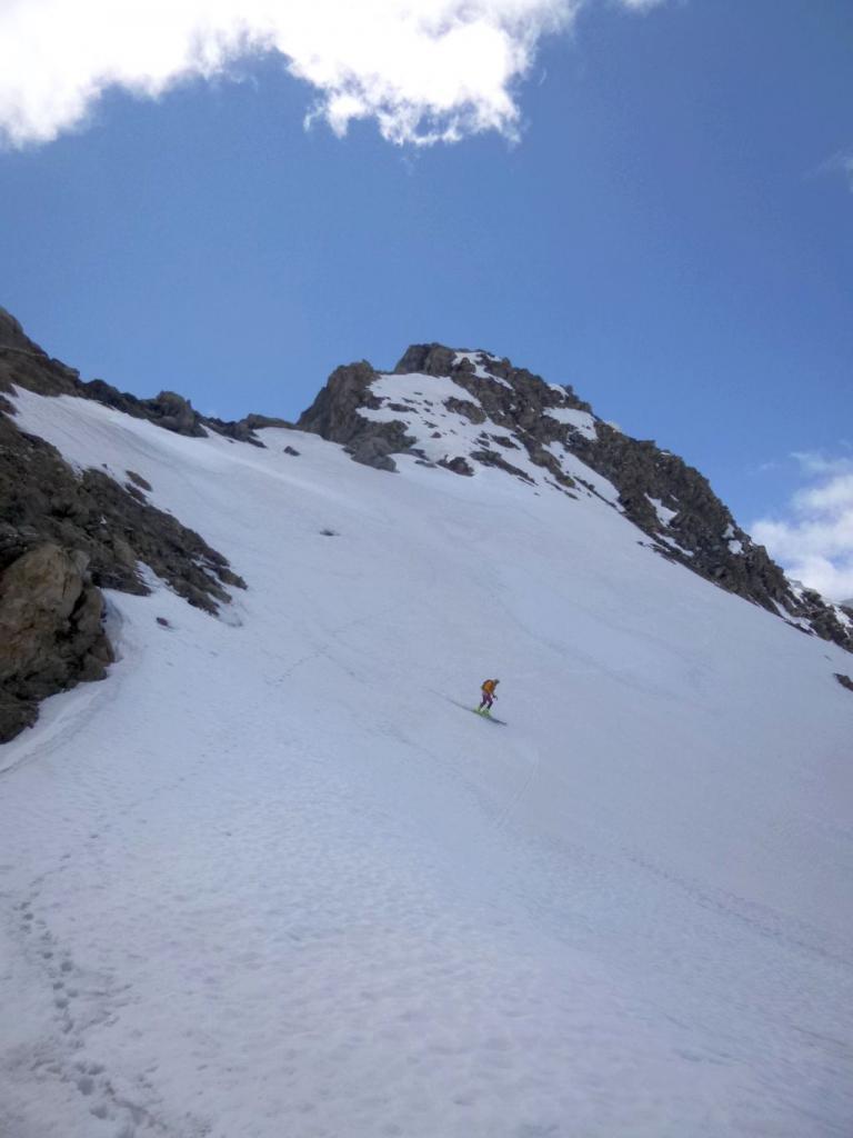 Dal colle piegare a sx e continuare su neve per un tratto ripido (40°-45°) in direzione Sud seguendo la dorsale Nord dell’Aiguille de Belle Combe sul lato Ovest (lato Belle Combe).