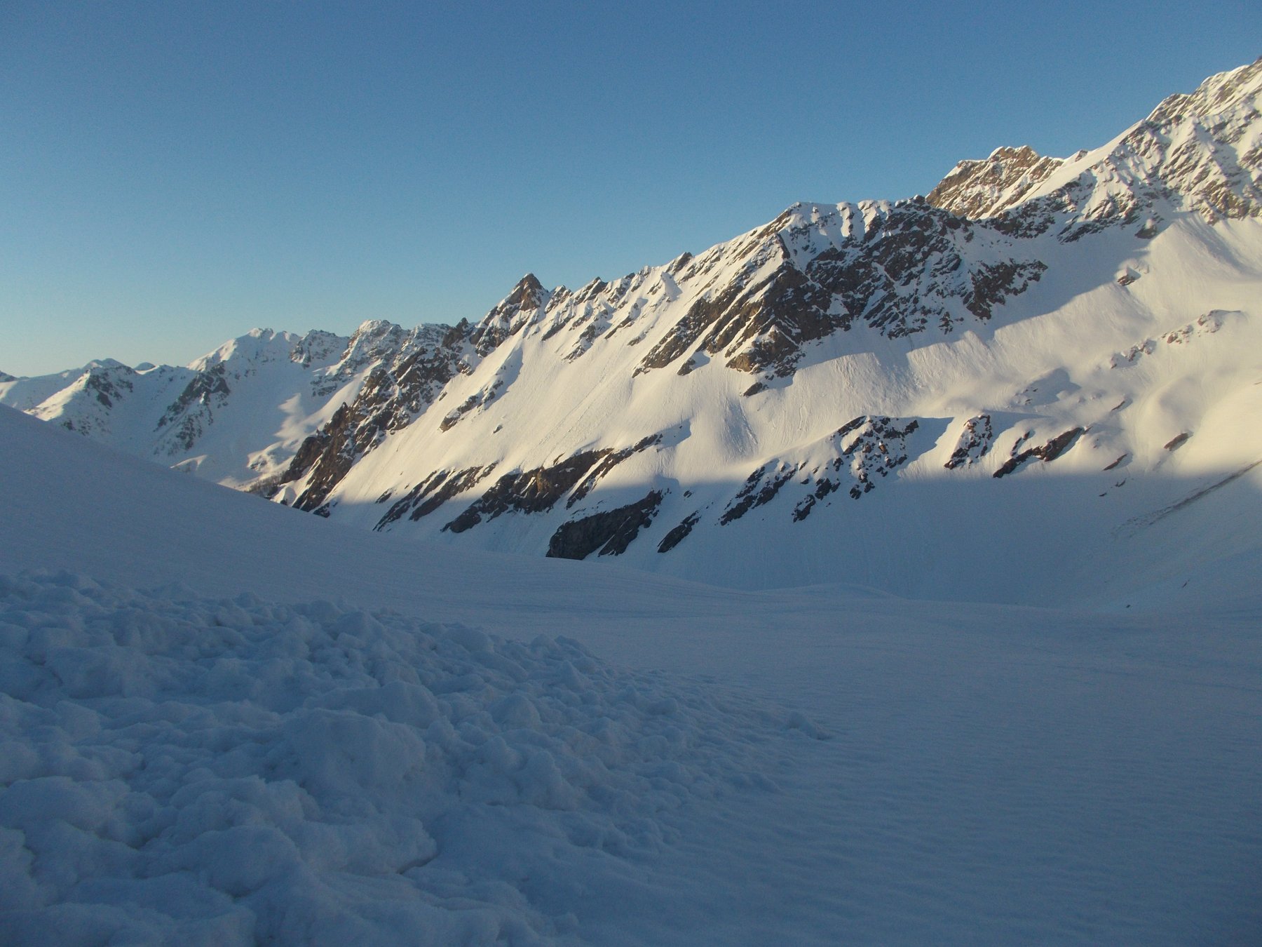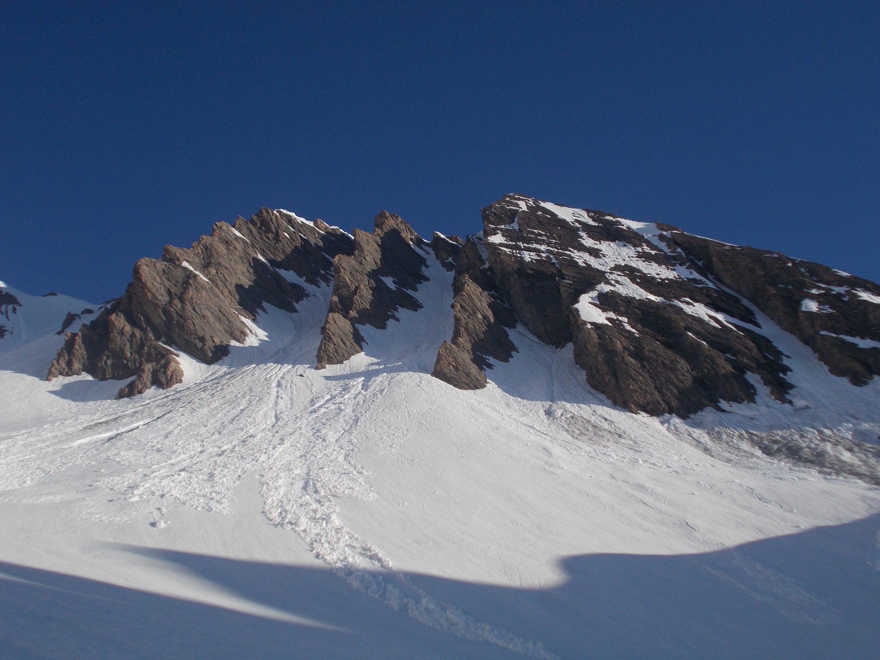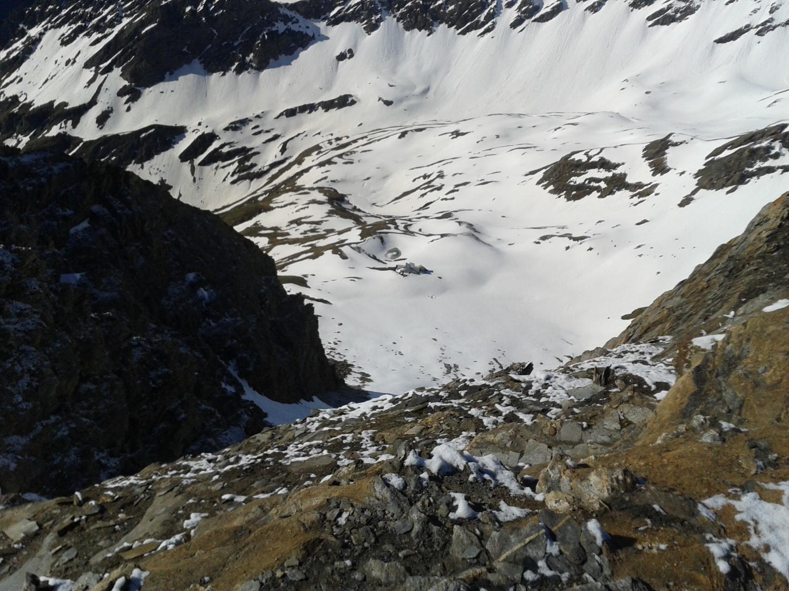 Dal colle piegare a sx e continuare su neve per un tratto ripido (40°-45°) in direzione Sud seguendo la dorsale Nord dell’Aiguille de Belle Combe sul lato Ovest (lato Belle Combe).
