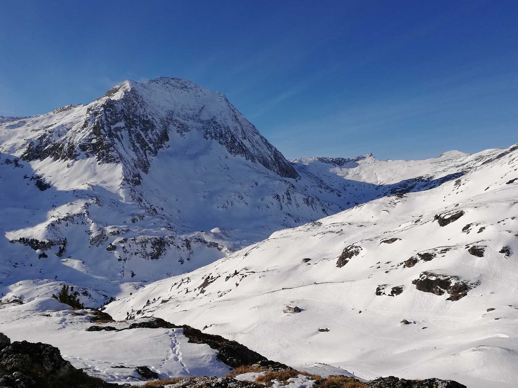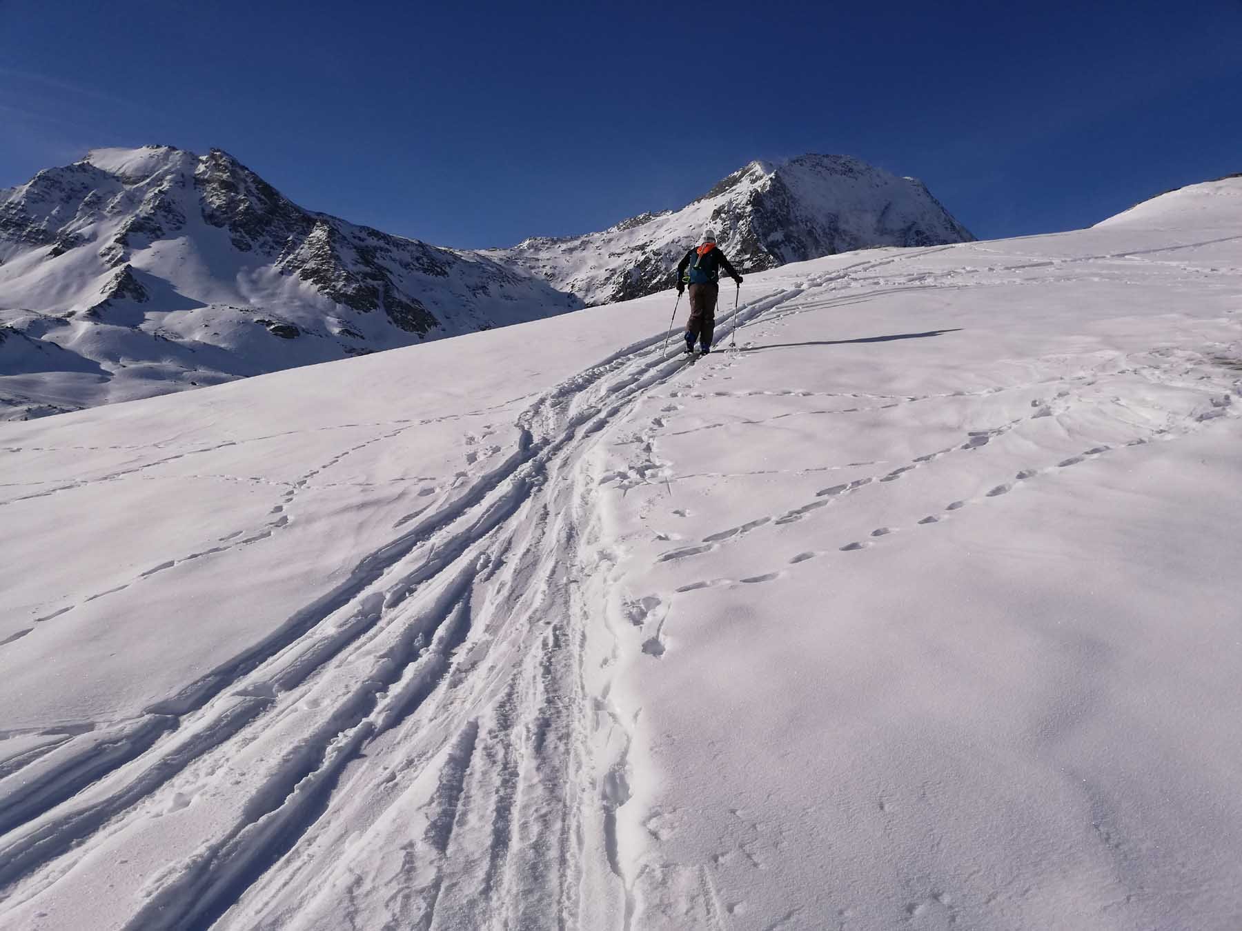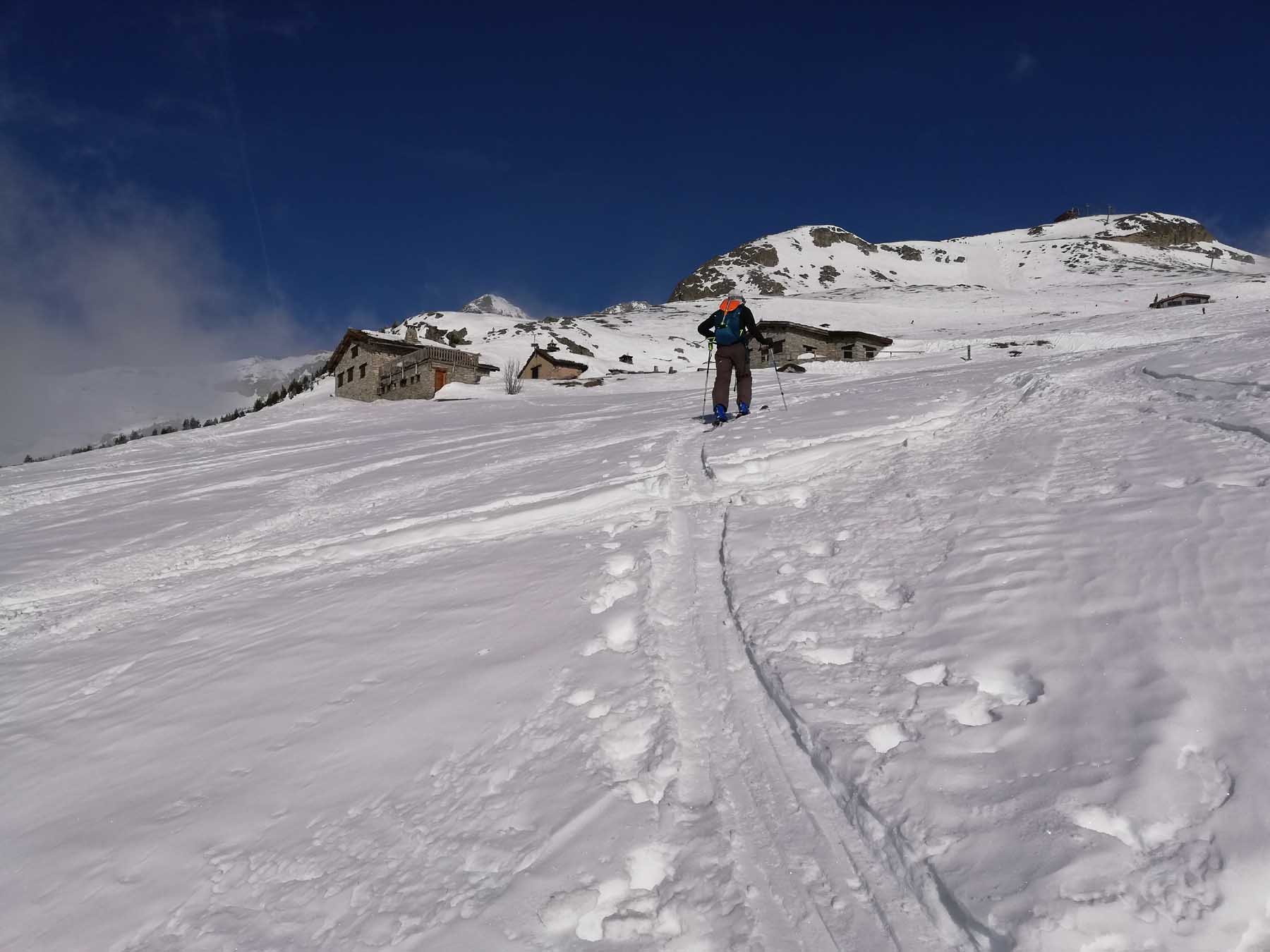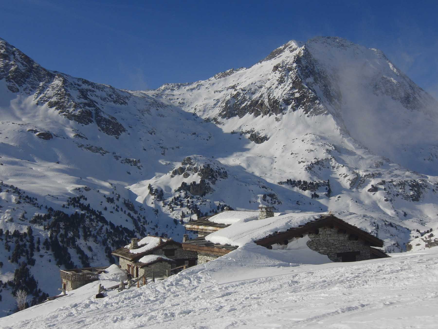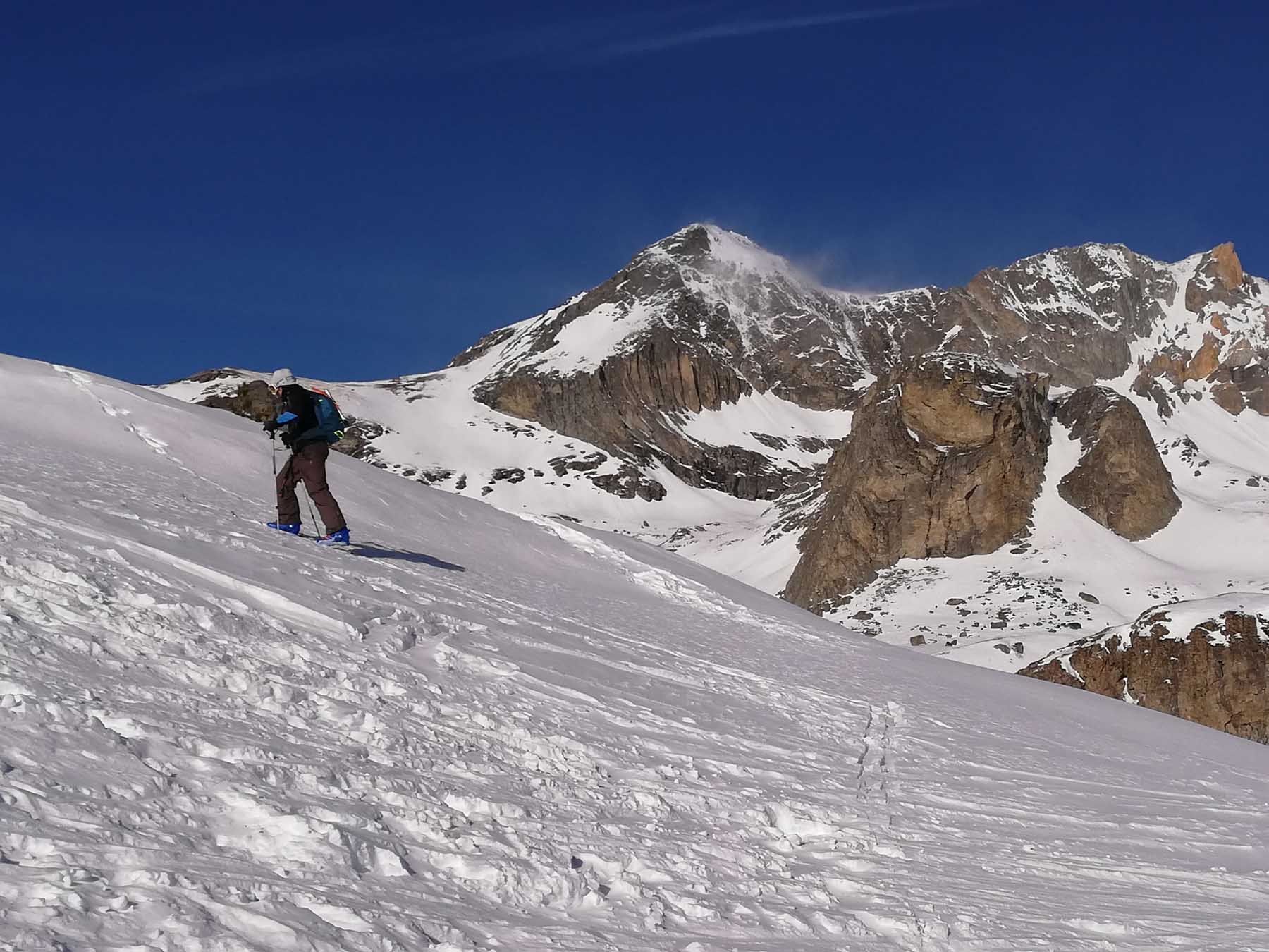 Discesa nella parte alta sull’itinerario di salita e sotto a Plan Sec sulle piste o lateralmente ad esse fino ad Aussois.