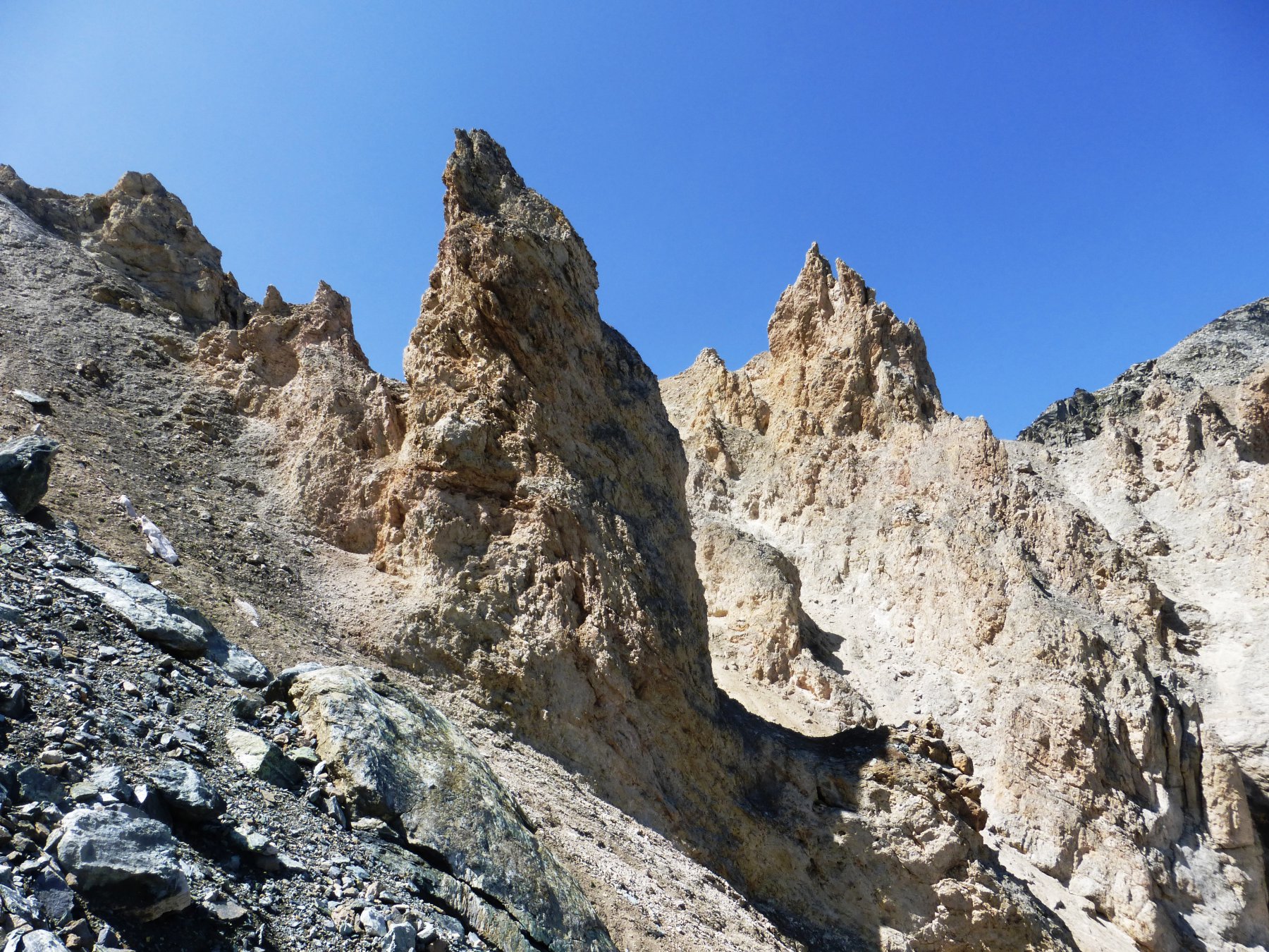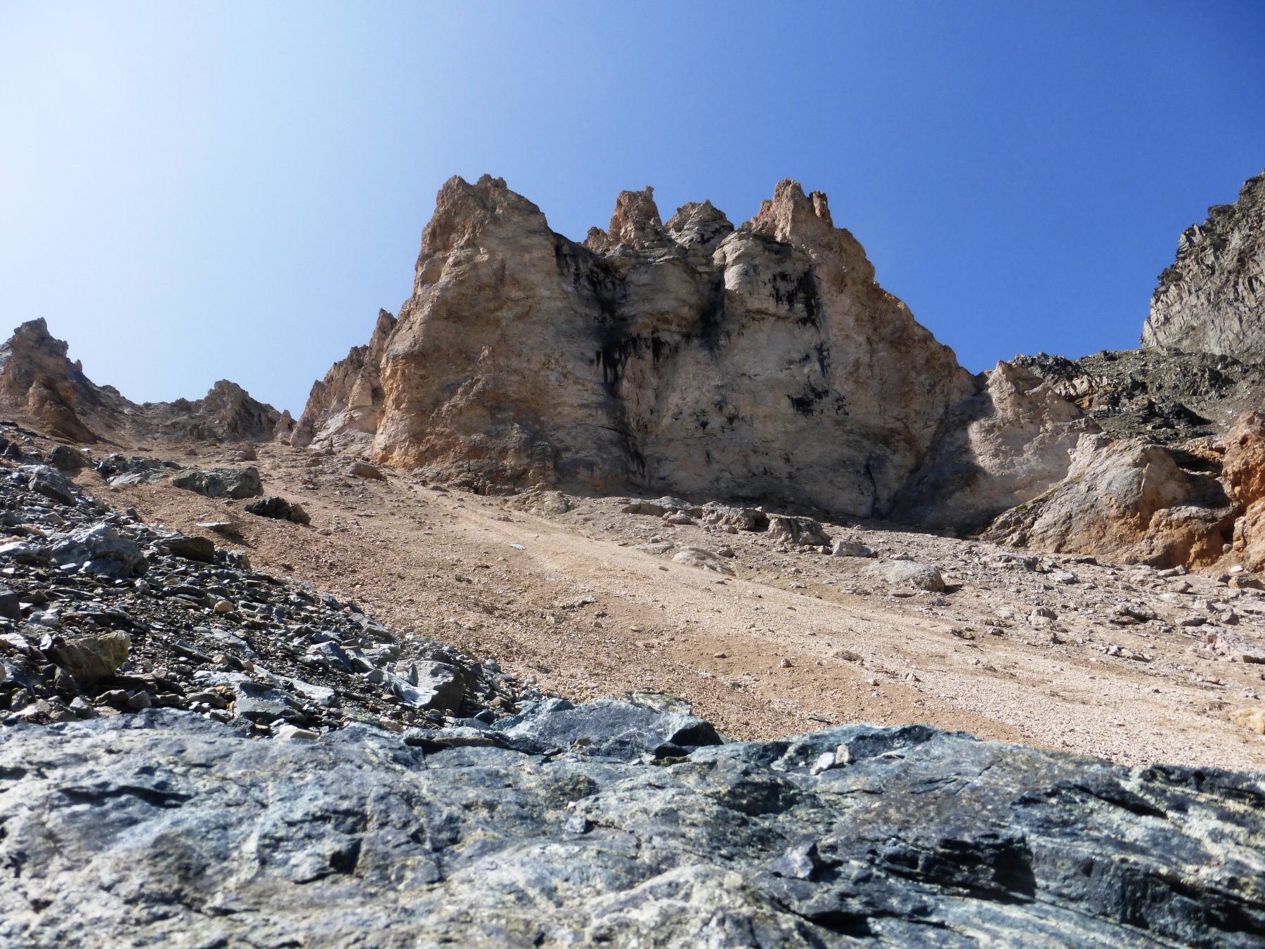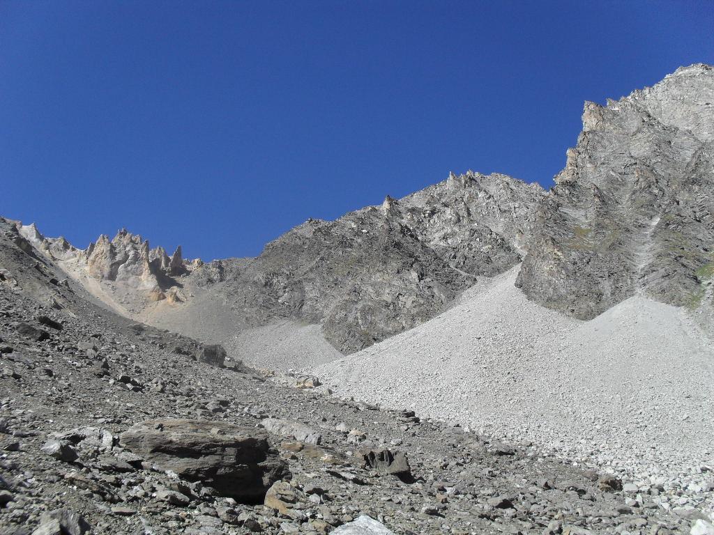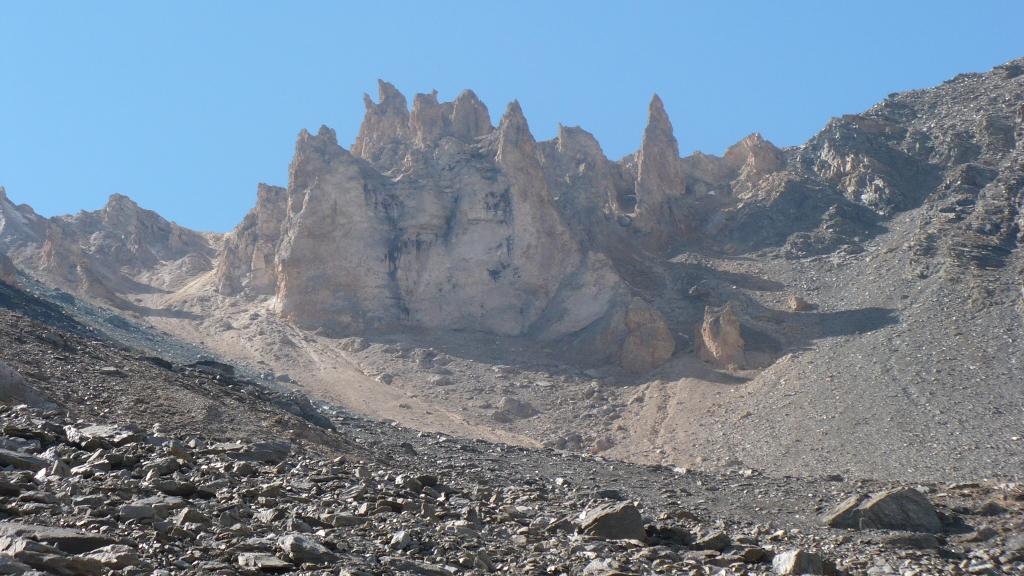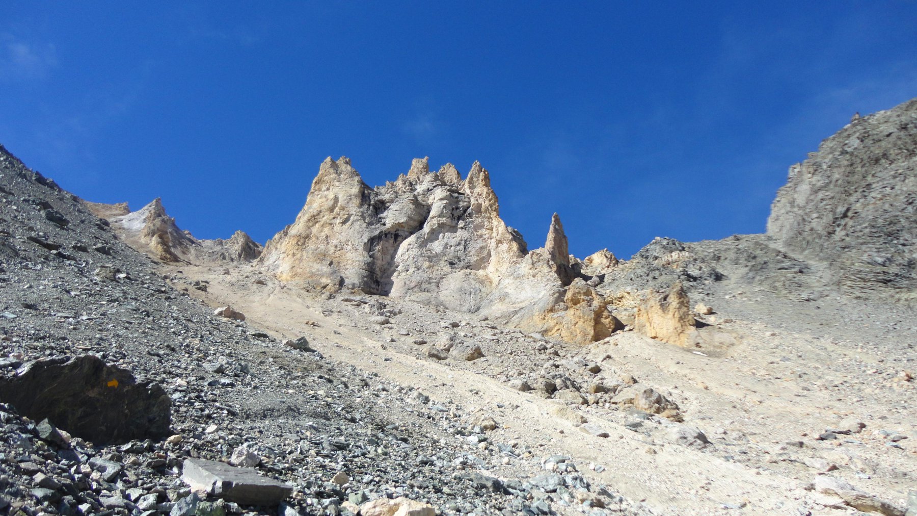 Si prosegue ,mirando a sinistra delle guglie color terra di siena,senza percorso obbligato ma molto faticoso specie nel tratto finale molto ripido e morenico,fino al raggiungimento dell’ometto del colle di Belleface