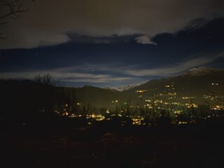 Salito in serata passando dalla chiesa di San Giorgio e dalla strada dei Piloni. Stasera la luna finché non si è annuvolato, permetteva di tenere spenta la frontale.