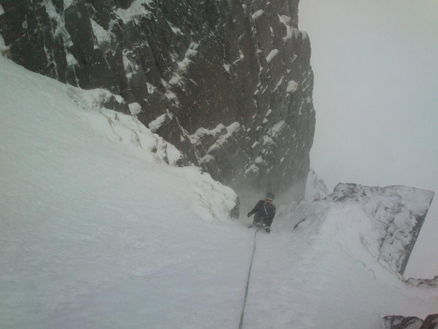 Facile canale con pendenze di 50° max che in condizioni di brutto tempo può comunque essere una bella avventura essendo abbastanza lungo (circa 500m di dislivello). Al primo bivio tenere la dx poi a sx al secondo bivio per traversare di 50m a dx prima di sbucare sull’altopiano della cima. Attenzione a eventuali cornici. Dalla cima scendere per 15 min finchè non si trova un canale con un grosso ometto di pietra. Scendere questo canale max 45° (Number 4 Gully) che in breve riporta alla base della parete nord.