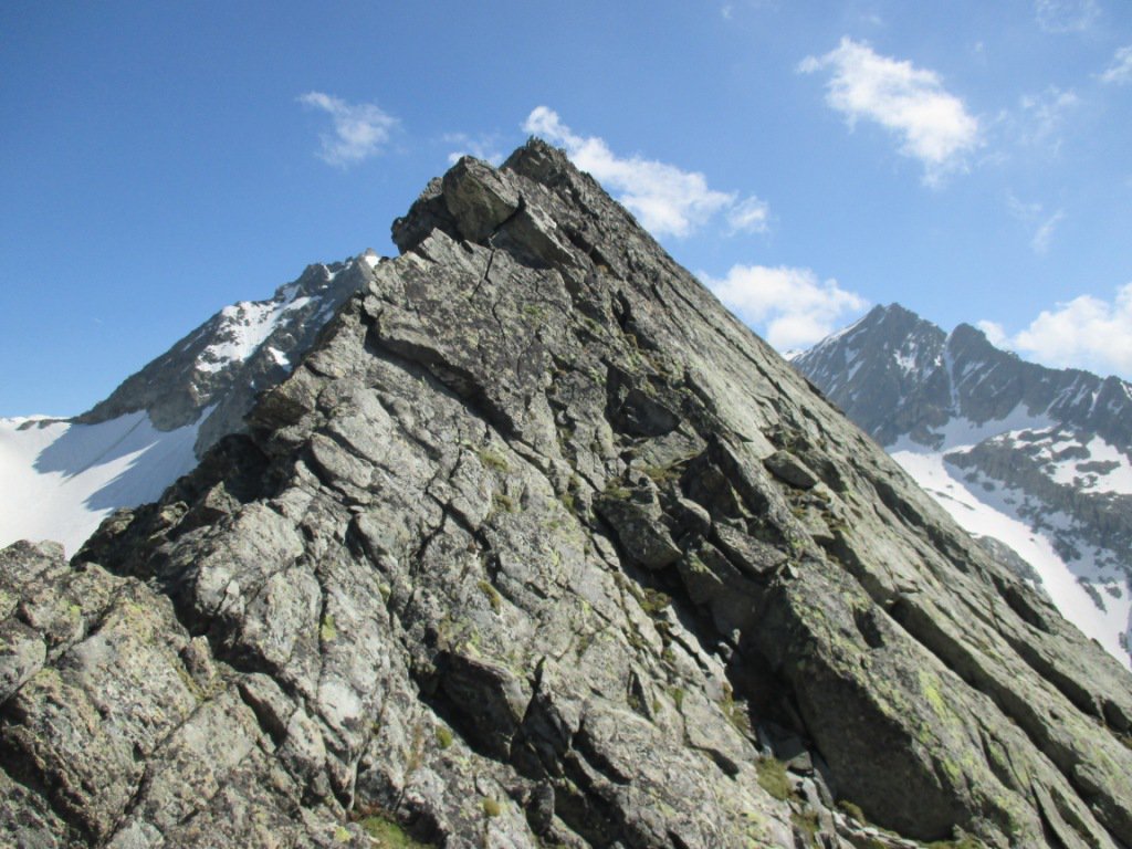 Dal col Berlon si salgono belle placche fino ad una spalla orizzontale poi per rocce fessurate fino in punta, passaggi di II°.