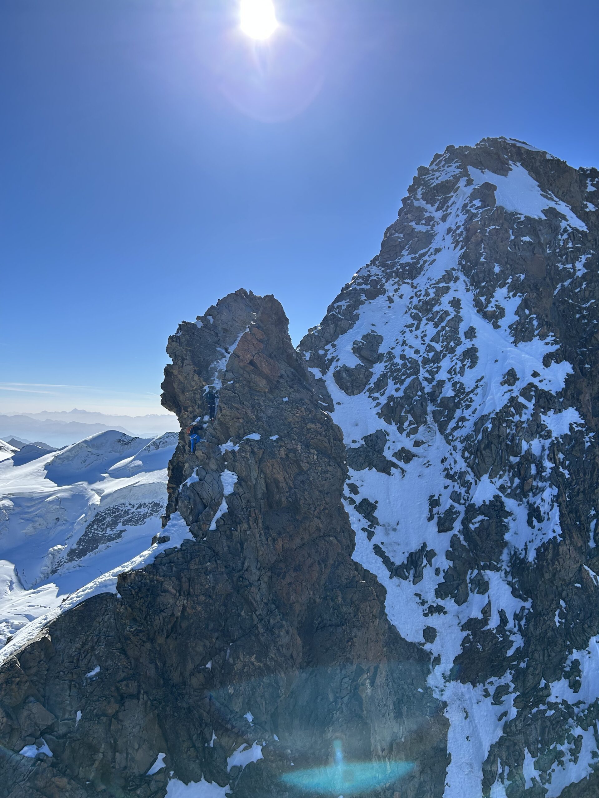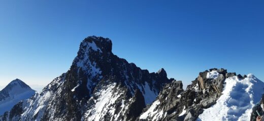 Partiti pomeriggio tardi dalla stazione di Pontresina (per via del grande traffico in strada), non abbiamo potuto usufruire del calesse perché bisogna prenotarlo almeno un giorno prima. Senza calesse sono 12 km e 800 m di dislivello, con il calesse 6 km e 600 m. Arrivati alla Chamanna de Tschierva giusto per la cena che è alle sei e mezza, bellissimo rifugio(2 ore e 30 circa).Il secondo giorno la colazione e alle tre ma secondo me troppo tardi come orario se si vuole fare tutto in giornata. Noi siamo partiti verso le 4 meno un quarto seguendo in sentiero ben segnalato dietro la Chamanna fino a quota 3100 dove inizia il piccolo ghiacciaio, lo si attraversa fino a quota 3250 dove ci sono due opzioni: a destra il pendio di neve a 45° più diretto oppure a sinistra è stata allestita una ferrata. Noi abbiamo fatto la ferrata perché il pendio a fine stagione non è in condizione. Finita la ferrata si arriva alla Fuorcla Prievlusa 3430 dove inizia la cresta rocciosa e con passi di 2°, 3° e qualche 3+ si arriva all ultimo torrione che si aggira in basso sulla sinistra e si arriva sulla parte bassa della cresta nevosa della Biancograt. Passando qualche pezzo ghiacciato siamo arrivati sul filo di cresta e seguendola tutta siamo arrivati in punta al Piz Bianco (6 ore circa). Da qui inizia la cresta per arrivare al Piz Bernina ,ci siamo tolti i ramponi e con qualche passaggio si secondo e di terzo siamo arrivati alla prima calata da 25 m circa. Da qui continuando con qualche altro passaggio di terzo e due di quarto siamo usciti in punta al Bernina(2 ore).Da qui inizia la vera odissea di discesa… scendendo la cresta della via normale fino ad arrivare alle due ultime calate che ti portano al ghiacciaio sopra il Marco e Rosa (1 ora e 30). Poi seguendo la traccia sul ghiacciaio tra vari sali e scendi (200 metri di risalita) siamo arrivati alla cresta della Fortezza (3482) qui abbiamo disarrampicato e fatto tre doppie. Poi da 3100 seguendo la pietraia siamo arrivati al ghiacciaio lo abbiamo attraversato tutto fino ad arrivare ad un altra pietraia (da qui se si va a destra per il ghiacciaio si può andare a prendere la funivia del Diavolezza altri 250 m d+, l ultima è alle 17) noi abbiamo continuato a scendere verso valle seguendo gli ometti e a 2700 abbiamo seguito un bellissimo sentiero fino a 2400. Qua c’è il torrente che entra nel ghiacciaio, l unica soluzione è stato risalire sul ghiacciaio aperto e scendere fino a 2200 praticamente al buio. Finito il giacchiaio abbiamo sbagliato andando a destra e siamo tornati indietro (bisogna andare a sinistra seguendo il torrente) da qui un segnalatissimo sentiero e poi poderale fino 1900 dove c’è la stazione dei treni di Morteratsh che ovviamente era chiusa perché l ultimo treno e alle 19 e 30. Noi siamo arrivati alle 21 e 40 (circa 9 ore e 30 dalla punta ). Probabilmente un po’ di tempo l abbiamo perso nelle calate perché eravamo in quattro con due cordate ma comunque sia la biancograt fatta così è veramente lunga. Ho voluto scrivere tutto precisamente perché in tutte le relazione o si fermano al Marco e Rosa o non sono chiare le tempistiche . E stata dura ma stupenda