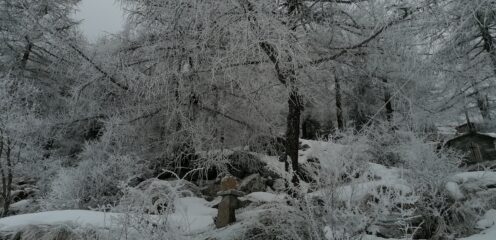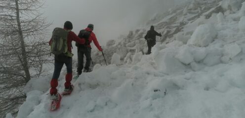 Partiti da Ruz sotto una fitta nebbia con le piante piene di galaverna. Saliti lungo la stradina tutta innevata. Dopo ca dieci minuti di salita ci siamo accorti che erano necessarie le ciaspole che avevamo lasciato in auto e siamo tornati a prenderle. La stradina è tutta innevata. Bisogna attraversare alcune valanghe ma si passa senza problemi. E’ comunque da tener ben presente che questo percorso non è da affrontare dopo copiose nevicate per il pericolo di valanghe visti i ripidi pendii che la stradina attraversa più volte. Meglio salire sul sentiero per ciaspole che parte dalla frazione Moulin (cartelli rossi). Verso duemila metri la nebbia si è dissolta e un bel sole ci ha permesso di ammirare stupendi panorami. Dopo una corposa pausa all’alpe scesi sullo stesso itinerario.