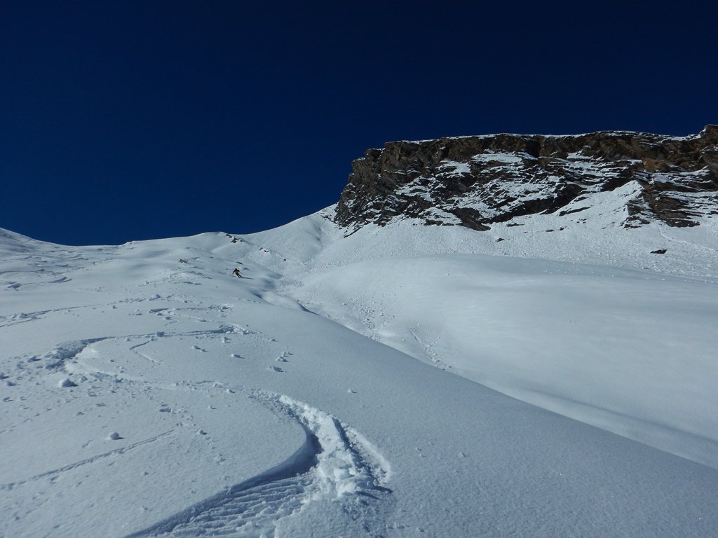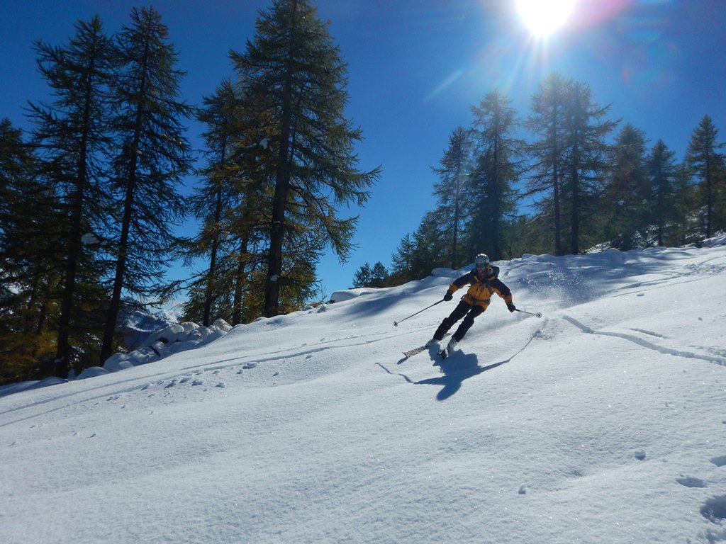Anche qui la pioggia, come un pò ovunque, ha creato quel malefico strato di crosta sino a 2100 che solo in pieno sole ha mollato; più in alto, dove anche venerdì è sempre nevicato, neve ben sciabile ed abbondante (dai 35 cm. in basso a 60/70 in quota). Dalla stazione di arrivo della seggiovia saliti brevemente al colletto in direzione delle rocce dell’Andelplan trovando bella neve a nord sino all’incrocio del pistone, di lì in giù mix di crostata e polenta da fare indigestione, ma in salita ci eravamo già preparati psicologicamente. Oggi relativamente poche persone ma alla fine i binari, sul pistone, erano parecchi e profondi…