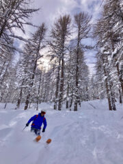 -1° C e nevicata in esaurimento alle 10:30 al parcheggio, 60 cm caduti nelle ultime 48 ore per un accumulo totale di un metro e mezzo. Nonostante le condizioni proibitive delle strade, raduno di quasi tutti gli skialper del cuneese e traccia battuta tipo autostrada. Al fondo della stradina, dopo la fermata intermedia della vecchia seggiovia, fine dei giochi: dai pendii che sovrastano l’ampio pistone finale si staccano enormi valanghe a lastroni solo a guardarle (pare che in tre siano rimasti sepolti fino alla vita, senza tragiche conseguenze). Cambio di assetto e ci buttiamo nei boschi in un quantitativo di polvere pesante difficile da stimare: il bastoncino scompare completamente senza toccare il fondo della scorsa settimana. Tanto divertimento in massima pendenza con baricentro indietro e punte fuori, a patto di avere sci larghi a sufficienza. Molti si sono piantati, preferendo fare la traccia di salita a ritroso.