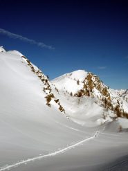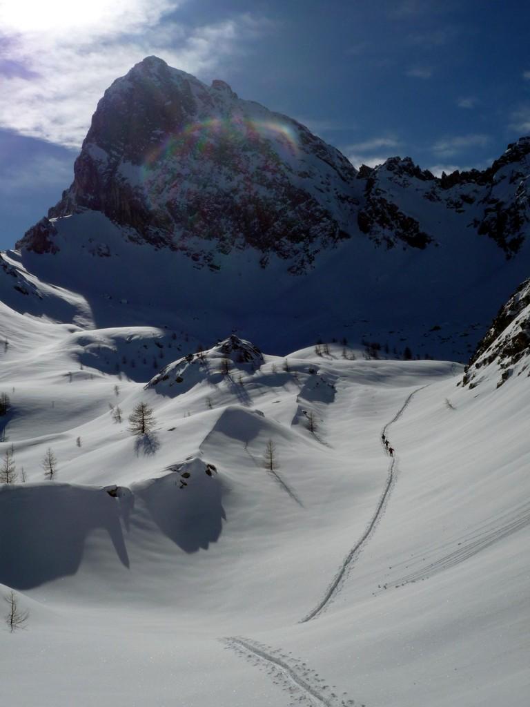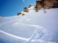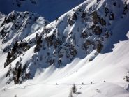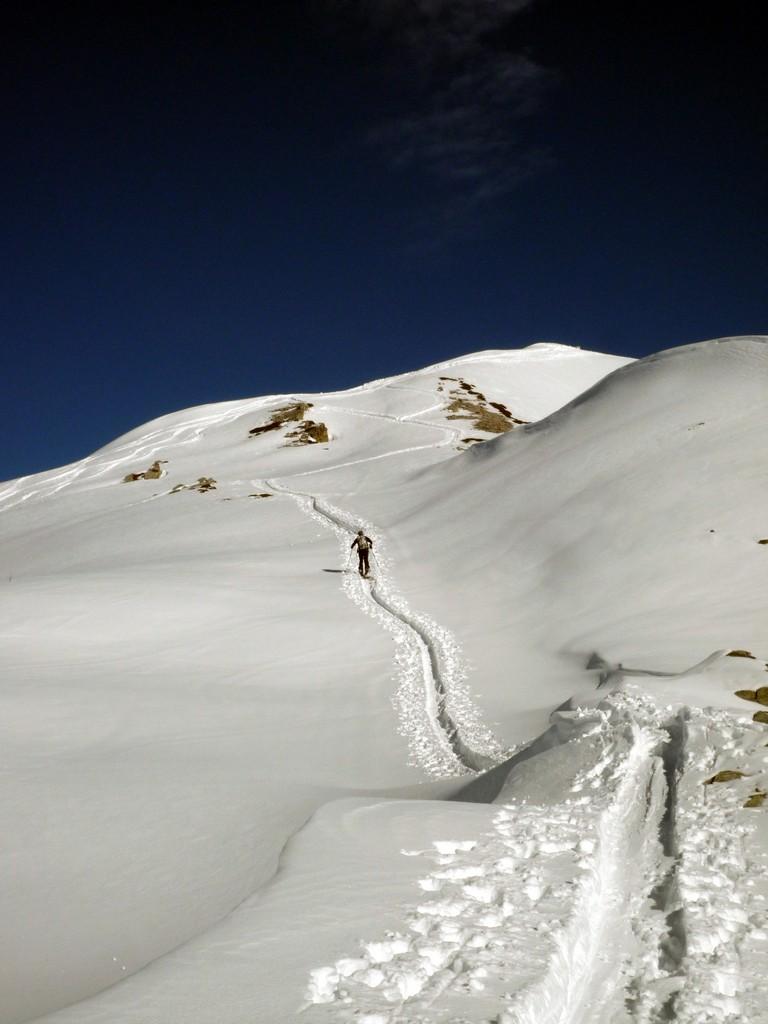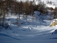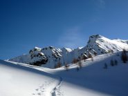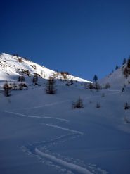 Scendere al colletto tra la quota e rocca la meja, scendere il ripido pendio sottostante(circa 100 metri di dislivello)ed effettuare un traversone per portarsi sopra in pianoro sottostante il monte la bianca.