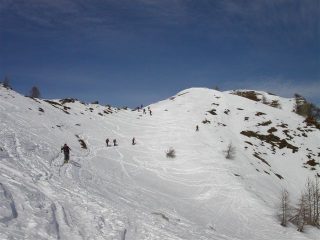 bella passeggiata invernale con temperature primaverili e un po’ di vento in vetta … la parte bassa in parte lungo la strade è ormai ben battuta, la parte alta dato il rialzo termico presenta neve ormai pesante e non più molto divertente. Nella foto l’ultimo tratto salendo al cippo della vetta.