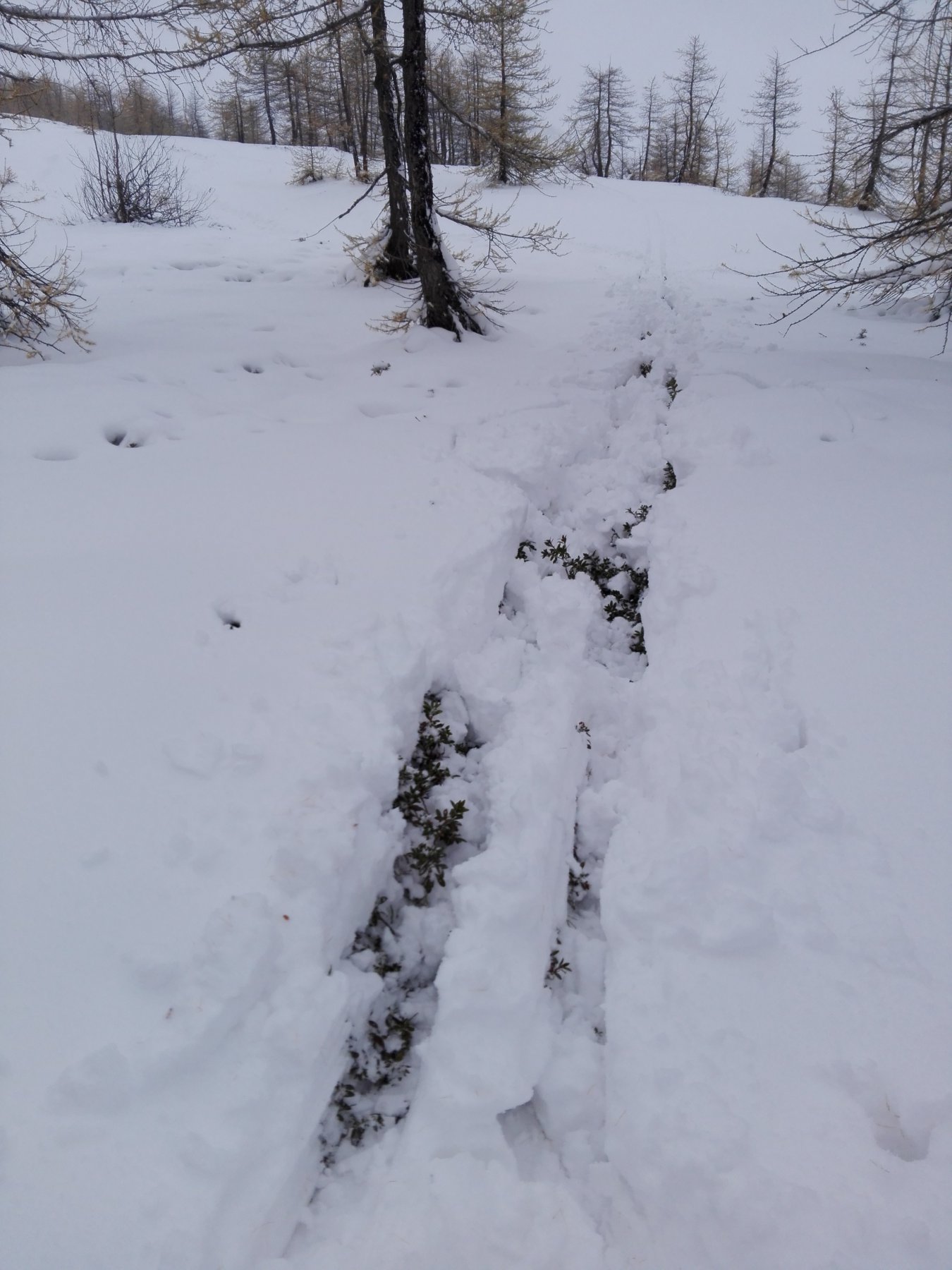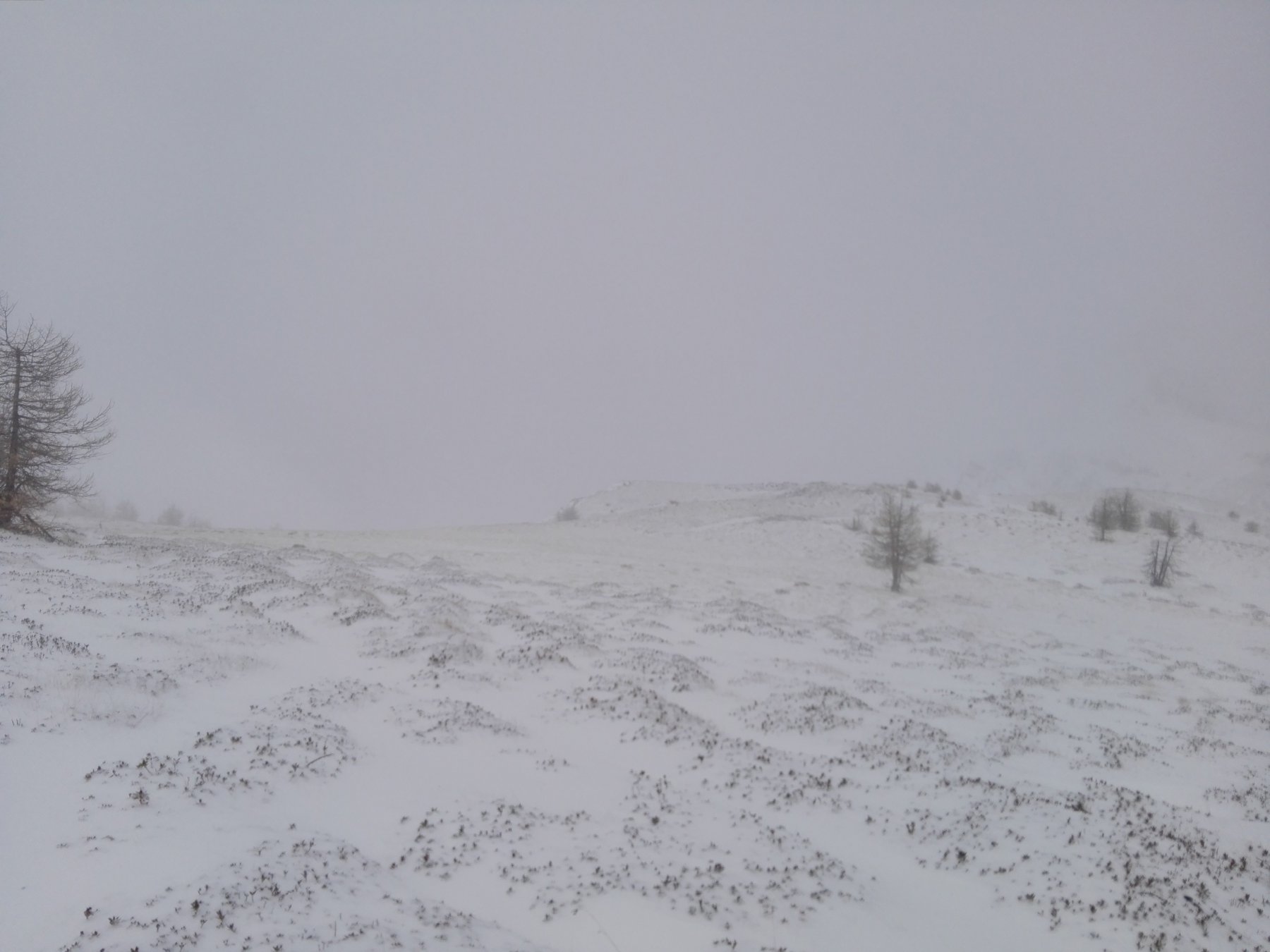 Sono partito – sci nello zaino – alle 13:15 con circa 20 cm di neve umida e un grado centigrado. oltre 2000 metri è difficile quantificare gli accumuli, a causa dell’azione eolica. In alto la bufera imperversava e oggi la vetta era soltanto per superduri alla Brusa, quindi mi sono fermato prima.