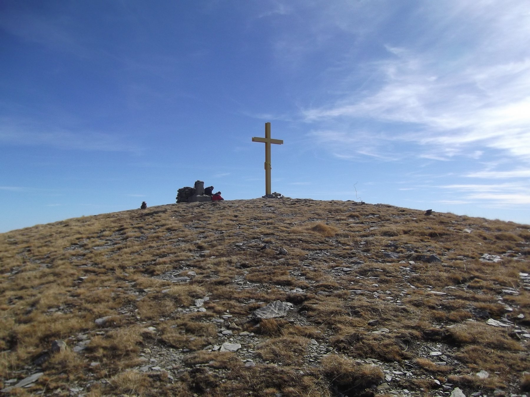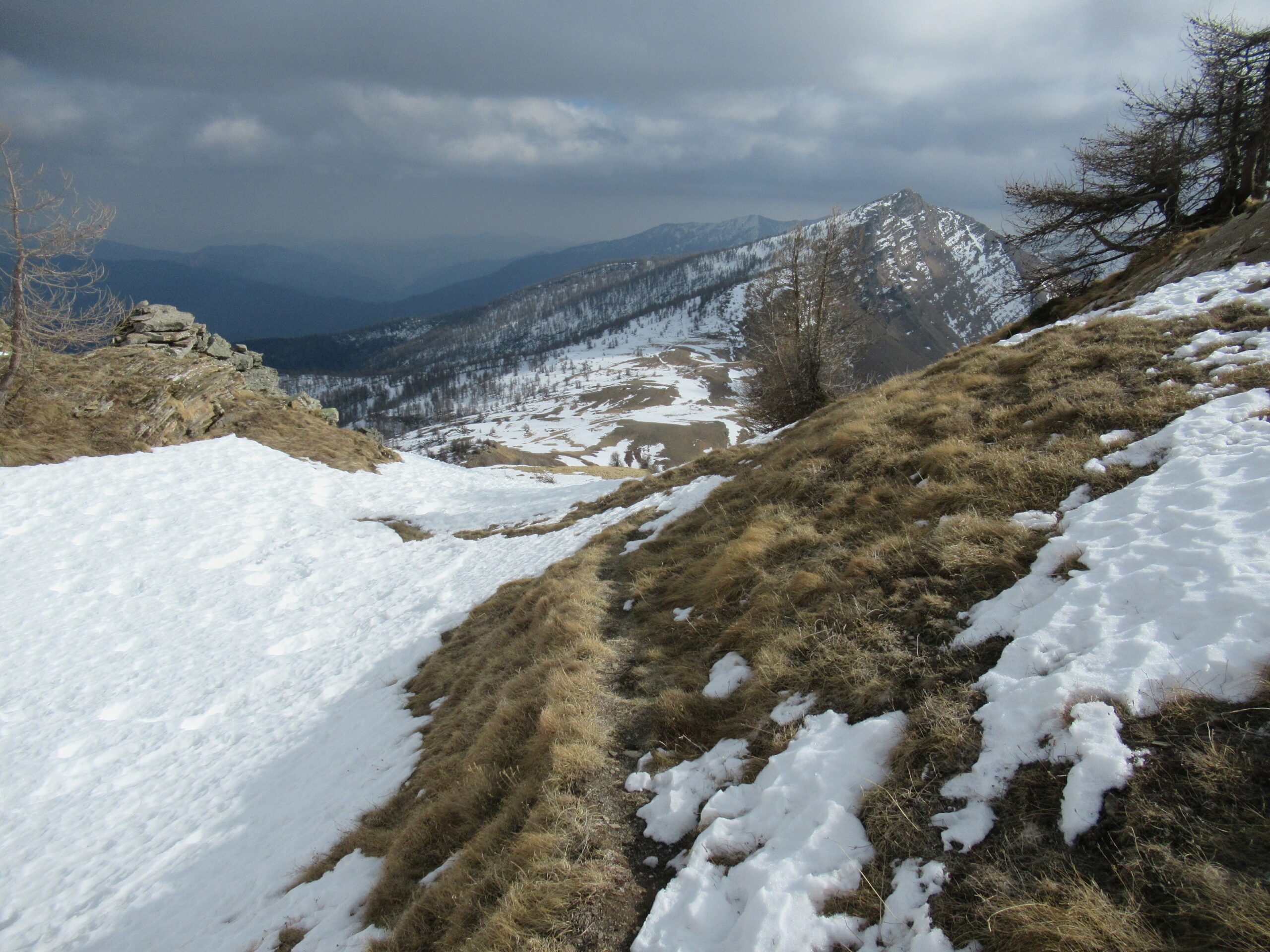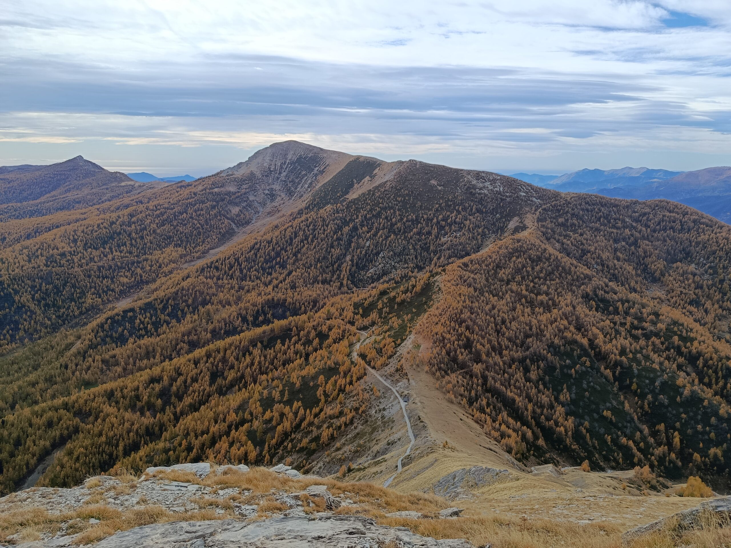 Per la discesa, si segue la cresta verso SE (ometti) per poi scendere fino alla Colla Rossa (m.2172) e li ad andare a sx per il sentiero ben segnato (bianco rosso) tra il lariceto fino alla Monesi Limone presso il Poggio Lagone dove esistono due possibilita’ di discesa.