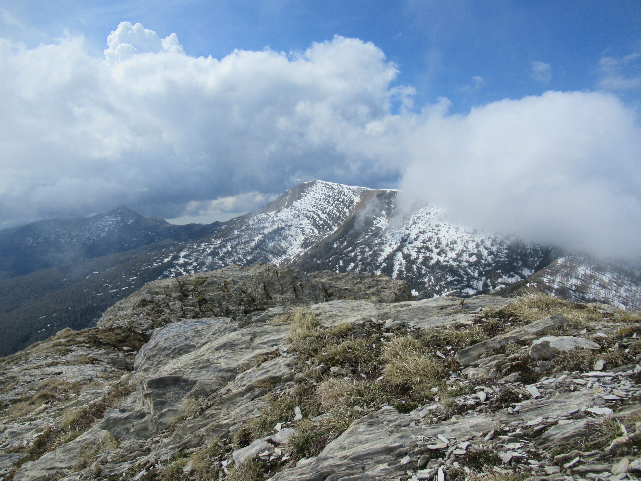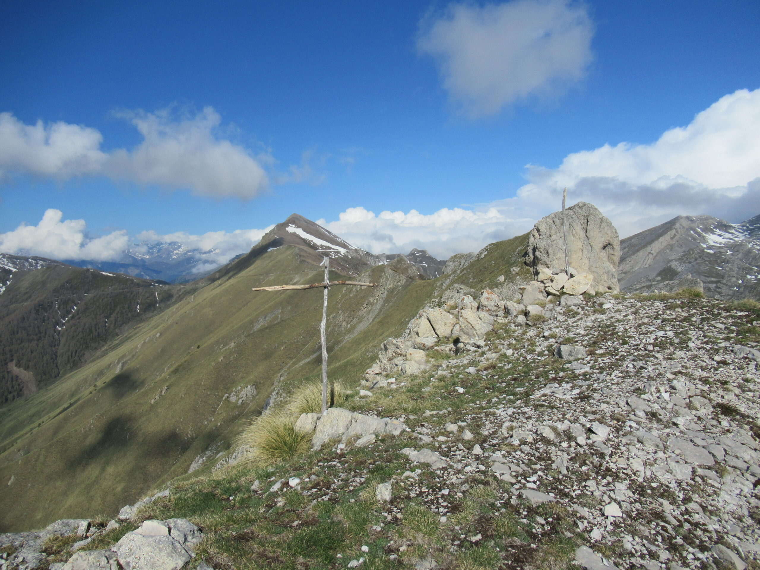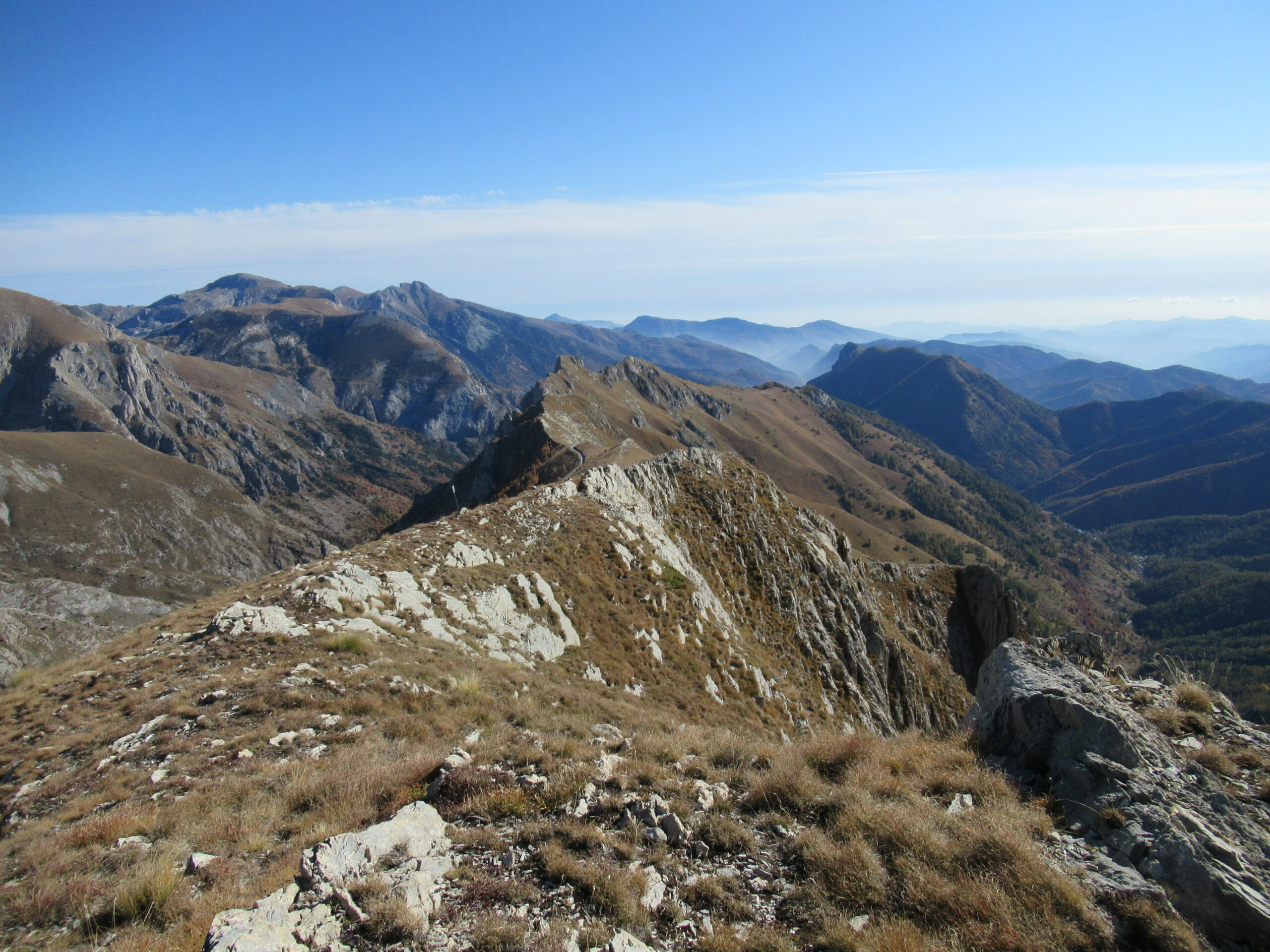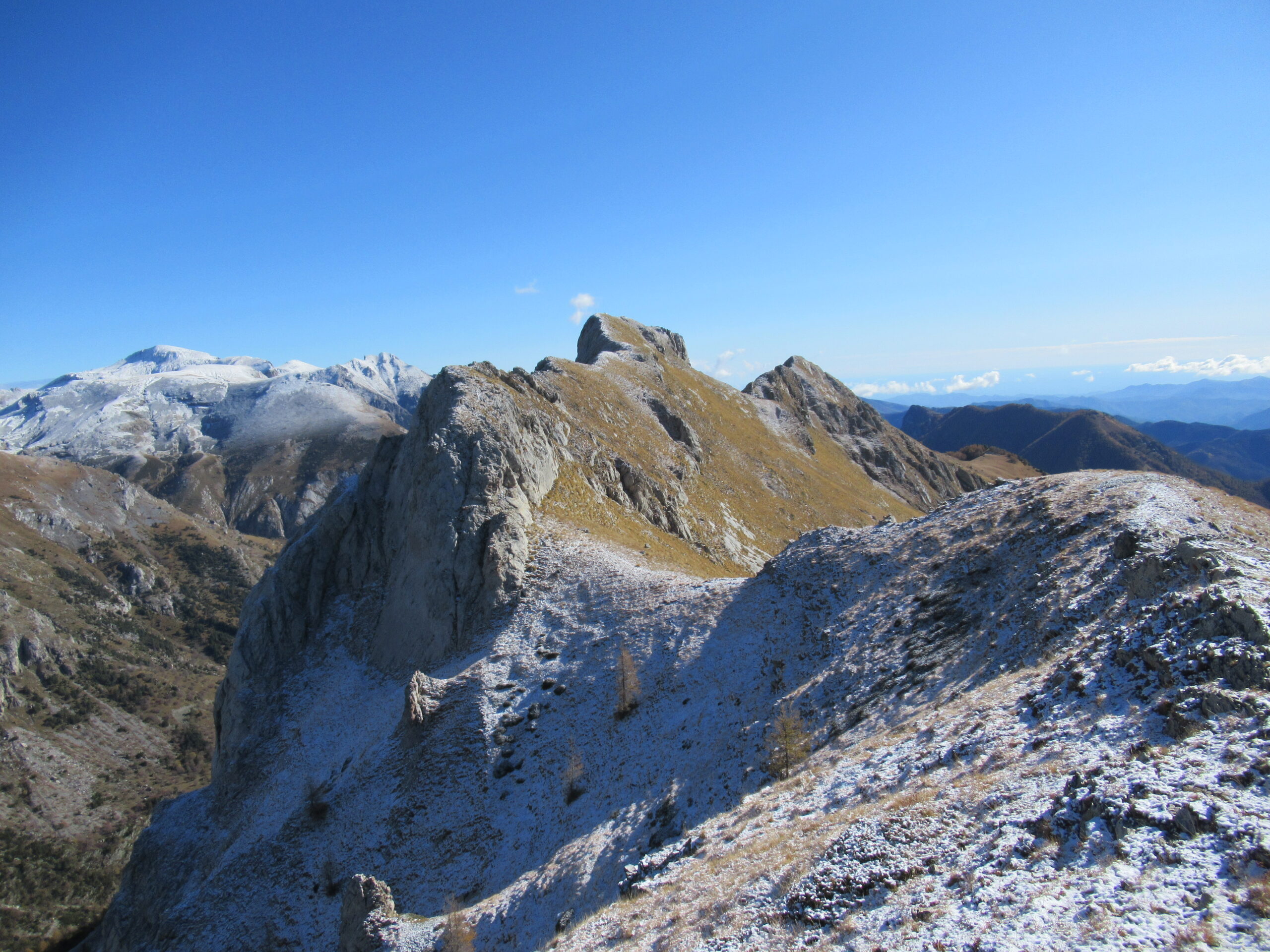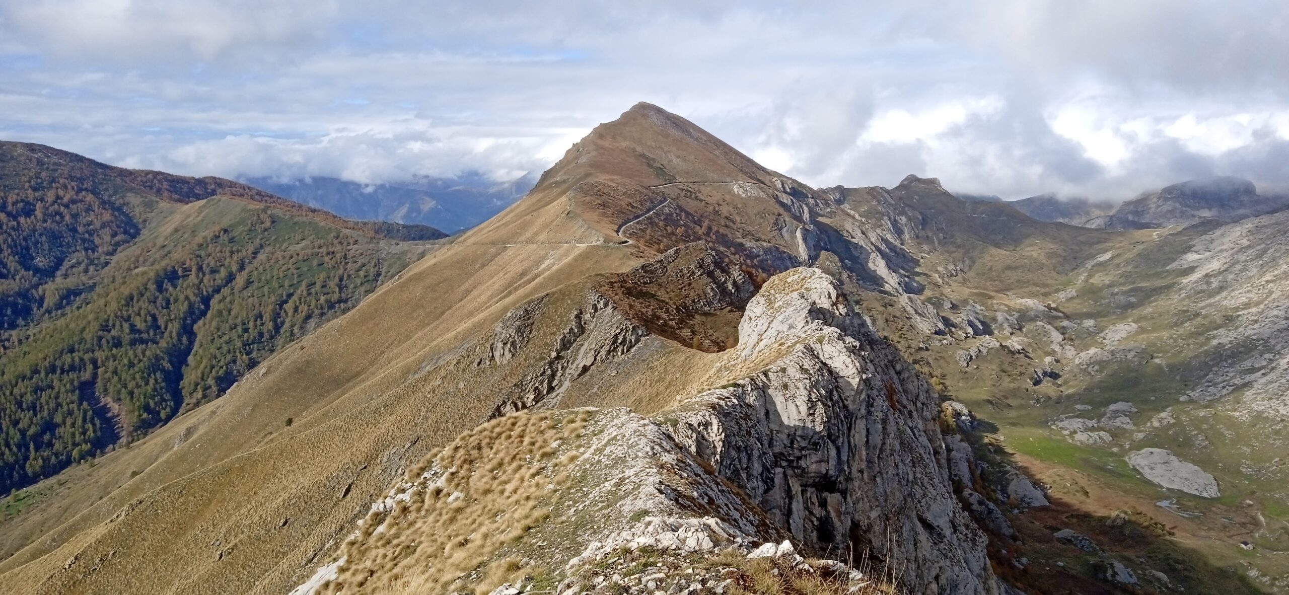 Da qui si prosegue presso il filo tra alcuni sali e scendi, arrivando al grande ripiano erboso e attraversato a tornare in cresta (bolli qua e la) e presso la quale a proseguire arrivando su Rocca del Fera’ (m.2220), quindi percorsa la cengia a nord o in caso di neve passando a sud, si torna in cresta e con breve deviazione a dx si raggiunge Il Fera’ (m.2245), per continuare presso la cresta attraversando la Monesi Limone e a proseguire la salita fino a Cima Pertega’ (m.2404).