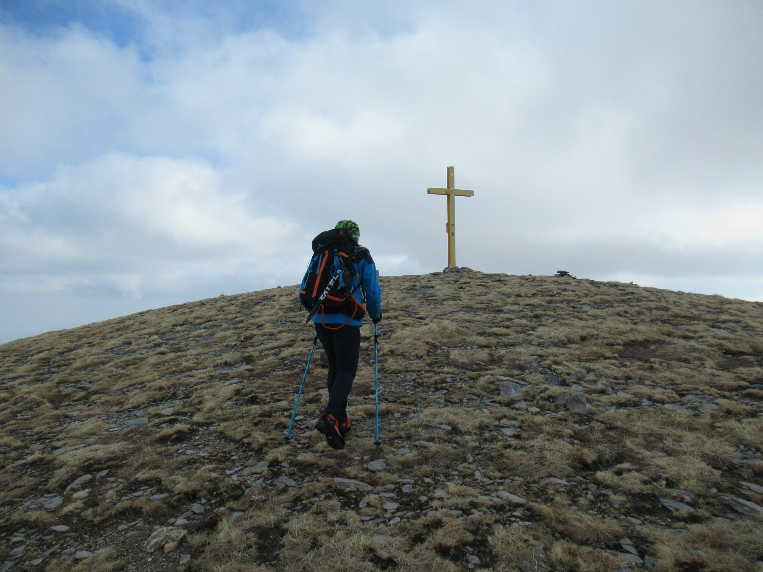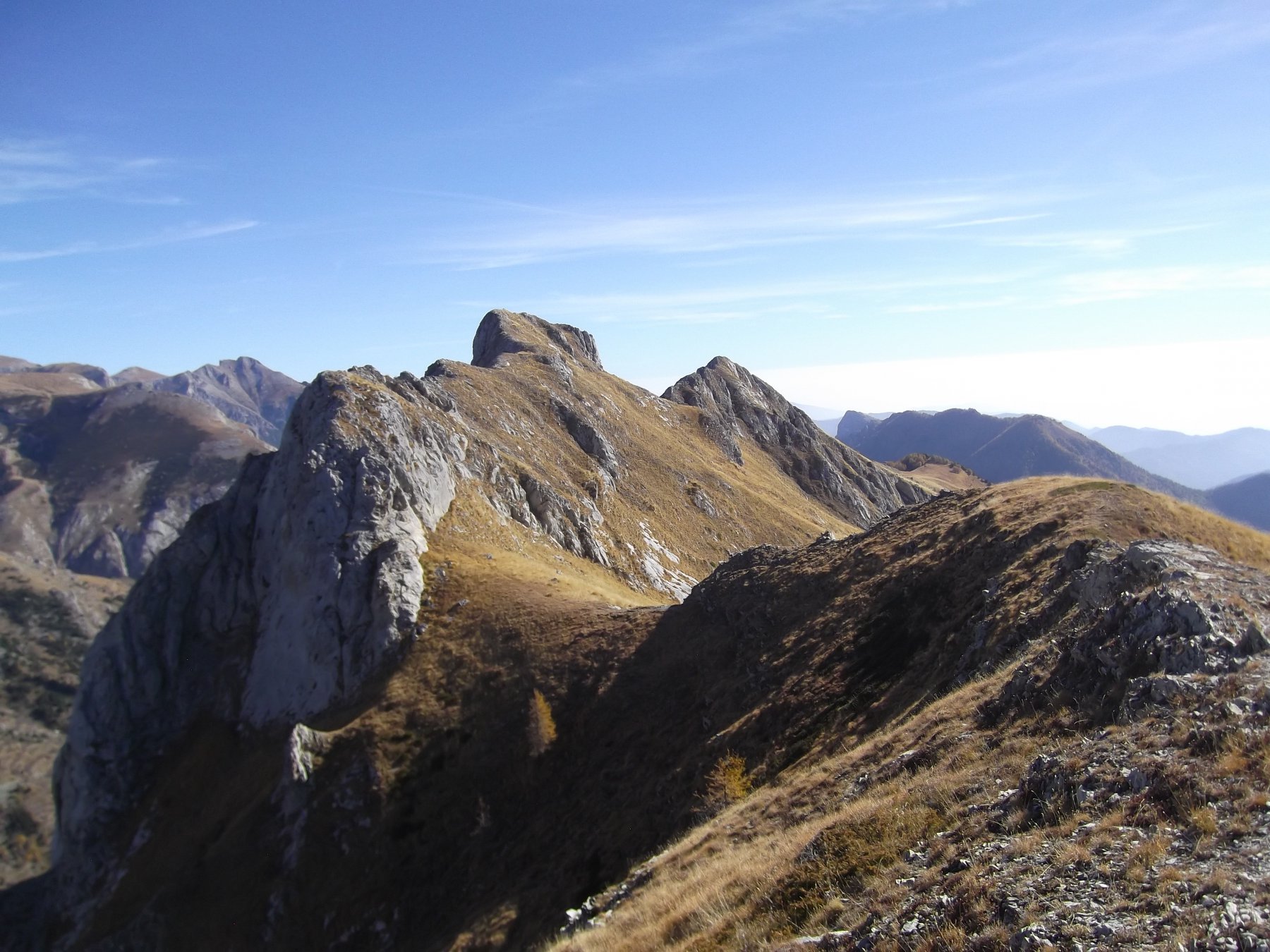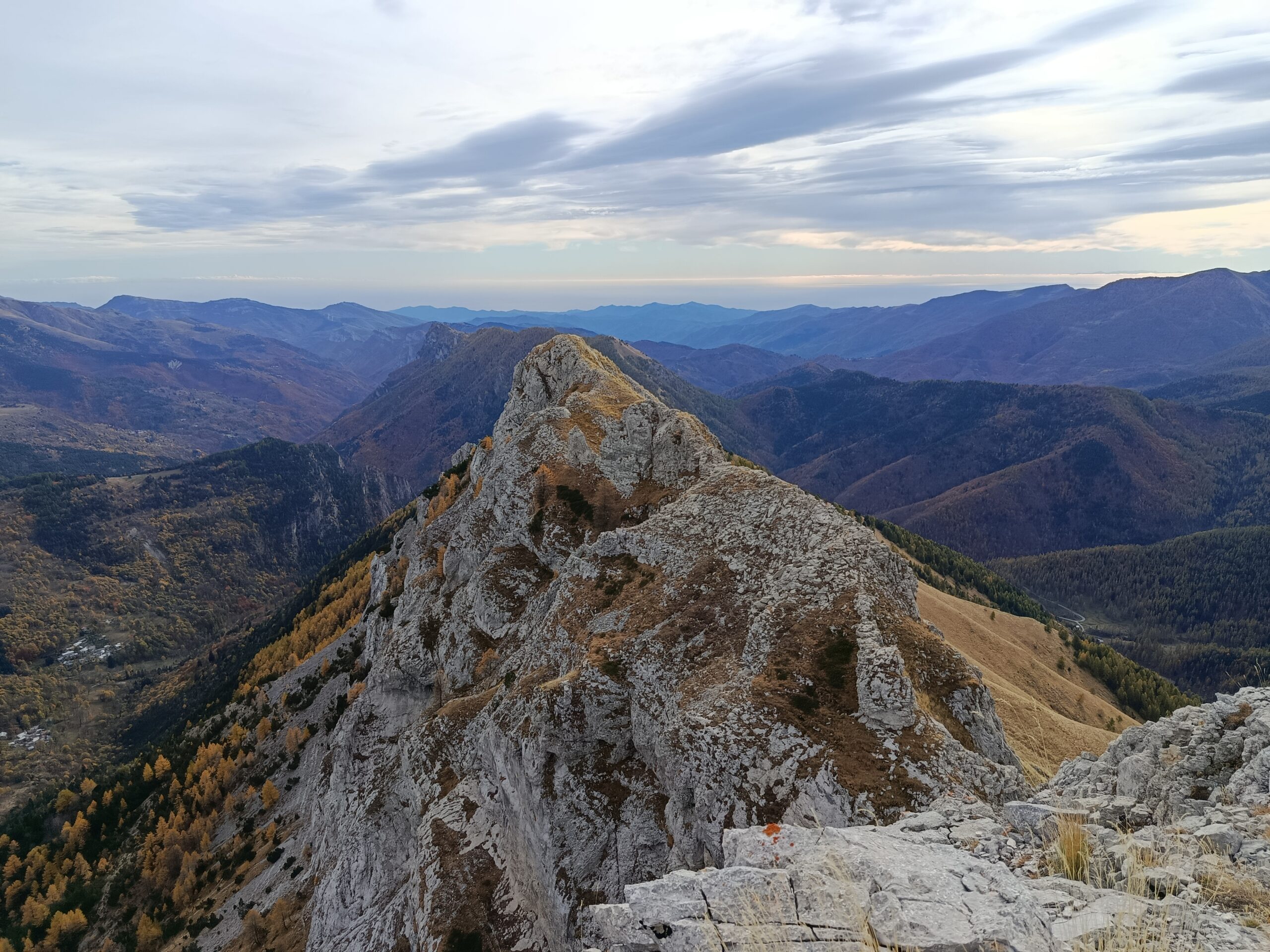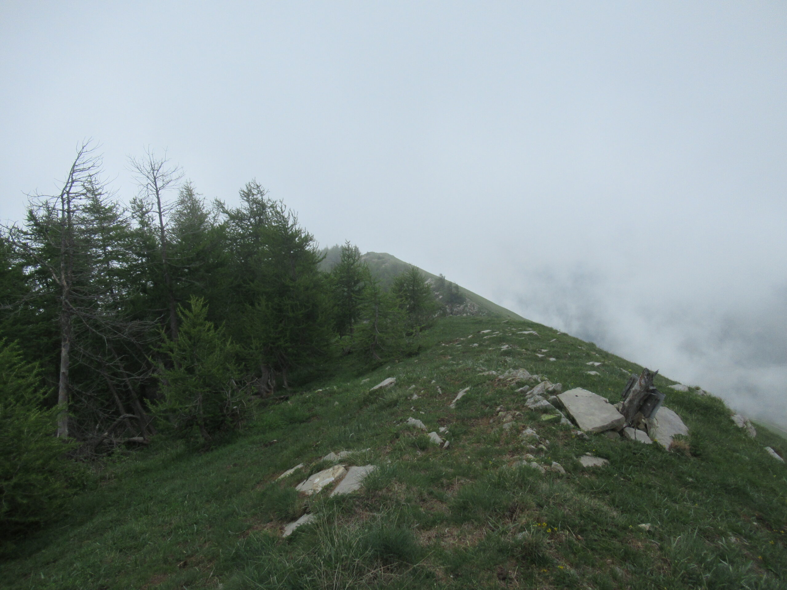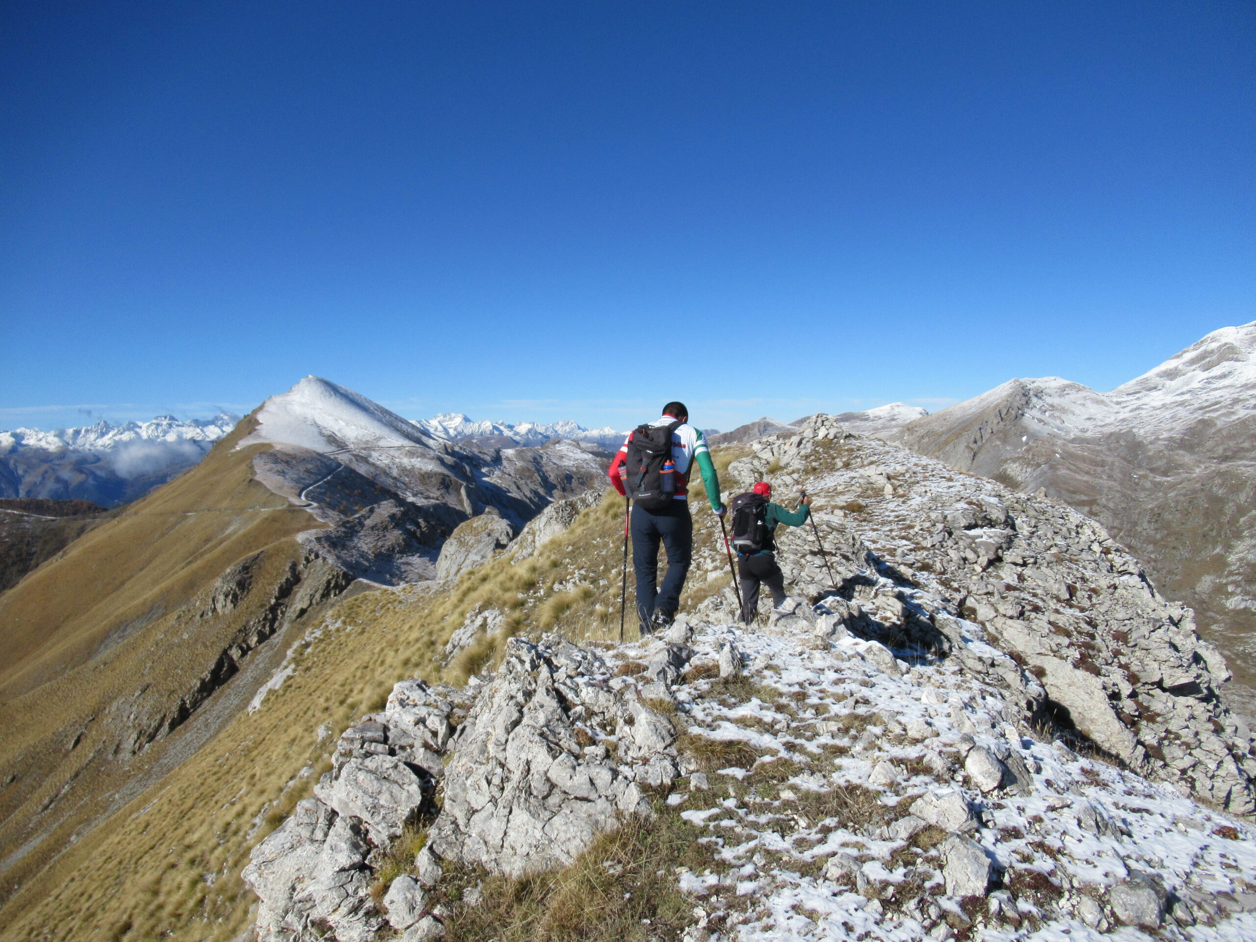 Da qui si prosegue presso il filo tra alcuni sali e scendi, arrivando al grande ripiano erboso e attraversato a tornare in cresta (bolli qua e la) e presso la quale a proseguire arrivando su Rocca del Fera’ (m.2220), quindi percorsa la cengia a nord o in caso di neve passando a sud, si torna in cresta e con breve deviazione a dx si raggiunge Il Fera’ (m.2245), per continuare presso la cresta attraversando la Monesi Limone e a proseguire la salita fino a Cima Pertega’ (m.2404).