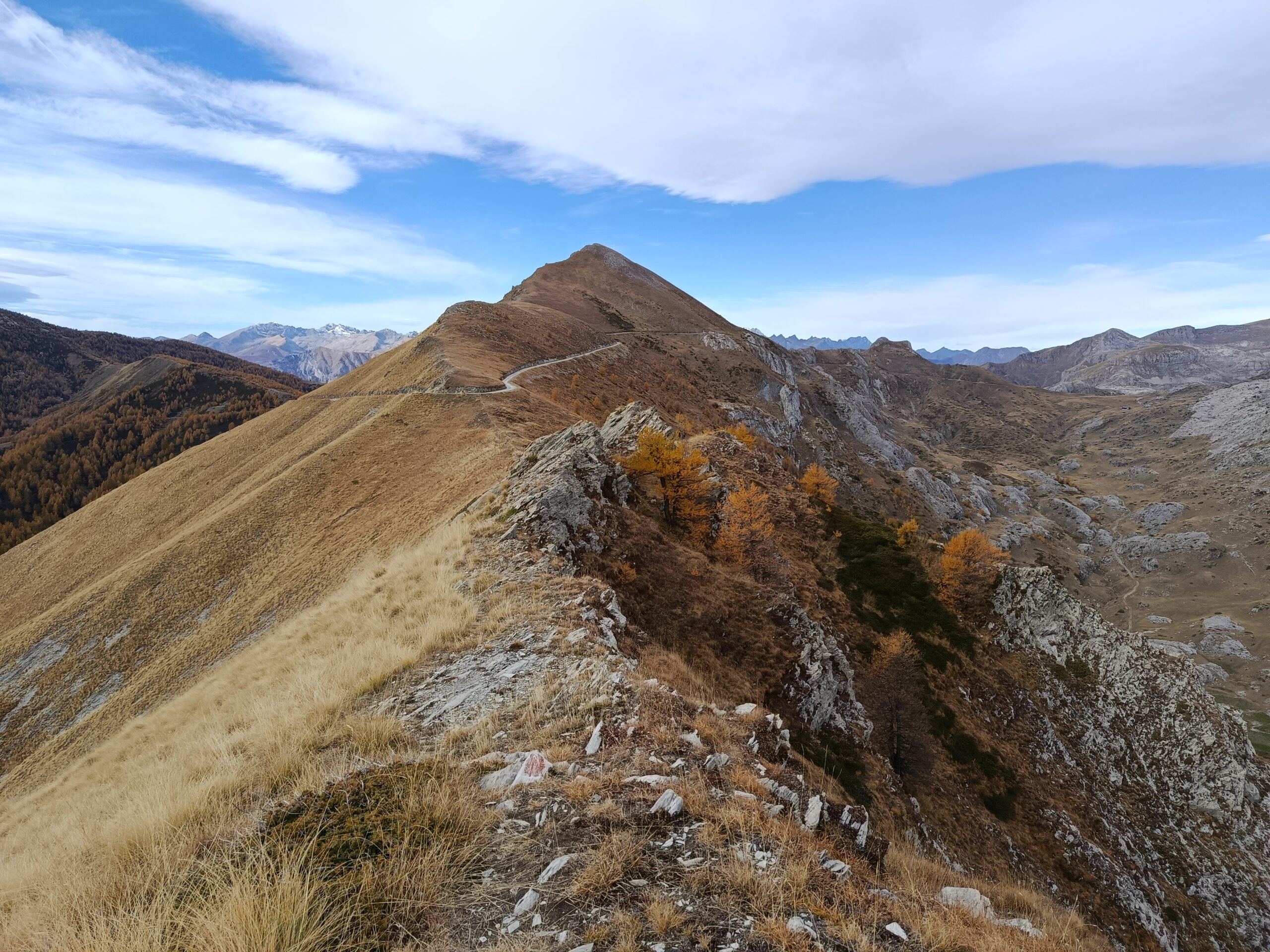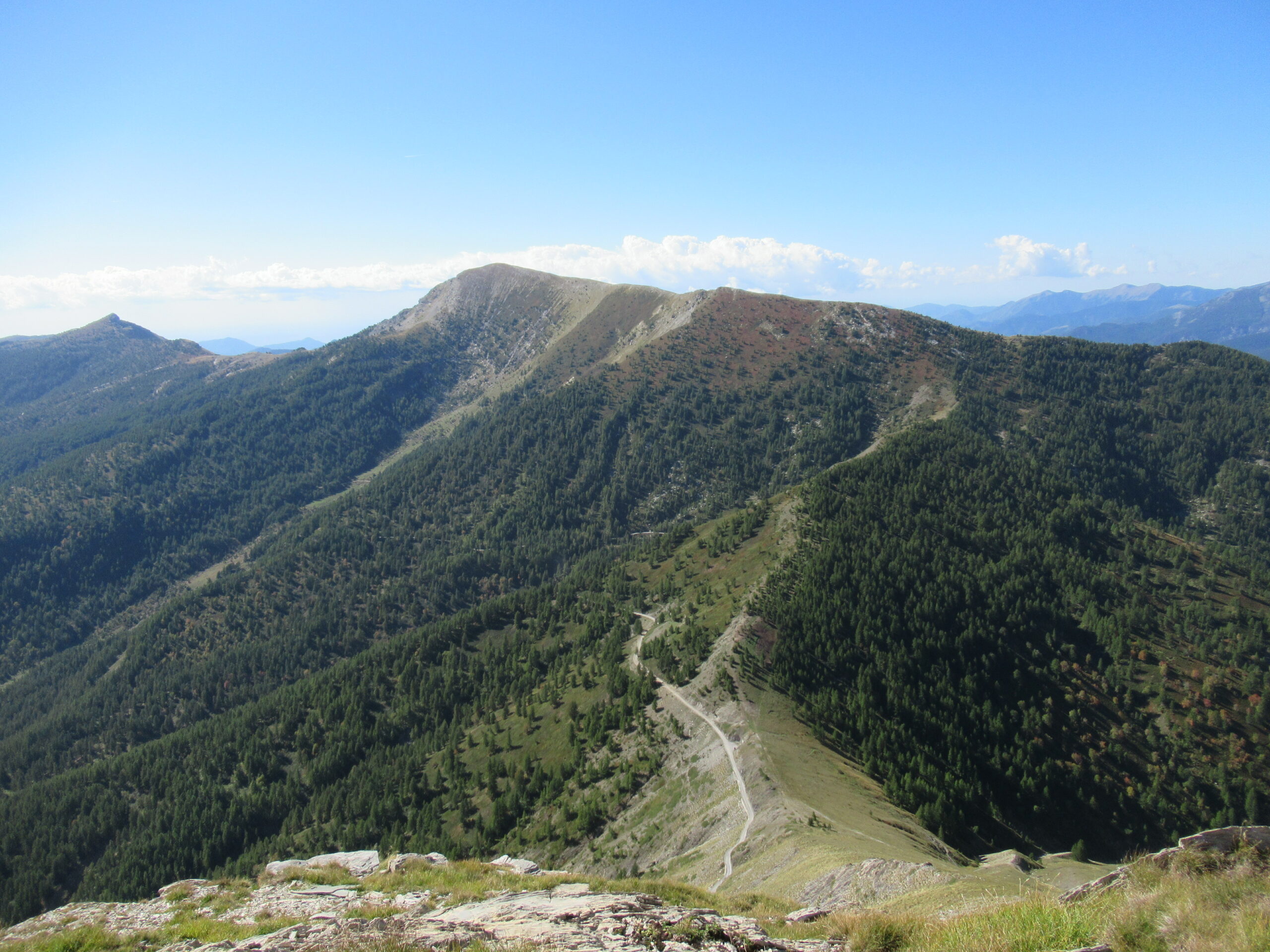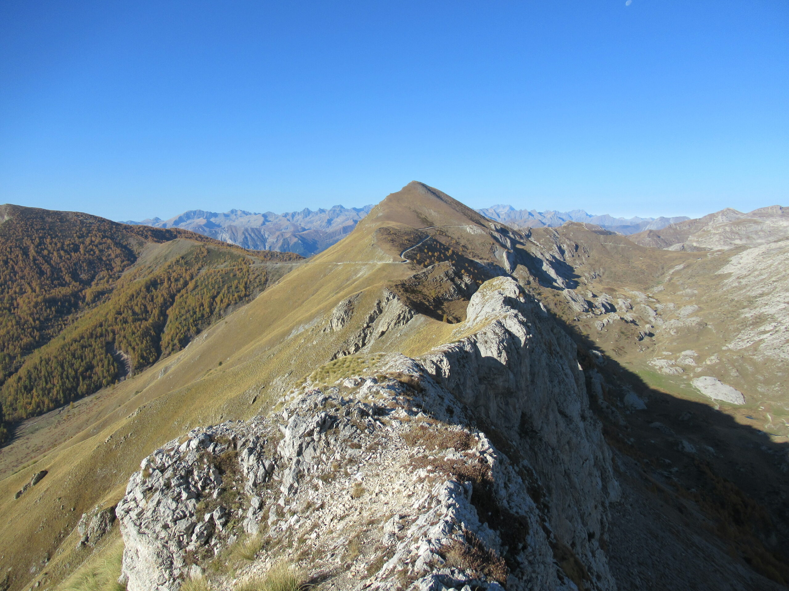 Si scende il ripido pendio sud fino al Colle Selle Vecchie (m.2097), dove si prende la bella mulattiera e la si segue per la panoramica dorsale fino ad arrivare in vetta al Monte Bertrand (m.2480).