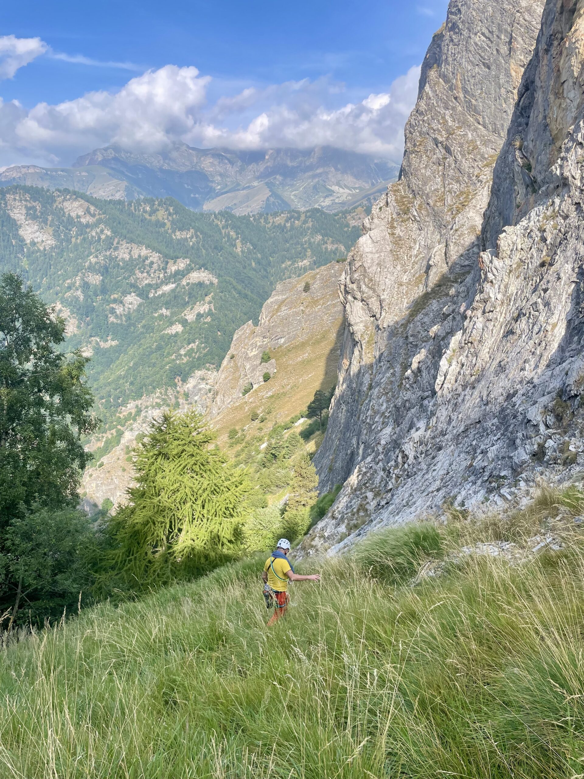 DISCESA: dall’ultima sosta salire di pochi metri e ci si ritrova sul prato inclinato della parete, con un lungo traverso verso sinistra (faccia a valle) si attraversa su debole traccia sino ad arrivare sin sotto il parcheggio dove si è lasciata l’auto. (15 minuti)