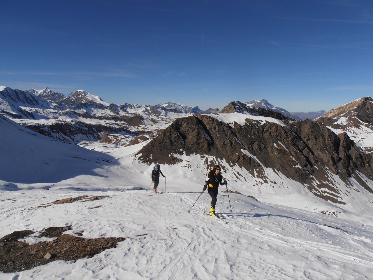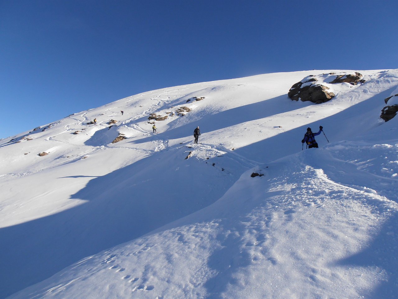 Al ritorno si rimettono le pelli nel pianoro e si risale al colletto e per rendere la gita più divertente dal punto di vista sciistico si può risalire fino alla vicina tretetes 2948 m sulla dx e scendere fino alle auto.