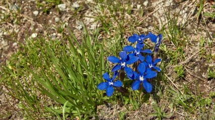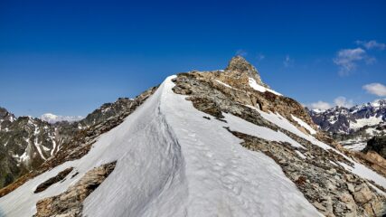 Sopra è tutto dritto su un buon sentiero, con ancora alcune lastre di neve dura sotto la cima che ci costringe a mettere i piccoli ramponi per una maggiore sicurezza.