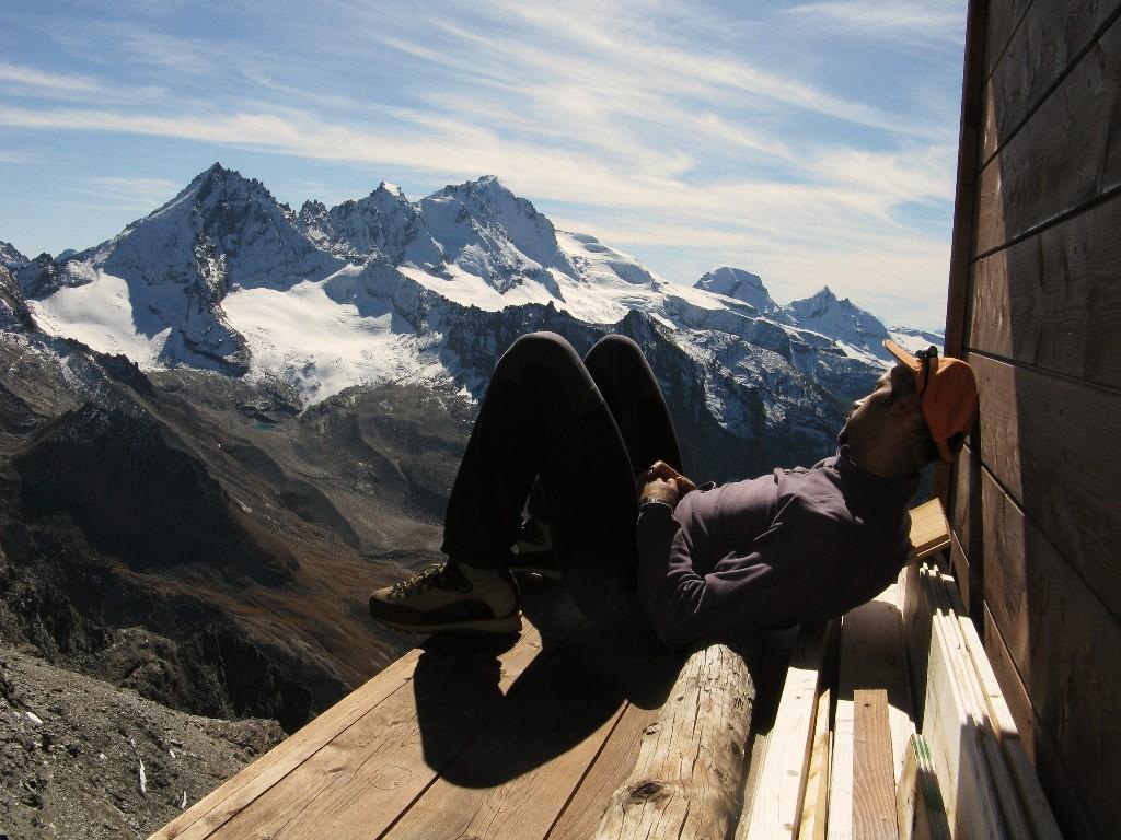Gran bel gitone.Partiti per andare a vedere il nuovo bivacco costruito questa estate sulla cresta N-O della Punta Bianca che di per se’ e’ gia’ una bella sfacchinata.Il bivacco sorge un uno spalto panoramico meraviglioso.Dal bivacco io e danilo abbiamo deciso di risalire il torrione dietro il bivacco per fare delle foto e una volta in cima abbiamo deciso di raggiungere la Punta Bianca che dal bivacco e 500mt piu’in su comunque in 45min in vetta.Discesa lunga e da non sottovalutare fin che non si esce dalla pietraia.